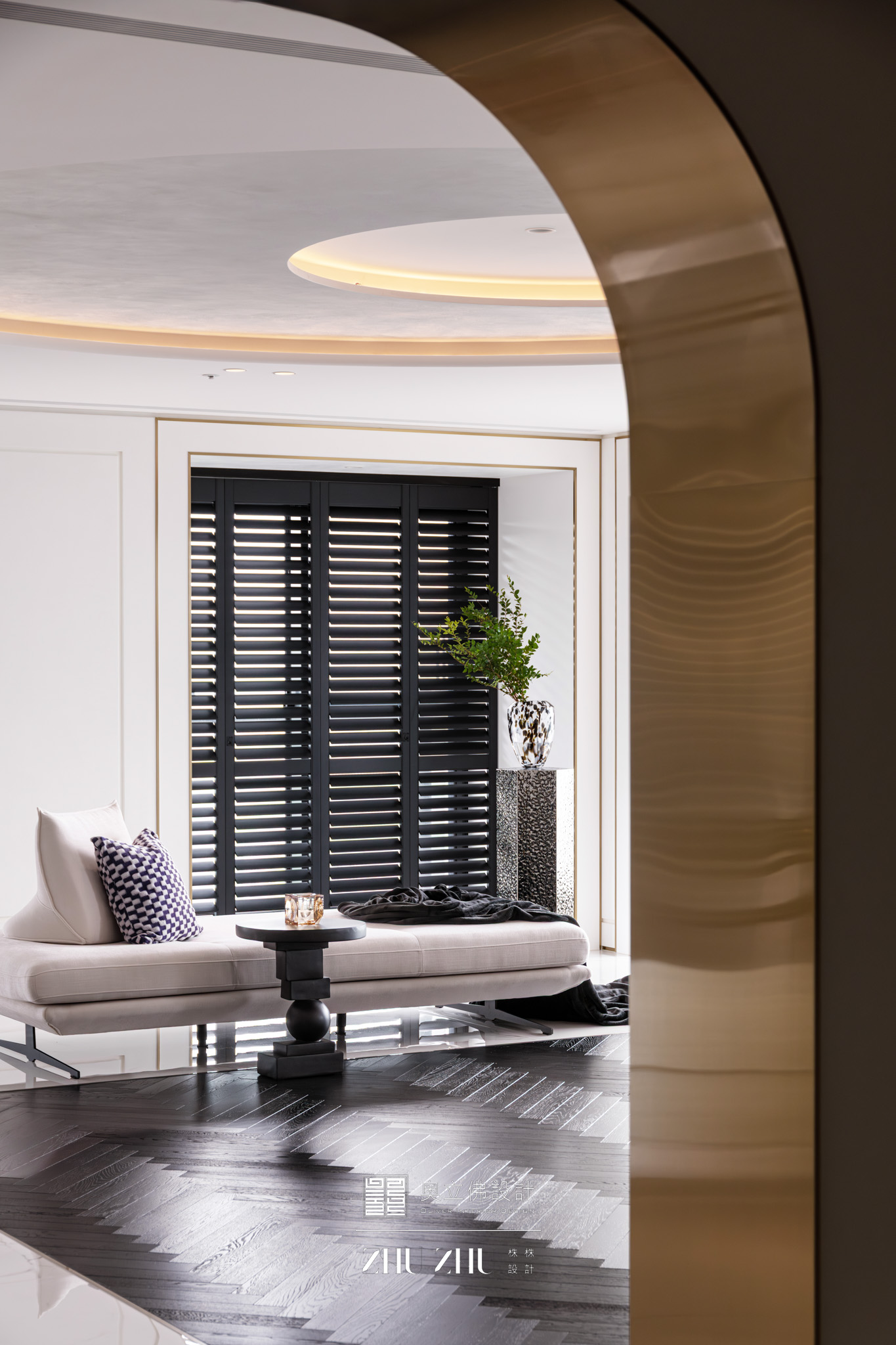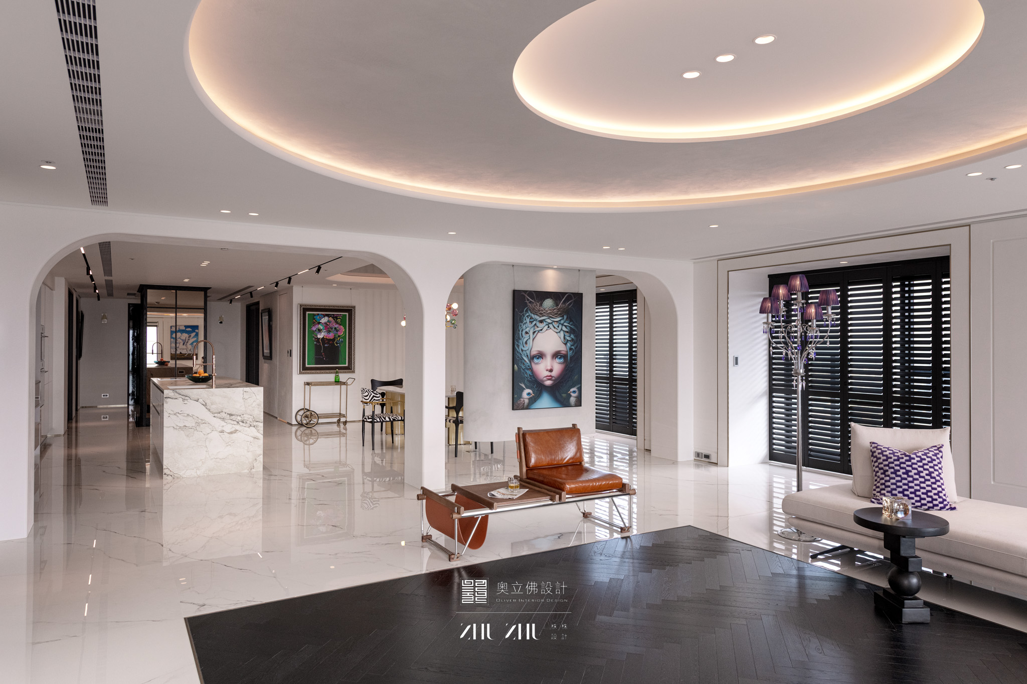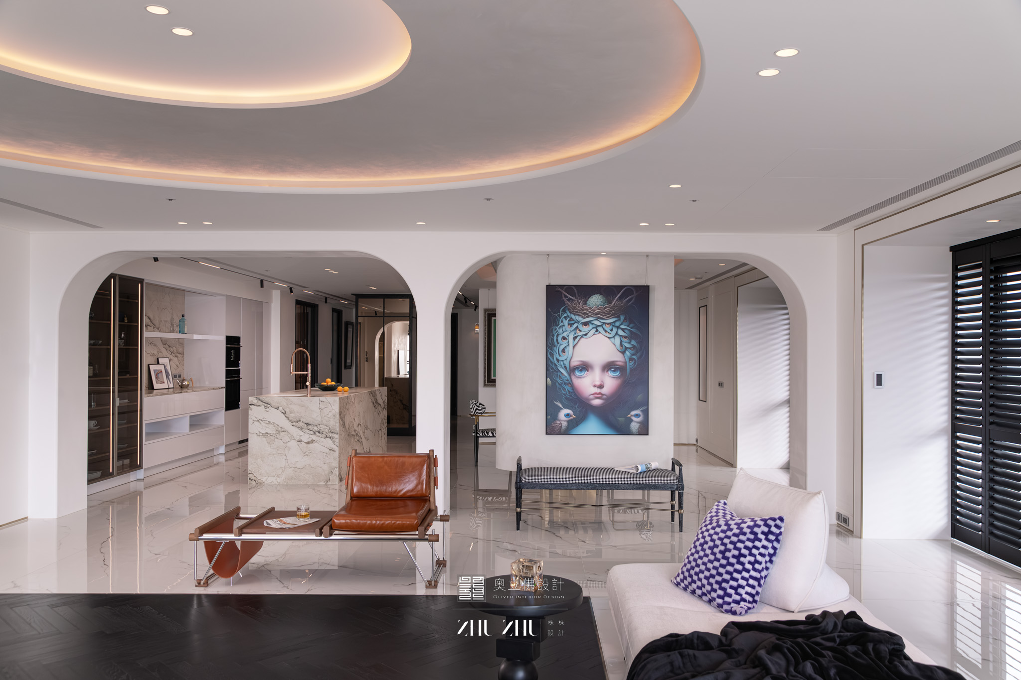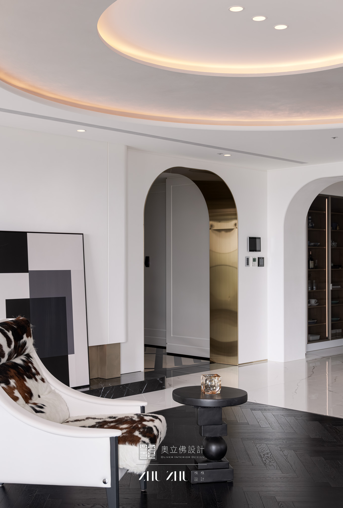 以弧形拱門串聯公共區域,利用圓弧柔化了現代空間的菱角,也讓視線自然流動,形成具通透性與雕塑感的空間骨架,同時帶有新古典與未來感。圓形燈槽形成環狀光暈,讓室內多了柔和的天光感,也提升空間的儀式性與辨識度。 -