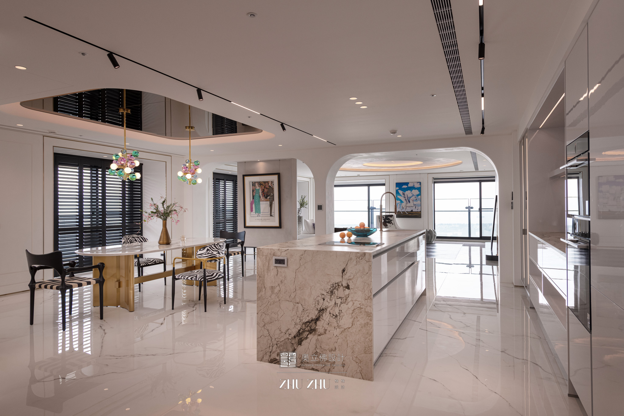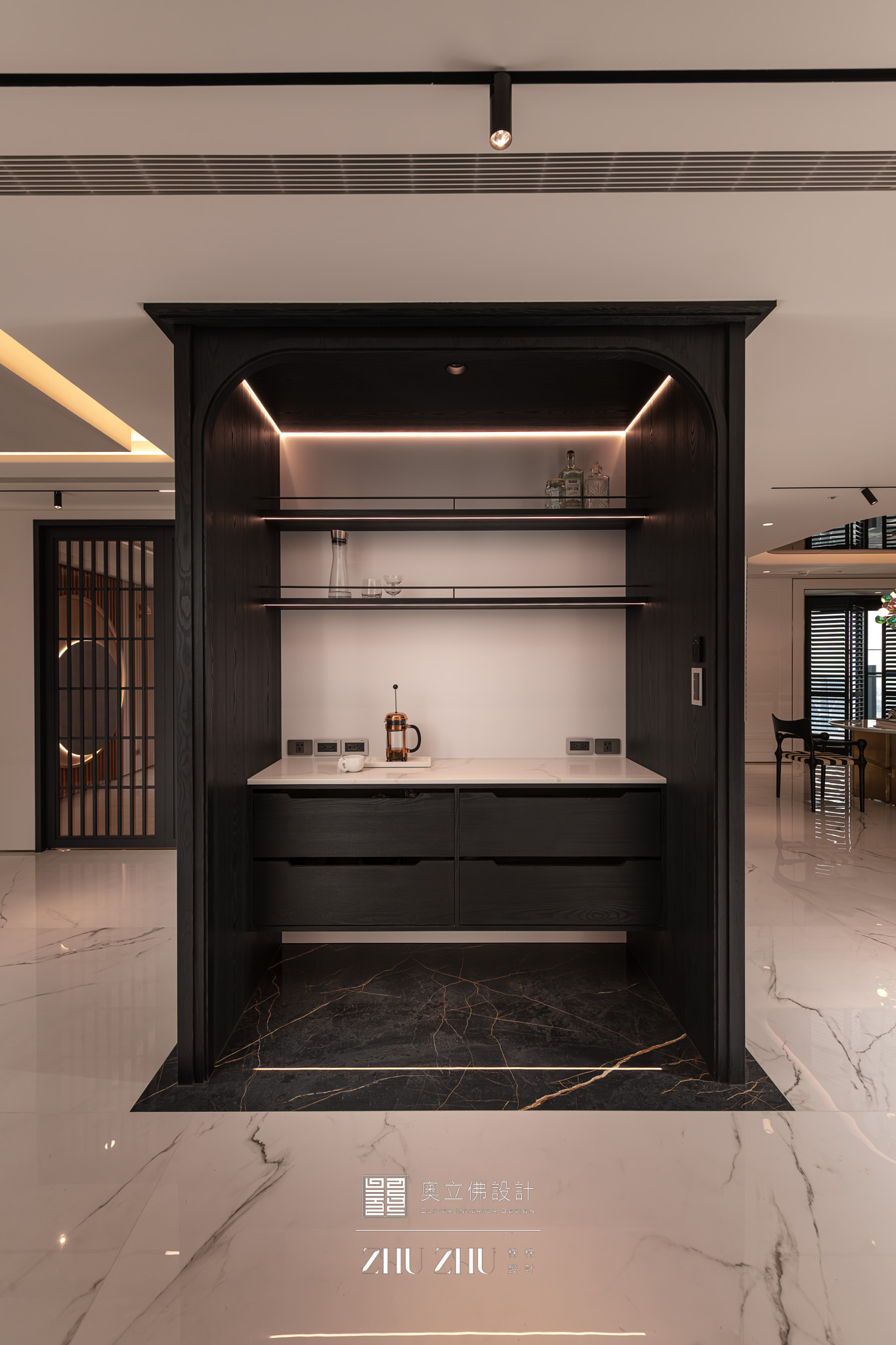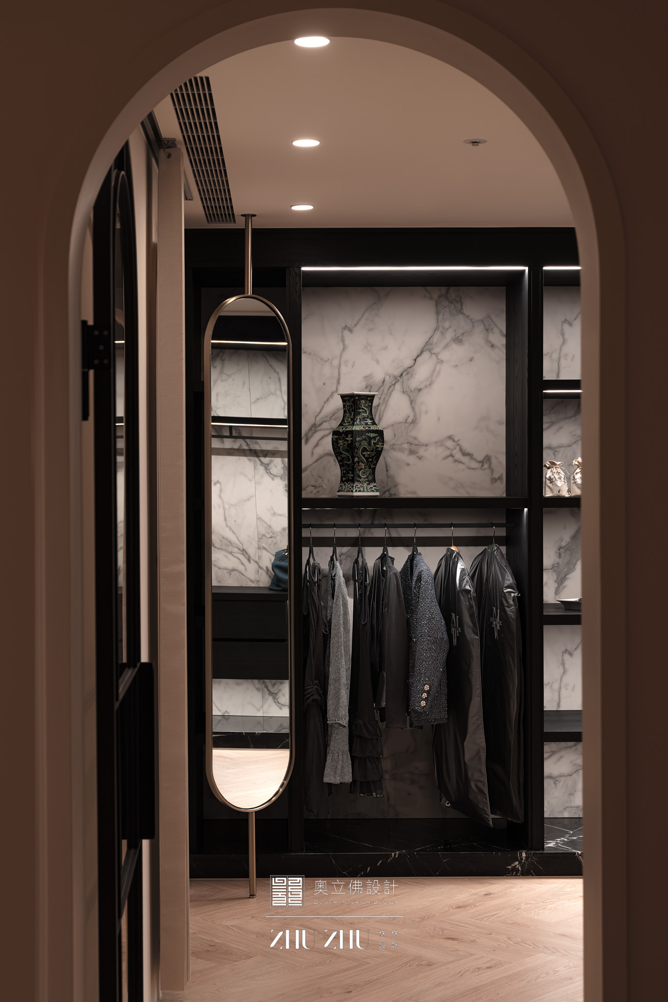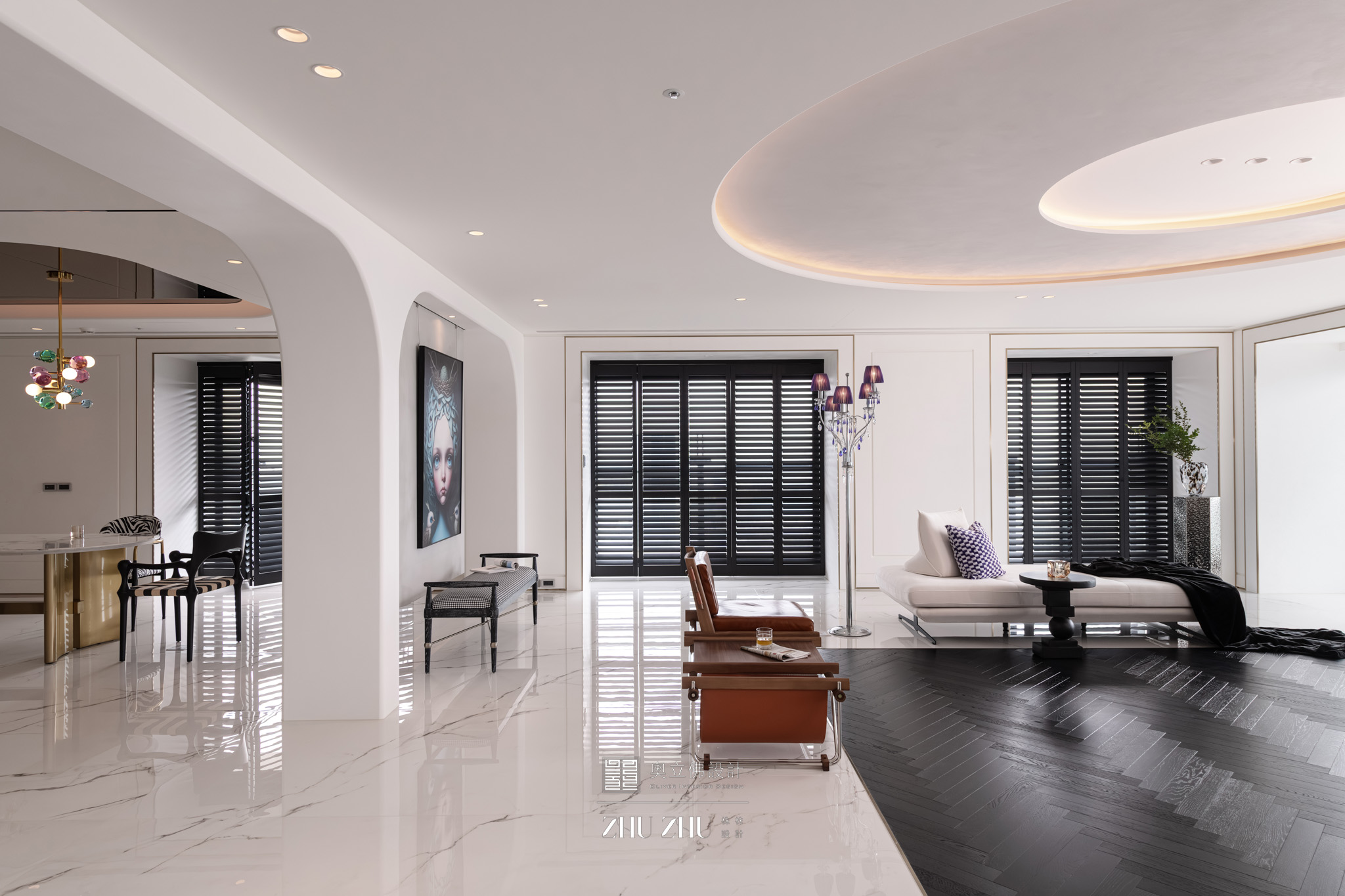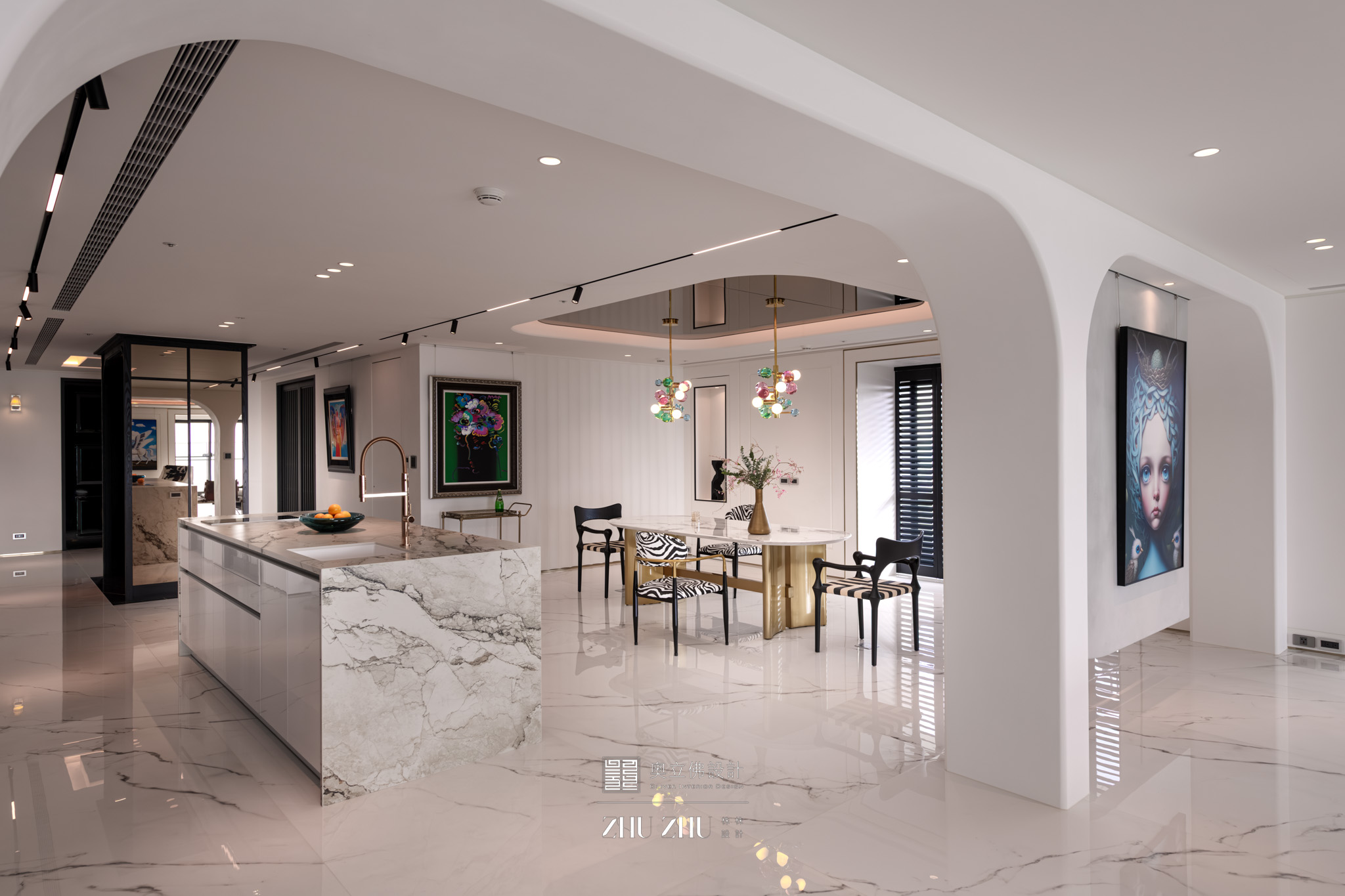 以弧形拱門串聯公共區域,利用圓弧柔化了現代空間的菱角,也讓視線自然流動,形成具通透性與雕塑感的空間骨架,同時帶有新古典與未來感。圓形燈槽形成環狀光暈,讓室內多了柔和的天光感,也提升空間的儀式性與辨識度。 -
