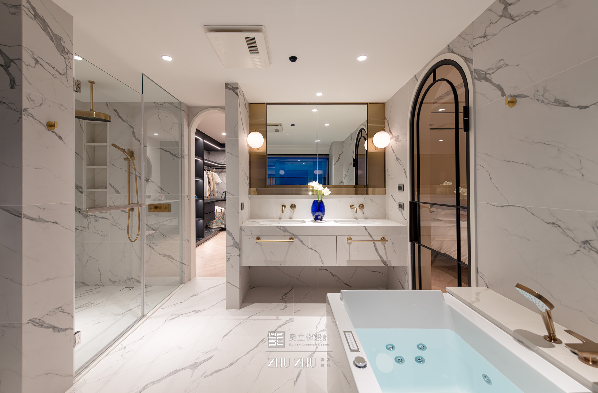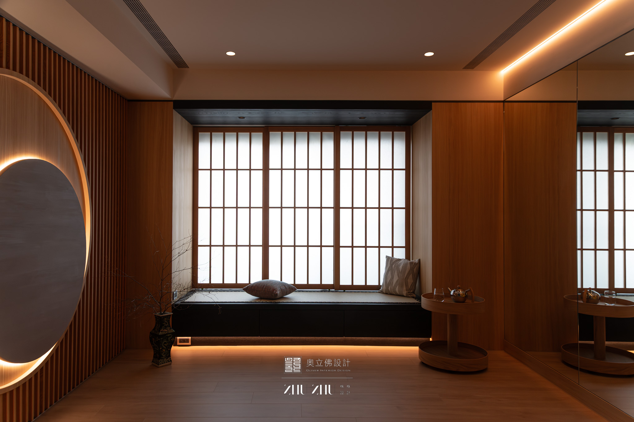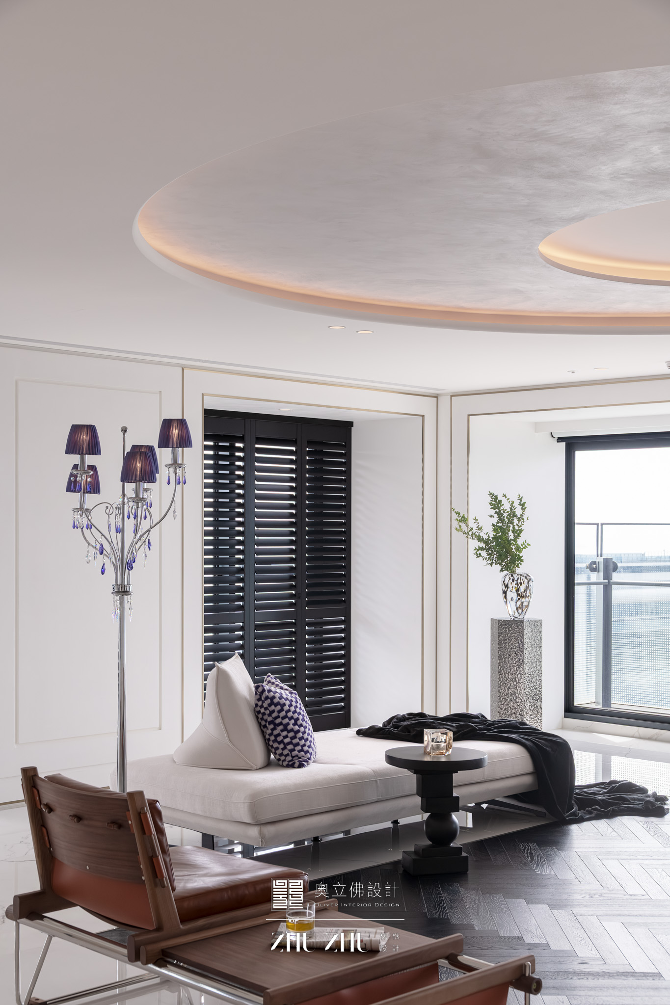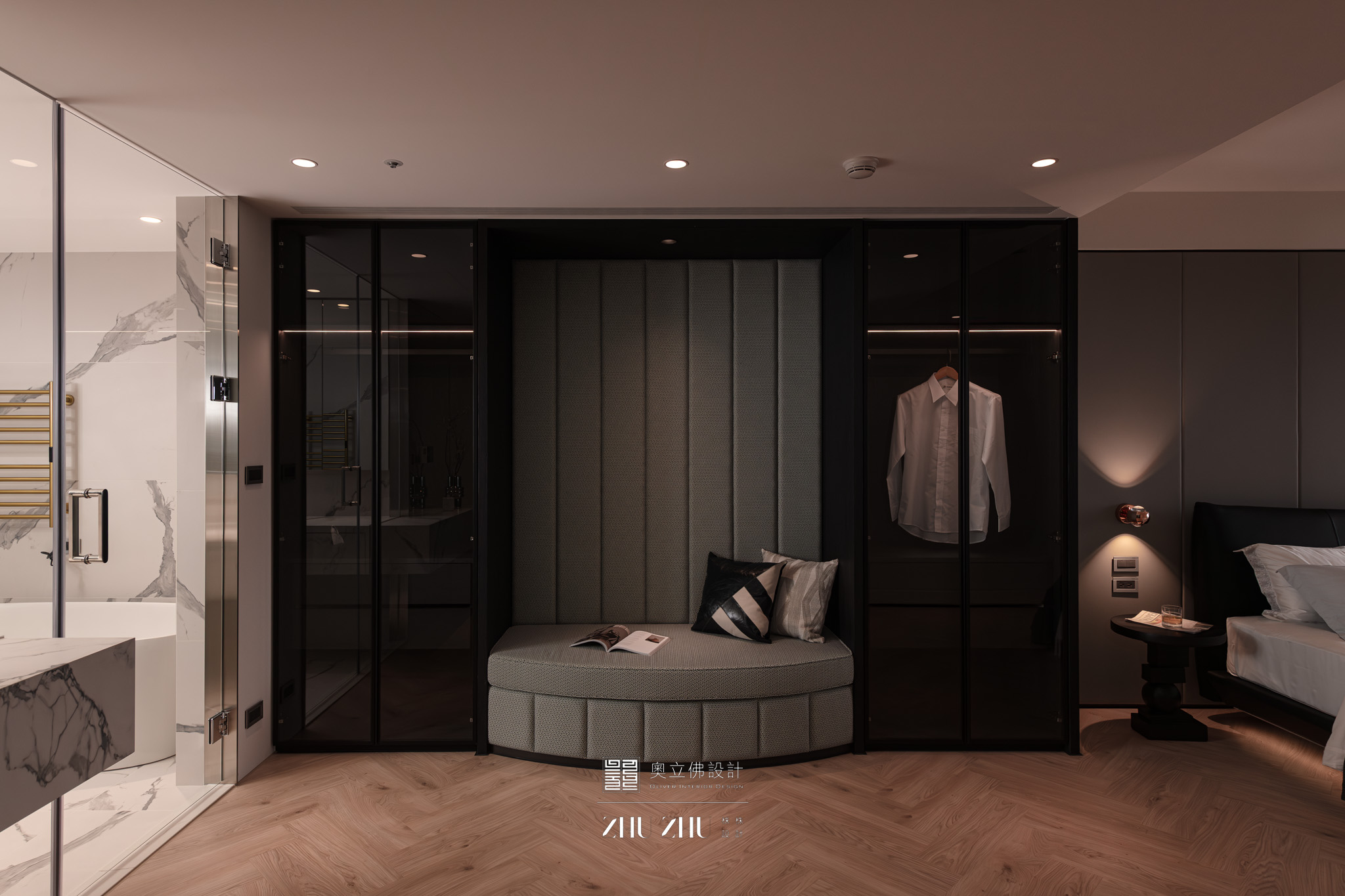 以弧形拱門串聯公共區域,利用圓弧柔化了現代空間的菱角,也讓視線自然流動,形成具通透性與雕塑感的空間骨架,同時帶有新古典與未來感。圓形燈槽形成環狀光暈,讓室內多了柔和的天光感,也提升空間的儀式性與辨識度。 -