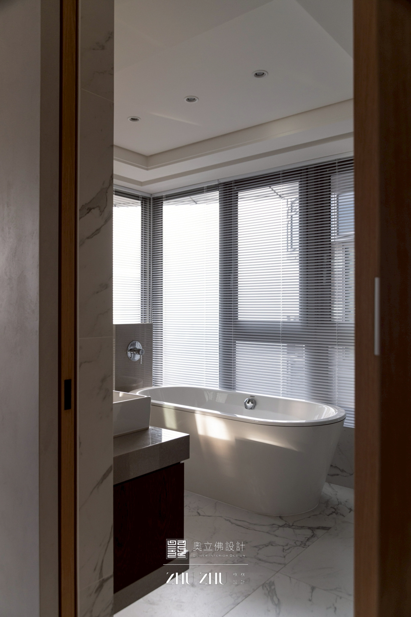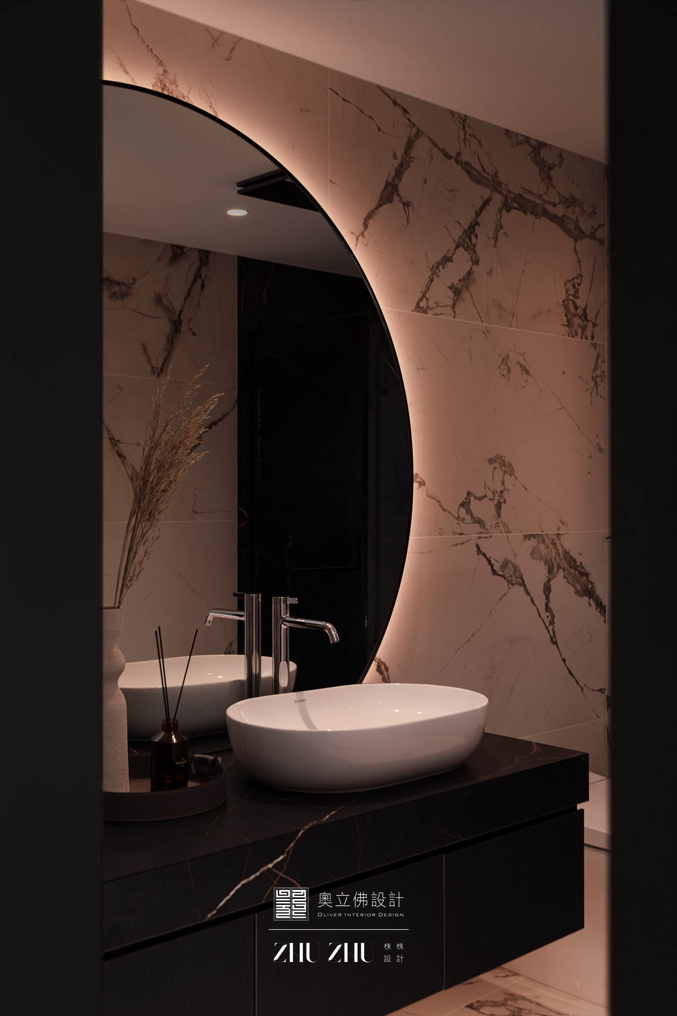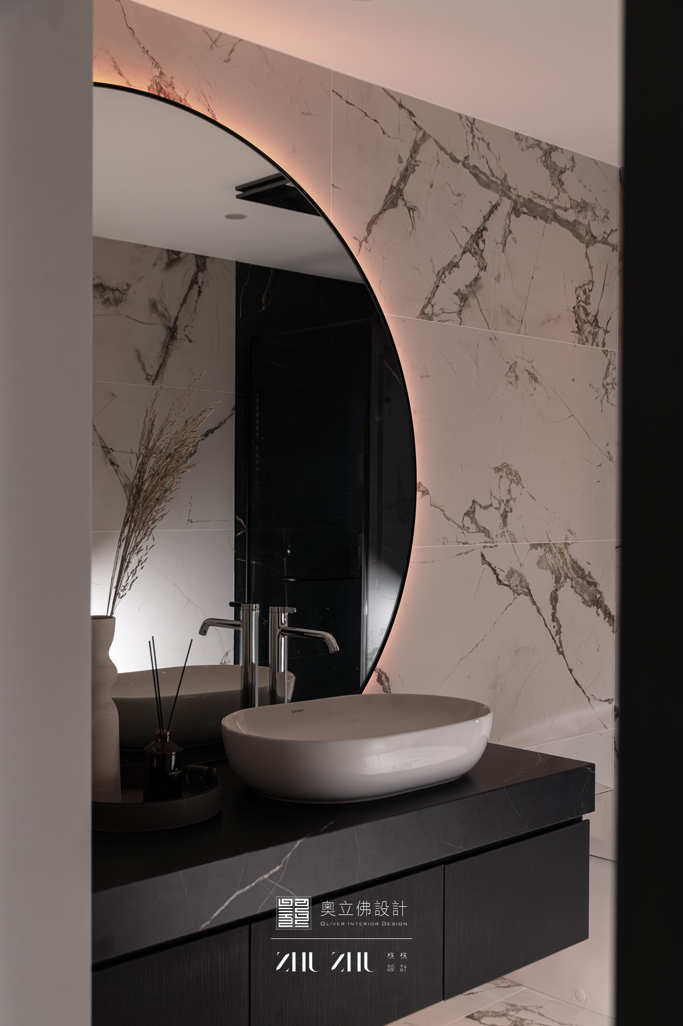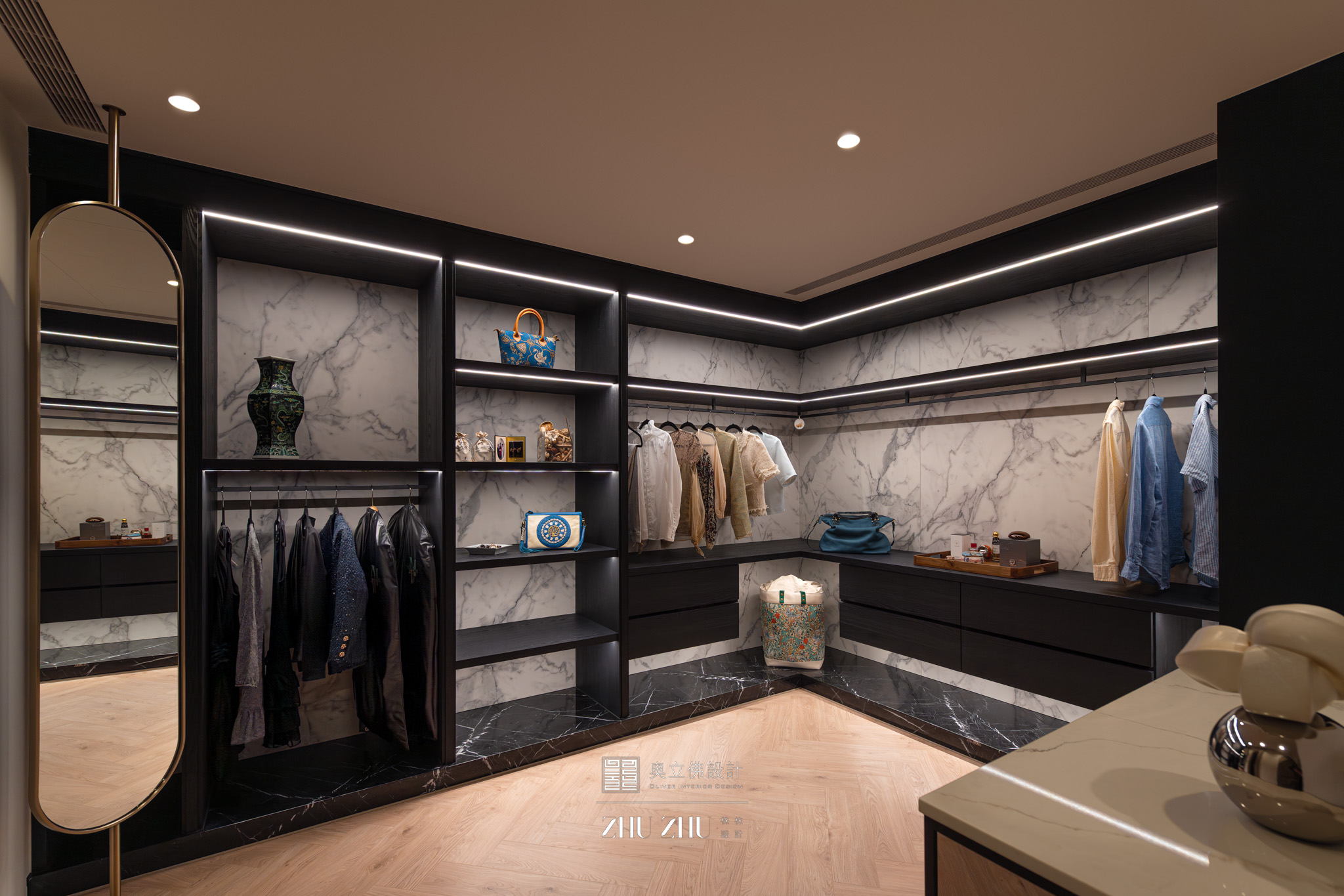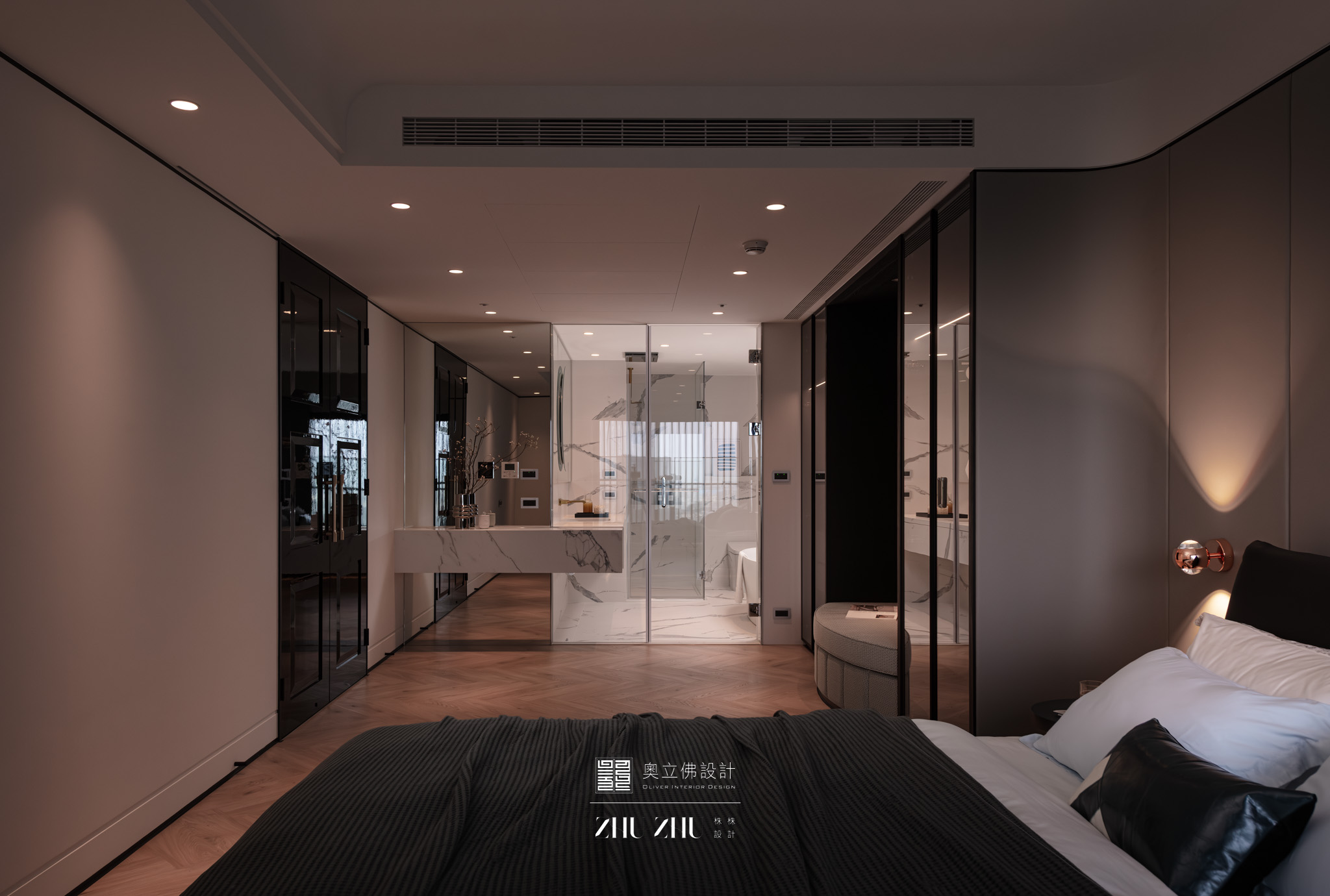 以弧形拱門串聯公共區域,利用圓弧柔化了現代空間的菱角,也讓視線自然流動,形成具通透性與雕塑感的空間骨架,同時帶有新古典與未來感。圓形燈槽形成環狀光暈,讓室內多了柔和的天光感,也提升空間的儀式性與辨識度。 -