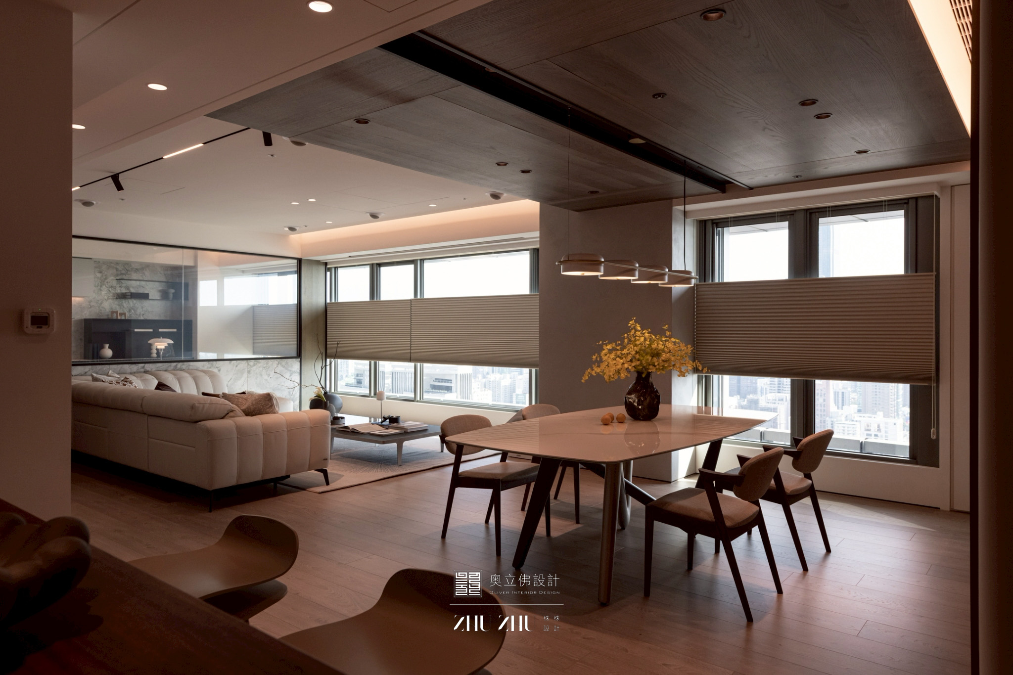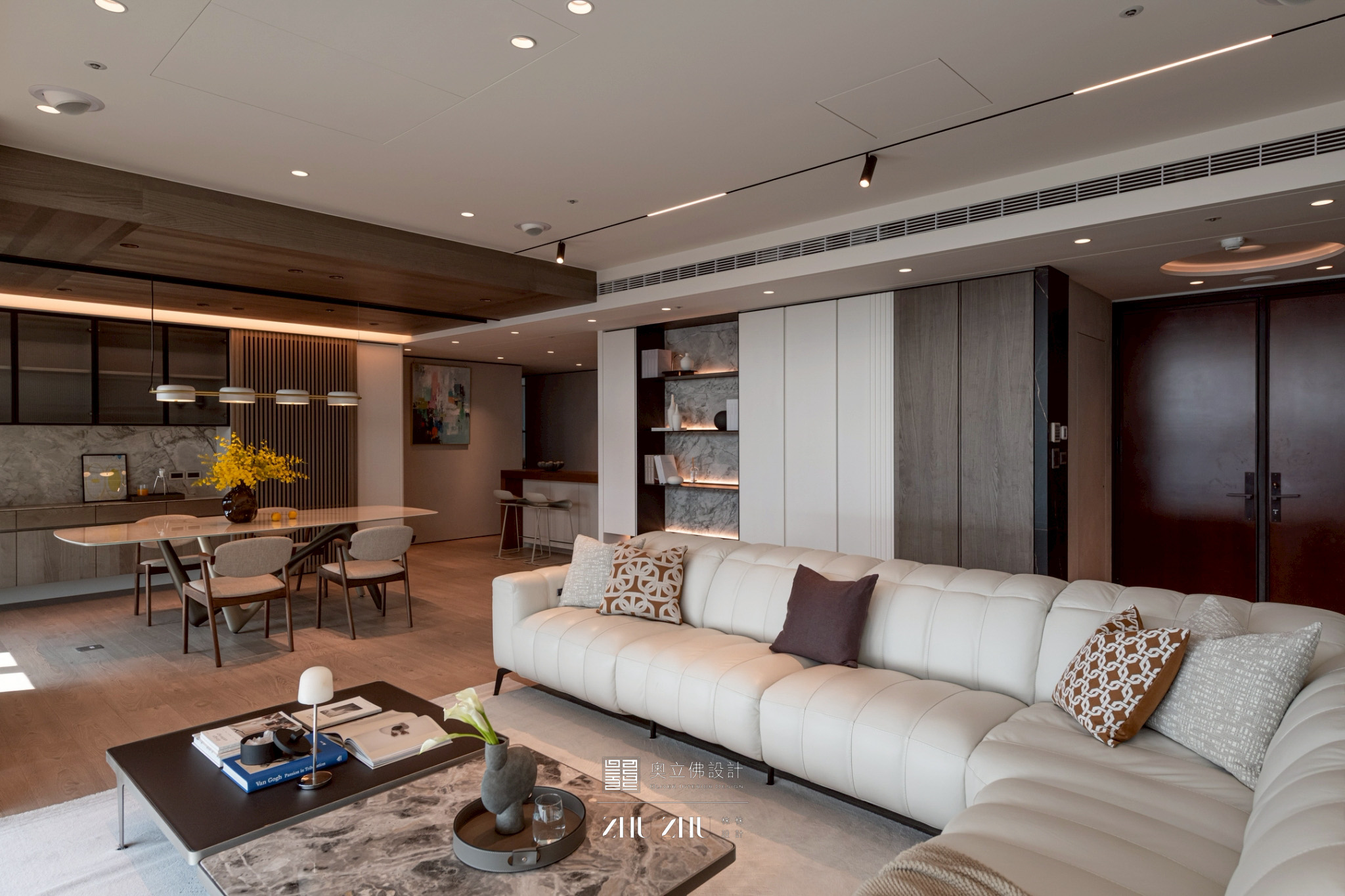 空间布局:跳脫以往的傳統區隔,客廳、餐廳與輕食區形成一個連續的動線帶。