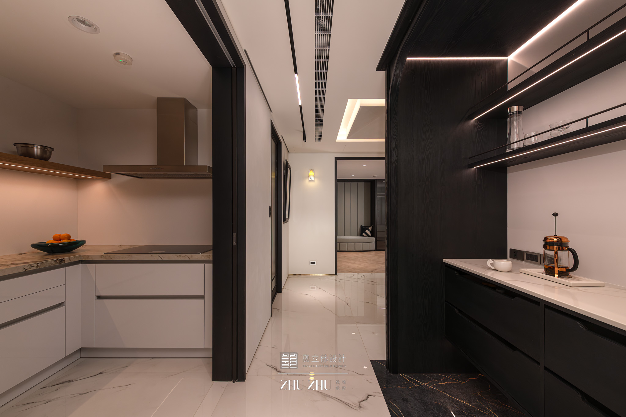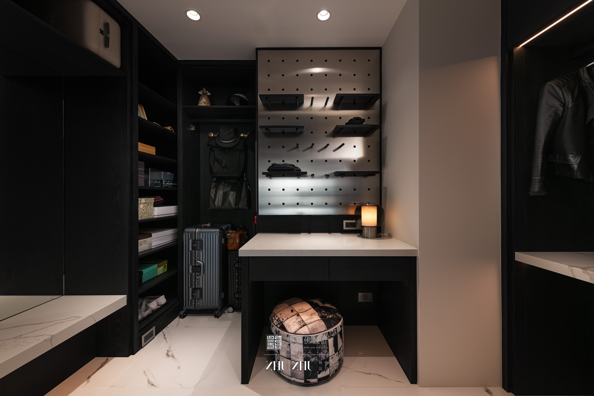 空间意境:玄關的黑白幾何地坪搭配天花板的黑線幾何框構,形成立體呼應,從平面延伸至立面與天花的整合,讓玄關成為整體空間最強烈的象徵入口。