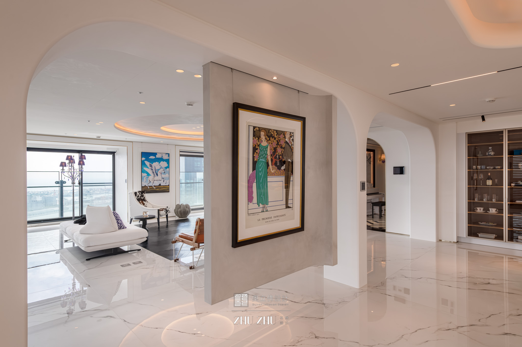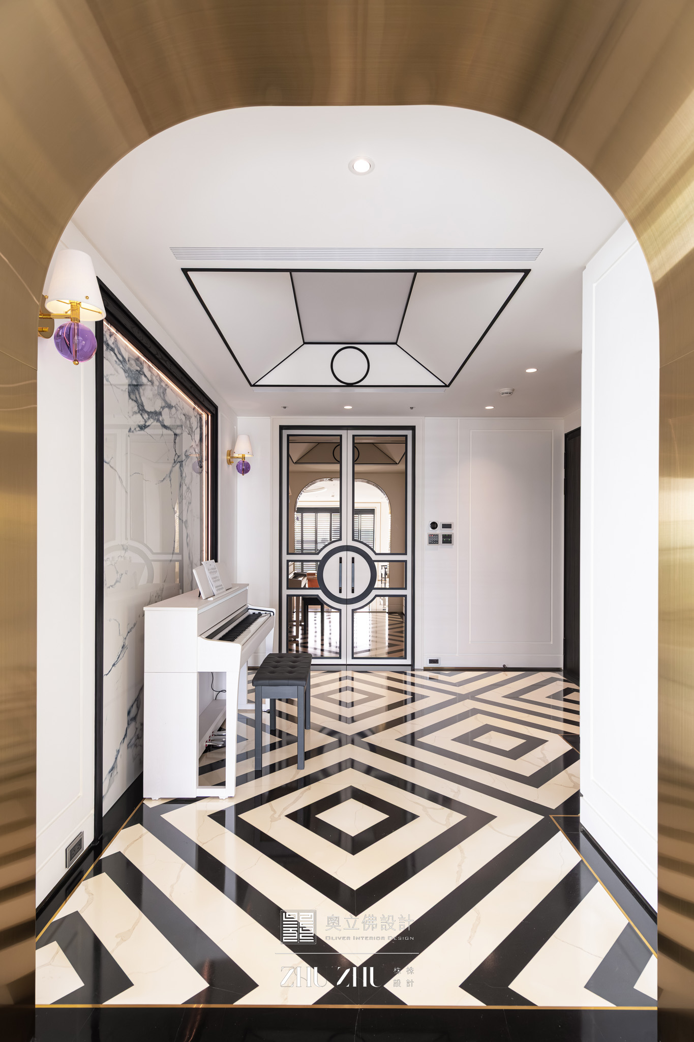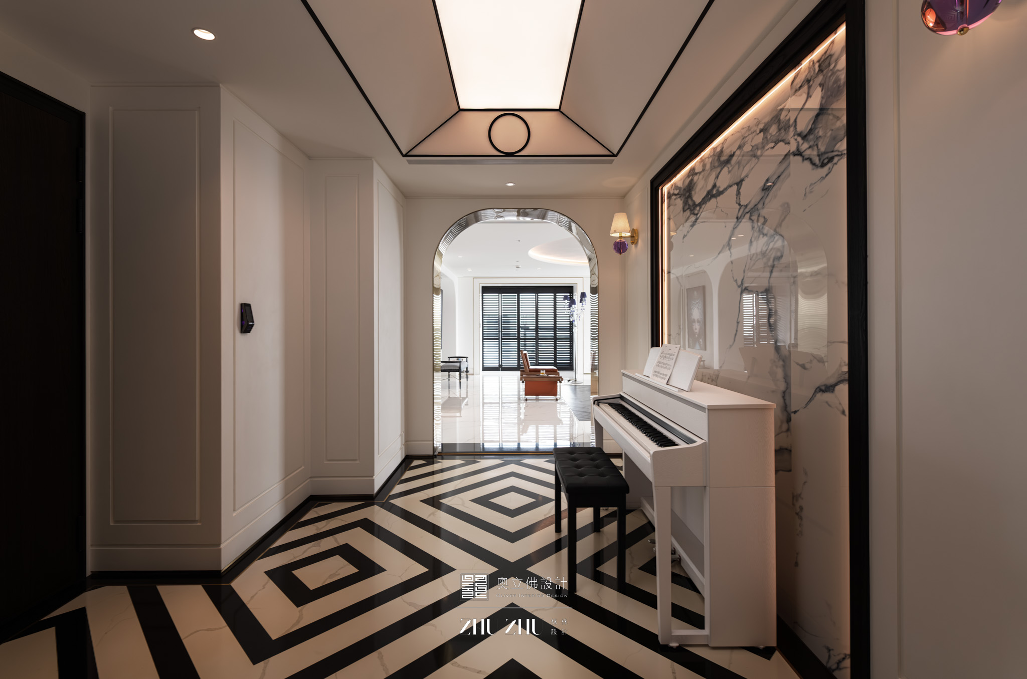 拱門、線條天花、幾何地坪如展覽空間的展場框架,白色鋼琴、藝術畫作、玻璃吊燈則成為空間的展示主角