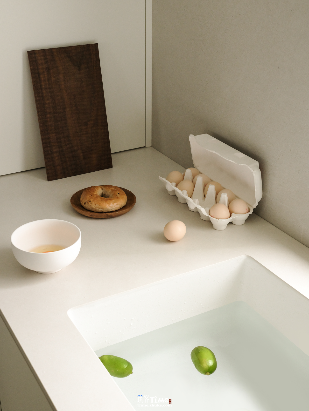 设计选材:厨房是家的味觉实验室,当它彻底向生活敞开,连空气都变得开阔。空间随之拓宽后,花岗岩水池与台面无缝相连,浑然一体的质感里藏着实用巧思。站在这里料理三餐时,抬眼便能撞进窗外南湖的全貌,粼粼的波光与四季的景致,都成了烹饪时最温柔的背景,每一缕烟火气,都与自然的馈赠撞了个满怀。