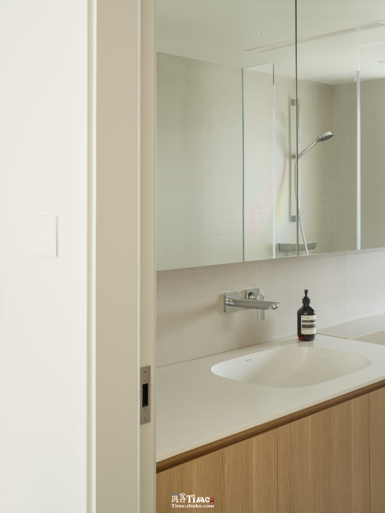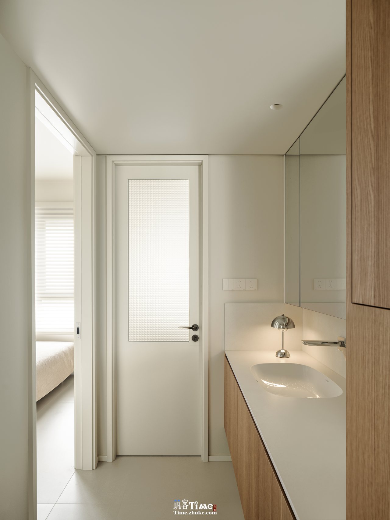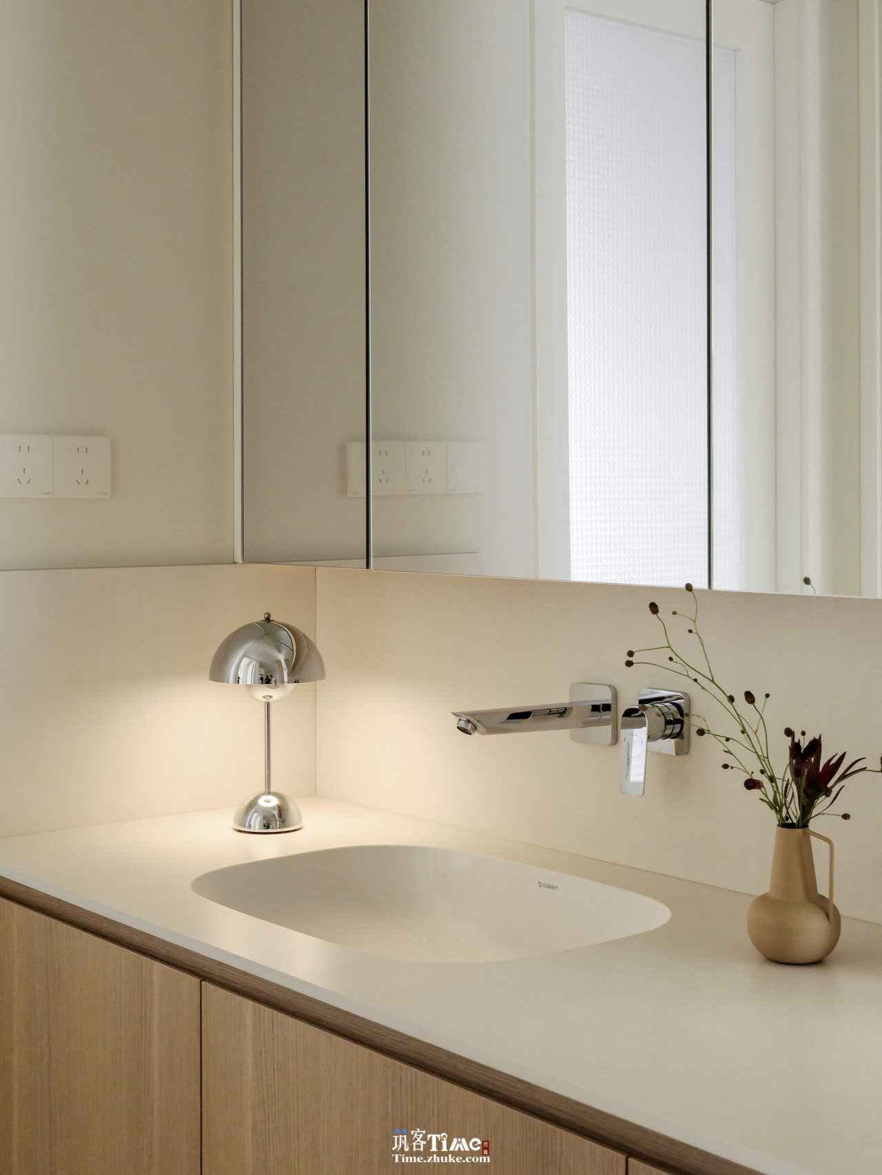 客卫的调整,让洗漱区被彻底独立出来,洗手盆对应的墙面覆满镜子,默默地延展着空间的视觉边界。延伸出来的咖啡吧台对面,成了实用的家政空间,借着主卧房门南移腾出的位置,洗烘区在此安家,构成一个开放又有序的功能角落,让生活的琐碎有了安定的归处,如同风与枝桠的低语,无需刻意,却从未停歇。