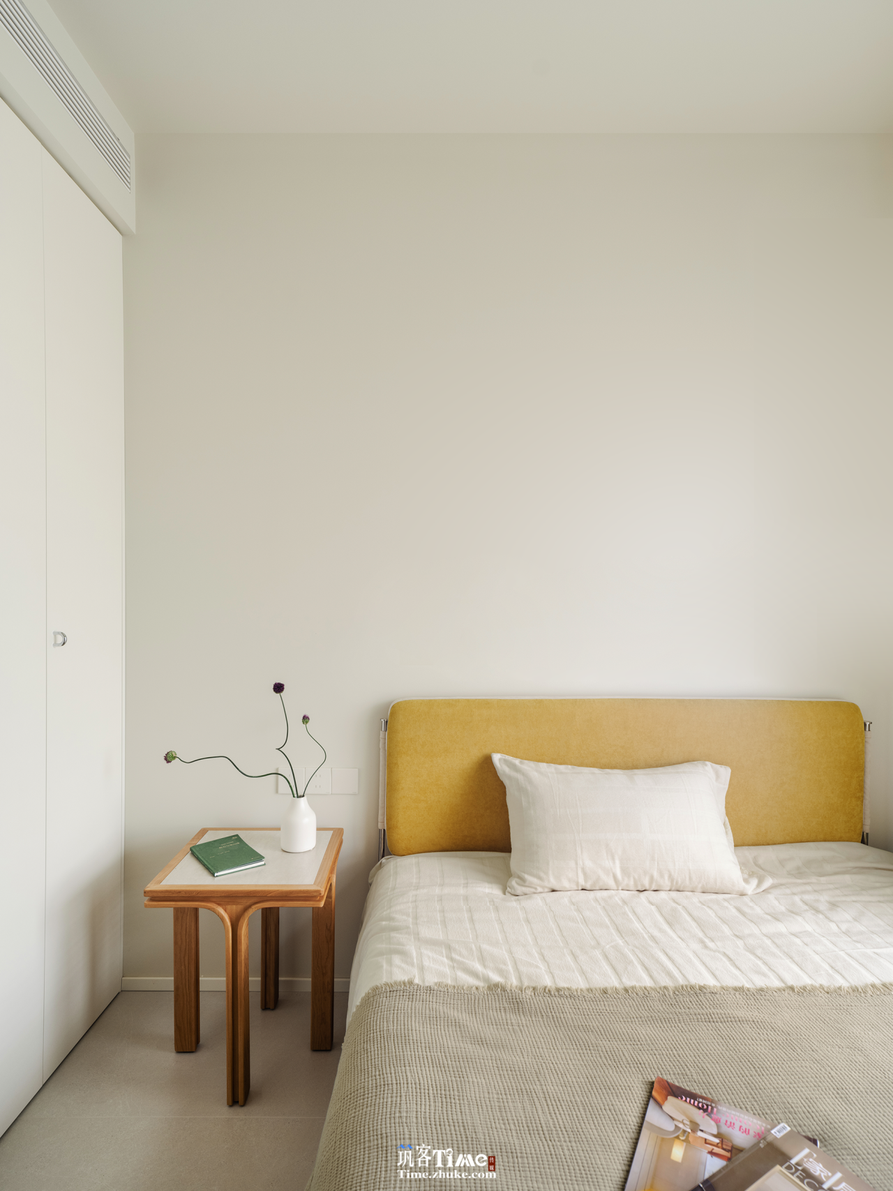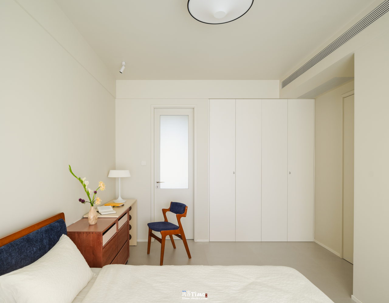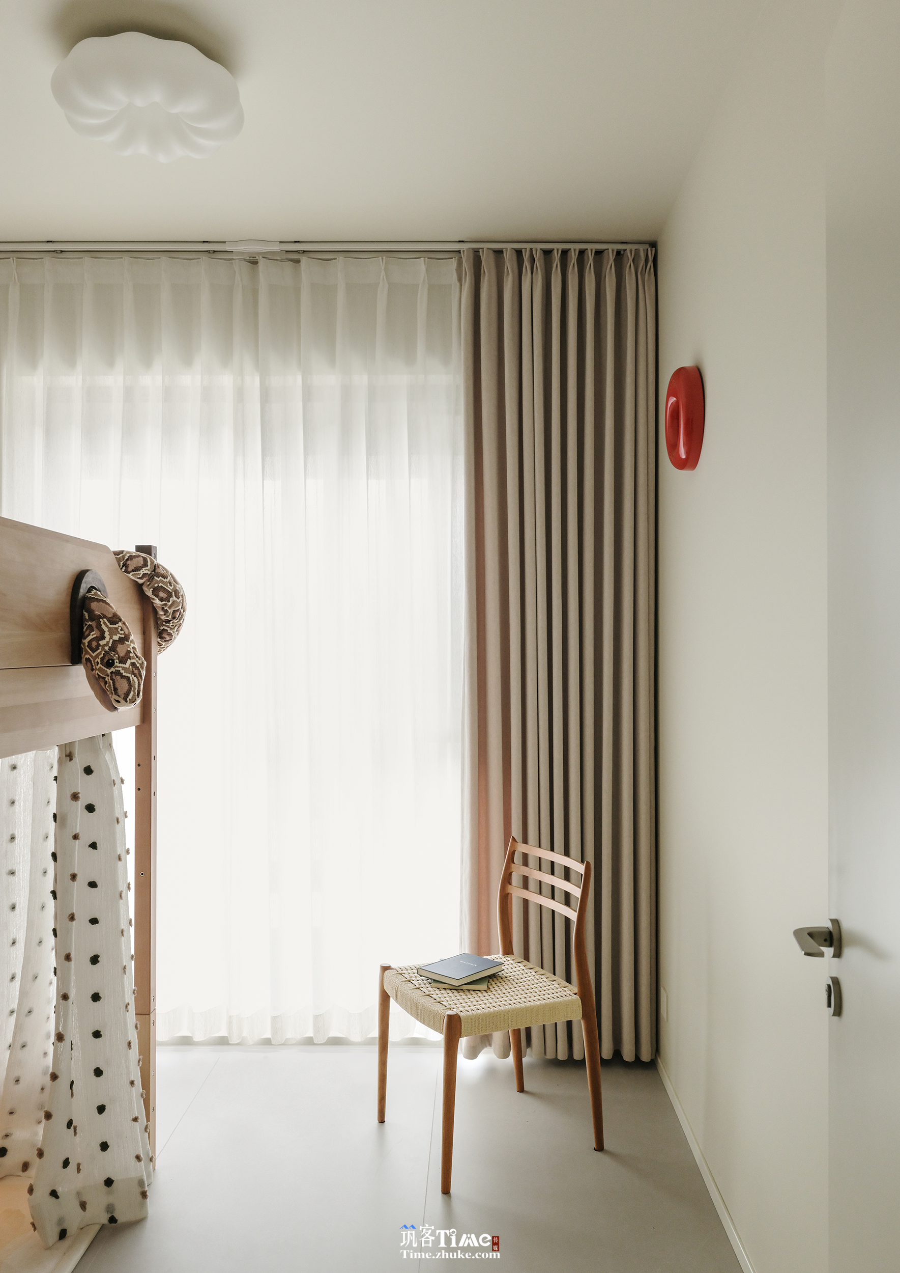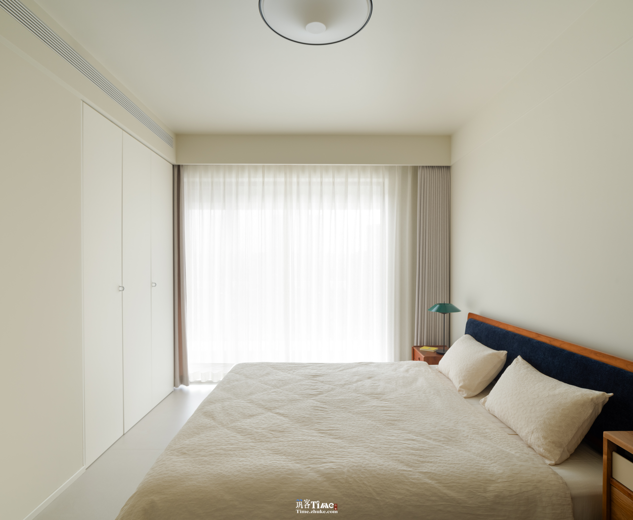 主卧的 “移动”,恰到好处的配合着空间的温柔重构。与儿童房相连的墙体,拆掉非承重部分后,重塑出一道 “凹” 型墙面,儿童房因此有了专属衣柜区域,主卧的柜体也与之以 S 形自然衔接,像是啮合效应,结合的严丝合缝。所有衣柜只定制柜门,内部嵌着金属衣架,既省却多余花费,又透着环保的巧思,空间格局也能随需求自在调整,让空间中的每一处线条的咬合,都形成生活与空间的默契对话。 -