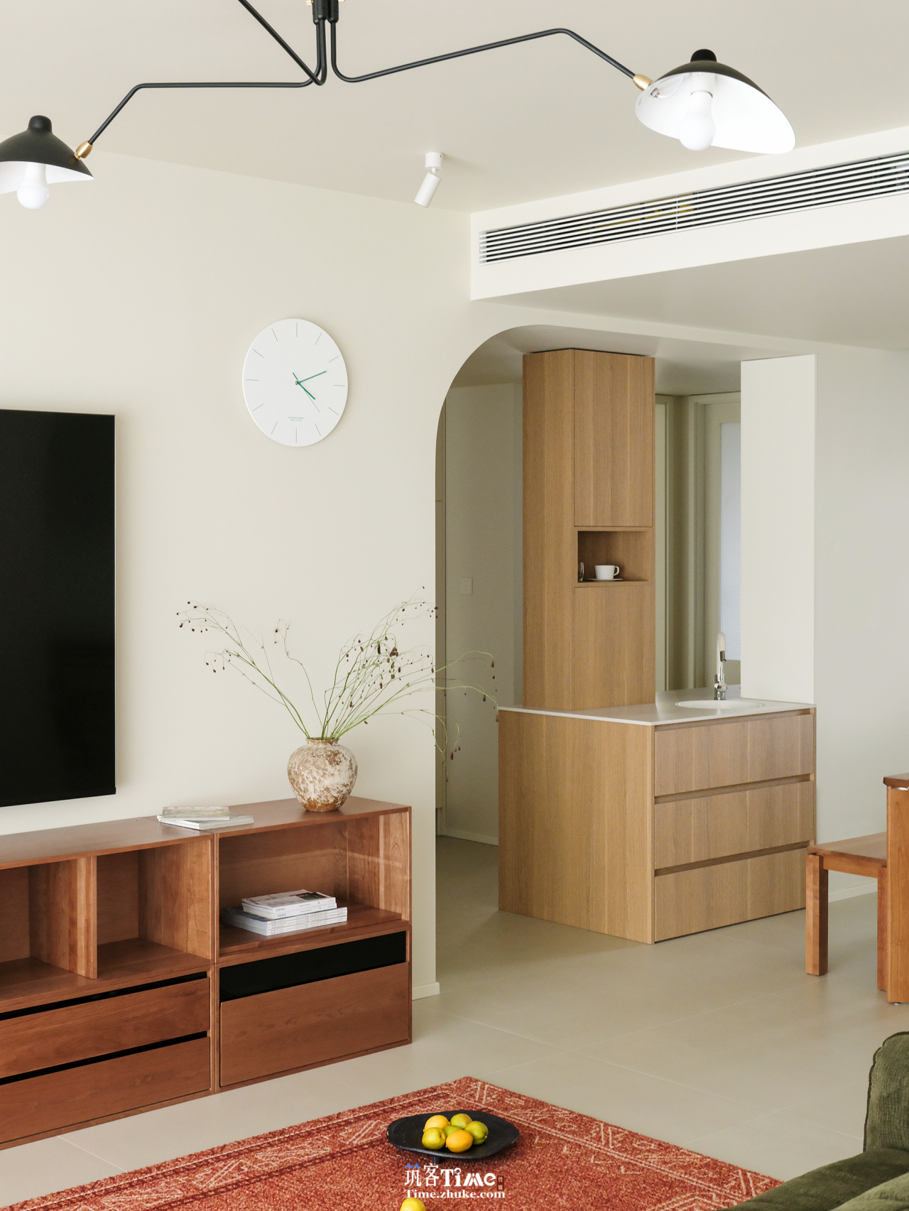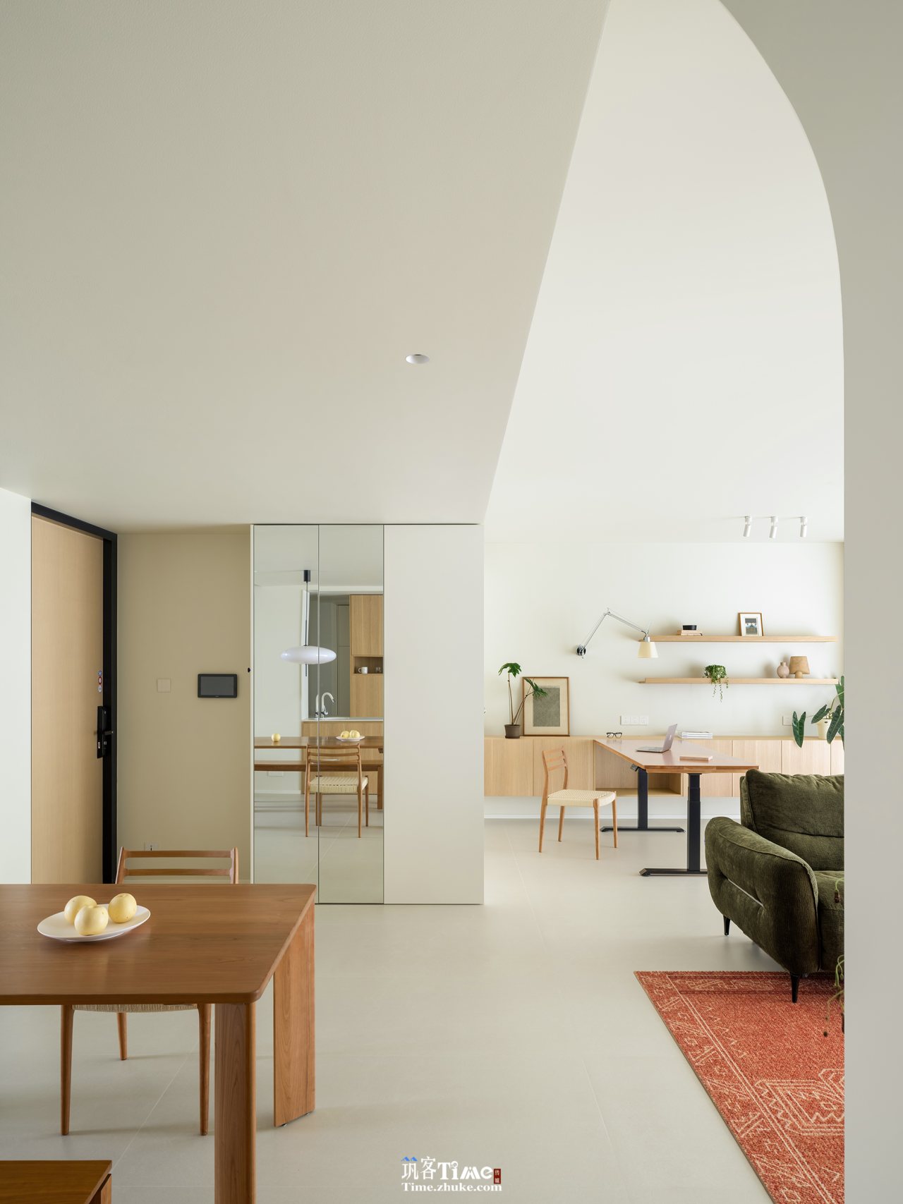 空间布局:家的第一缕温柔,藏在推门即见的通透里。为了这份开阔,设计师拆掉了原本封闭的门厅,散去空间的阻隔,视线便被解开束缚,自在铺展。沿着墙角设置延伸的薄柜,绕至另一面墙与柜体相接,不动声色间拓出充裕的储物区,柜门嵌入镜子,既收纳归家的琐碎,也满足出门前的整饬需求,让每个进出的瞬间都从容妥帖。