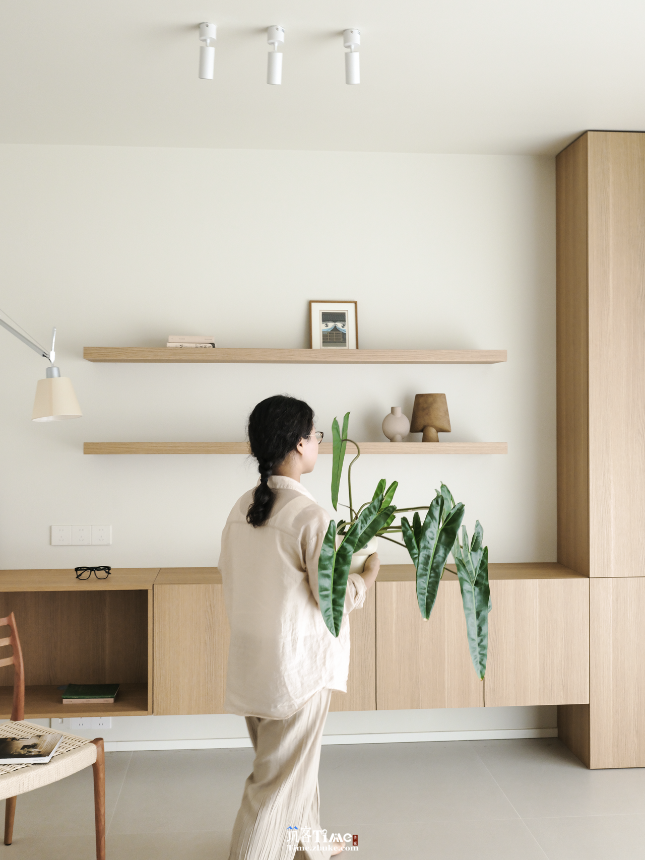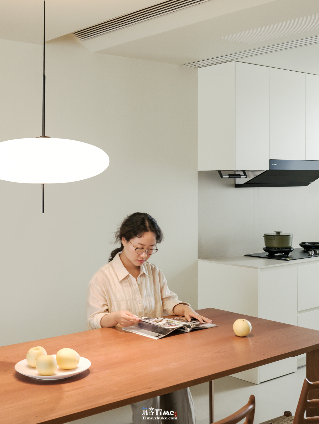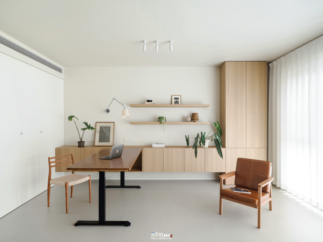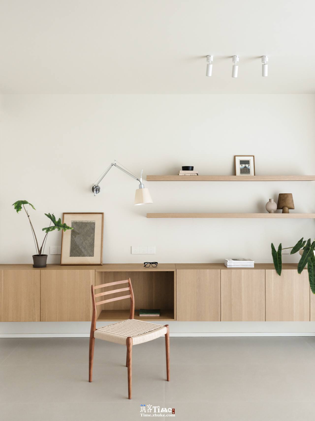 家的平衡在无形中生发,让所有奔赴都带着从容的弧度,与客厅对望的办公区,就是生活与工作的平衡术。一侧的高低柜悄然围合出专注的氛围,高柜默默承载储物的功能,低柜与上方置物架则妥帖收纳常用书籍资料,随手摆放的装饰小物也在此找到归宿,不经意间便圈出一片阅读场域。可调节高度的升降桌灵活实用,桌下特意留空的角落,恰好容下打印机,让每一处细节都为日常服务,日子便在一种透明的张力中展开。