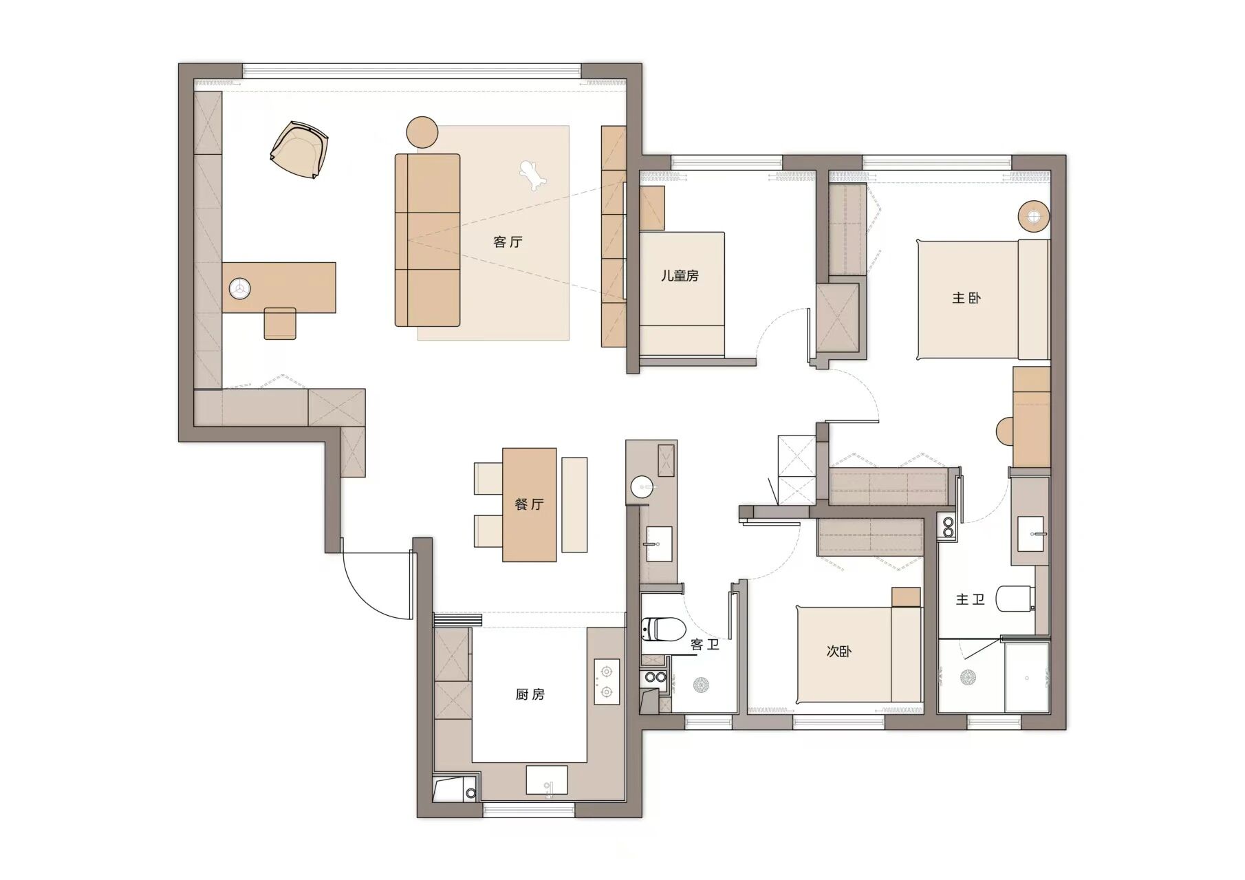 家的动线载着生活的呼吸节奏,设计重构空间脉络,让每一步都走得稳固,静静托举着每一刻的幸福。原客餐厅通往主卧的过道偏窄,设计师将儿童房与主卧整体南移,拓出开阔通路,主卧门也随之调整。 -