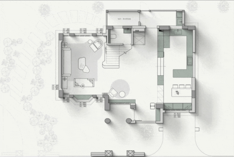 空间布局:设计的变量主导生活的变量,进而空间追随生活的变量,保留和重置同样重要,“陪伴”房屋生长多年的桂花树、樱花树、枇杷树等,年轮和建筑光阴都有了深厚“情感”,虽然挡住了原始的入口,且正对楼梯,设计师选择平衡和保留,封住被二次改造的入口,保留树木,建筑“拼接”,入口的方向进行调整,拱形门洞制造连廊,入户的仪式感满满,打开的尺度是独有的,肌理感的外立面保留,革新红砖面与之融合,地面停车场、庭院、连廊,步步是归家的喜悦。