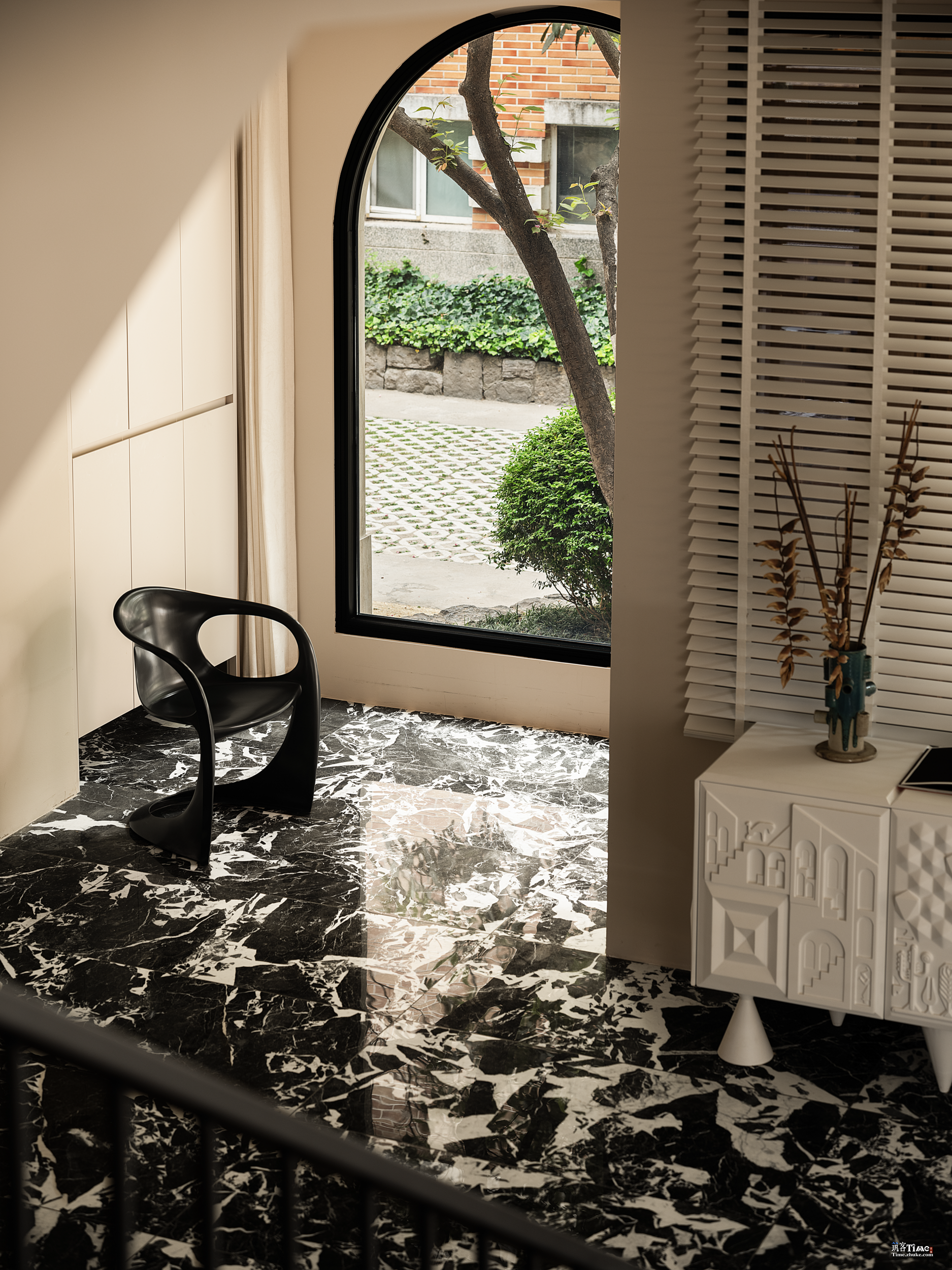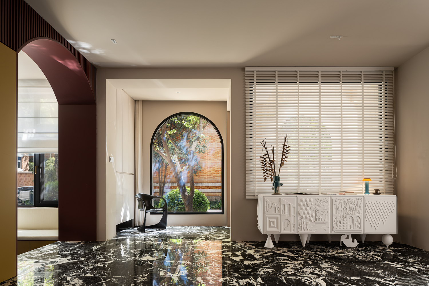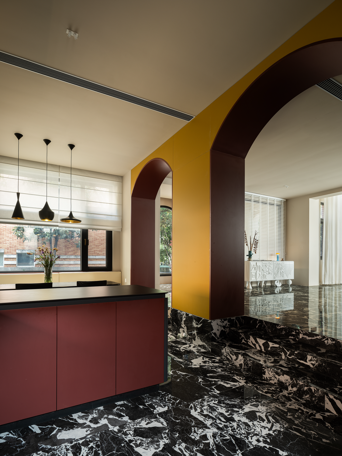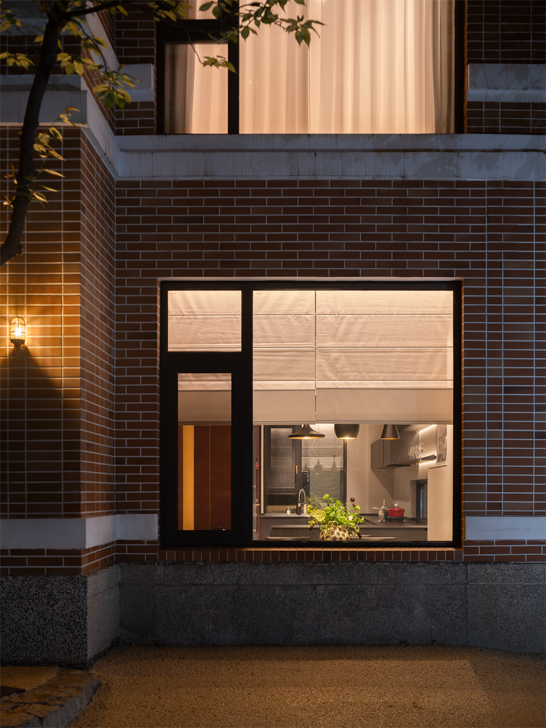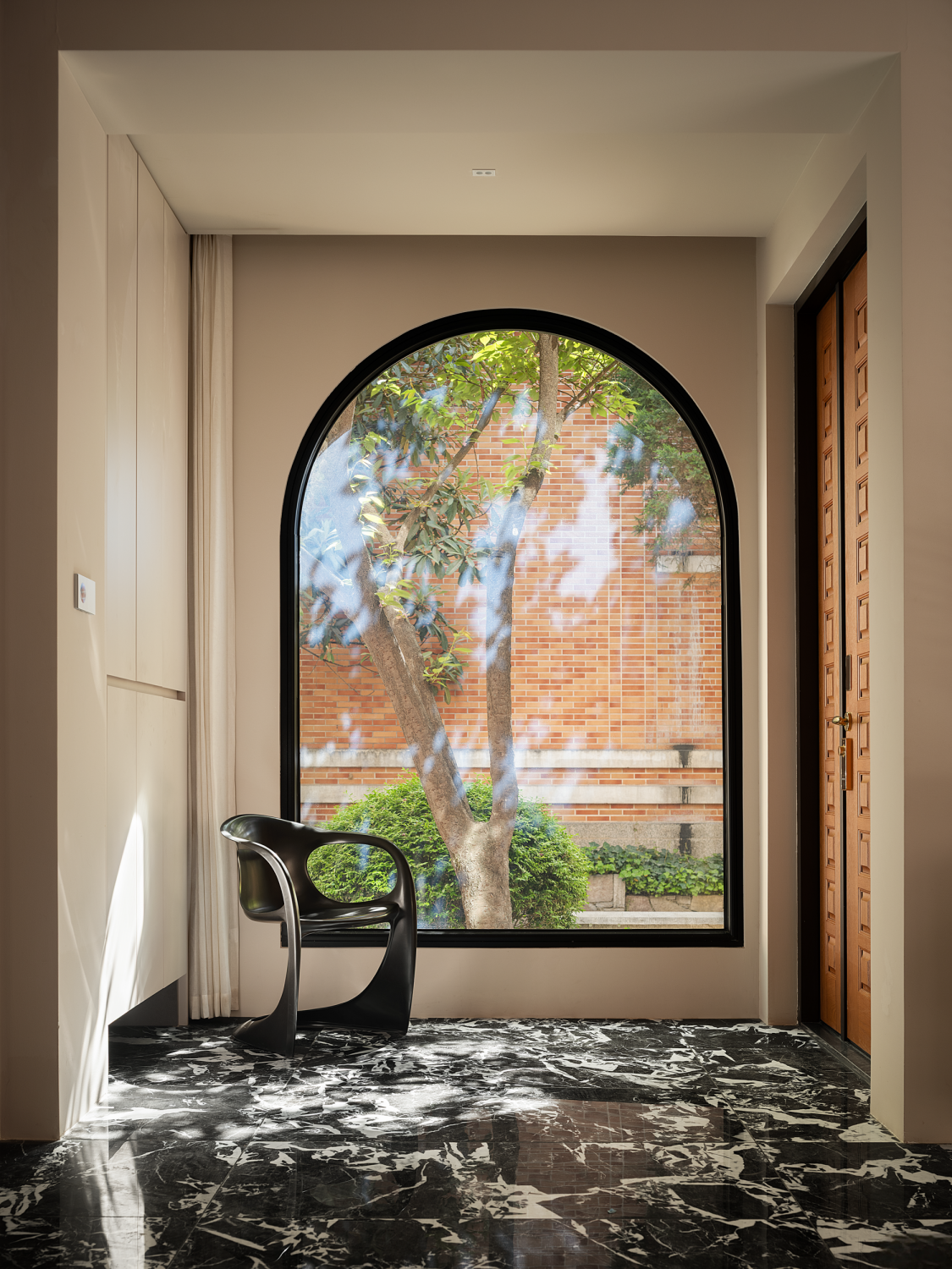 设计可以让美学也有双重的生活呼应,随着入口的改变,设计的“一笔”开始在空间中形成蝴蝶效应,空间的整体动线都随之改变,内外拱形的呼应,老红砖和新材料以相同的形状在室内外“表达”,喜树的情绪被延展进入室内,成为自然的框景,光影正好,功能正好。 -