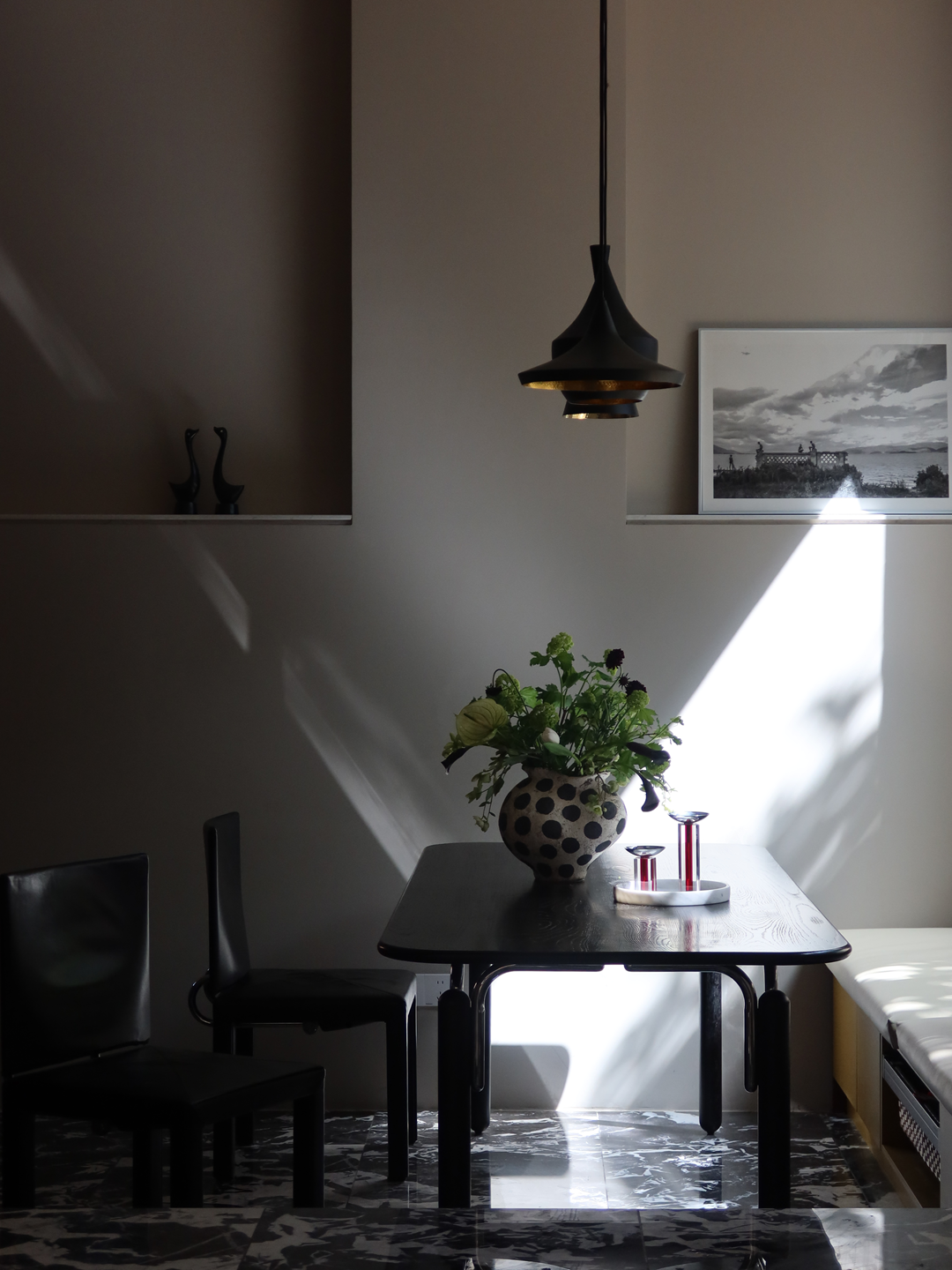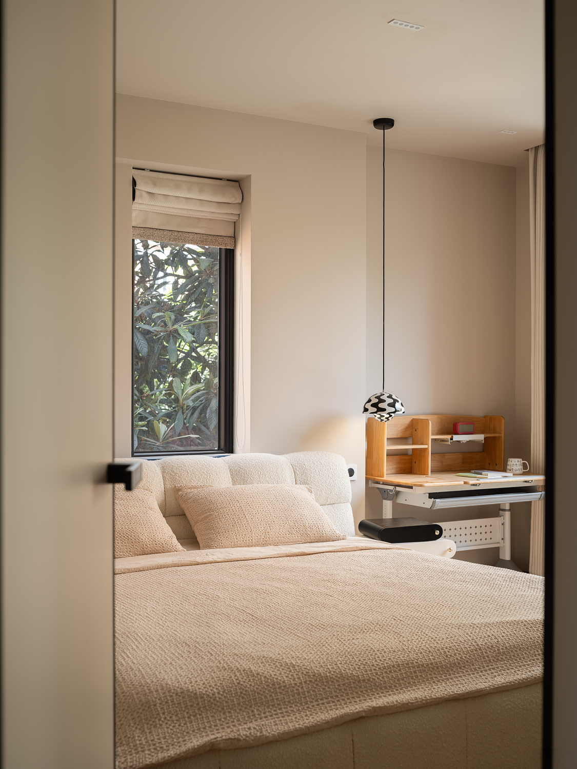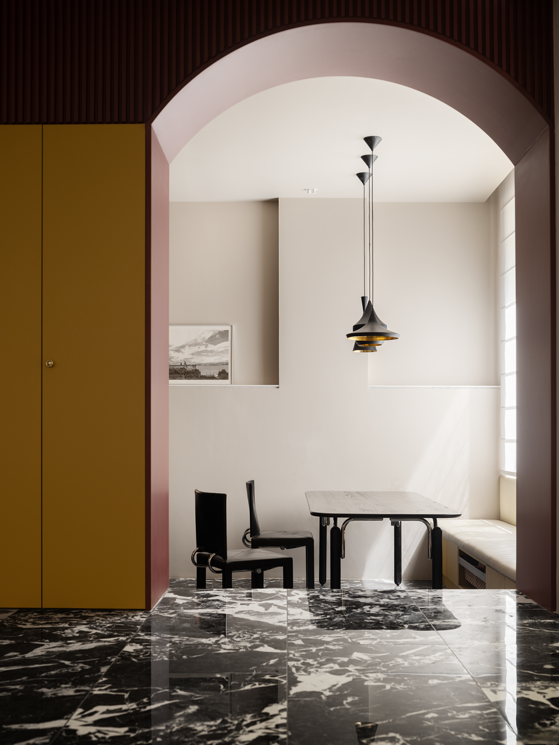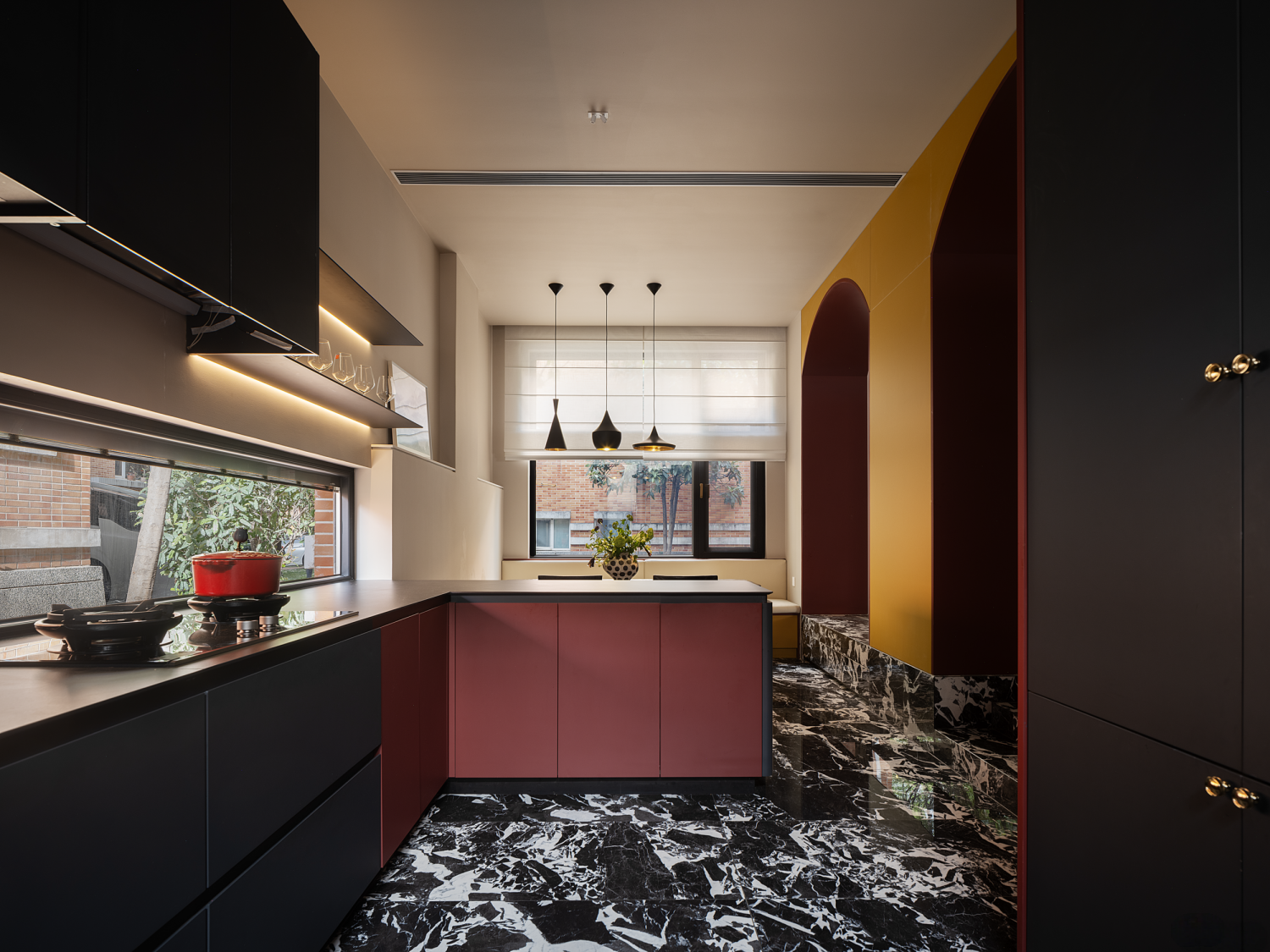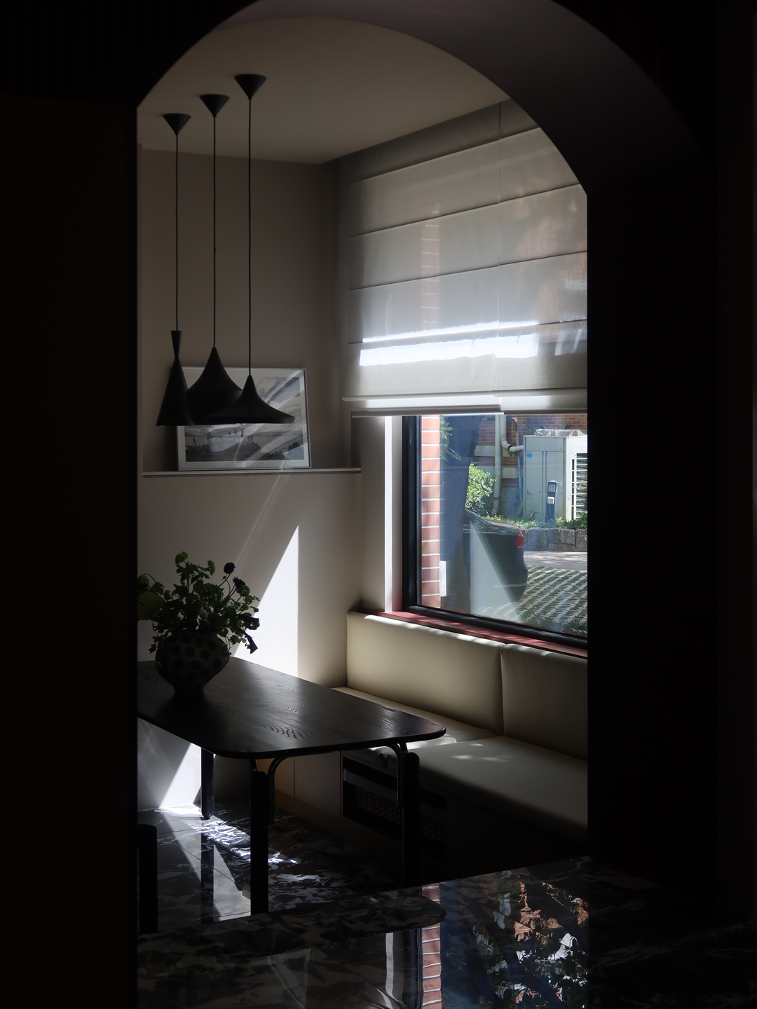 设计可以让美学也有双重的生活呼应,随着入口的改变,设计的“一笔”开始在空间中形成蝴蝶效应,空间的整体动线都随之改变,内外拱形的呼应,老红砖和新材料以相同的形状在室内外“表达”,喜树的情绪被延展进入室内,成为自然的框景,光影正好,功能正好。 -