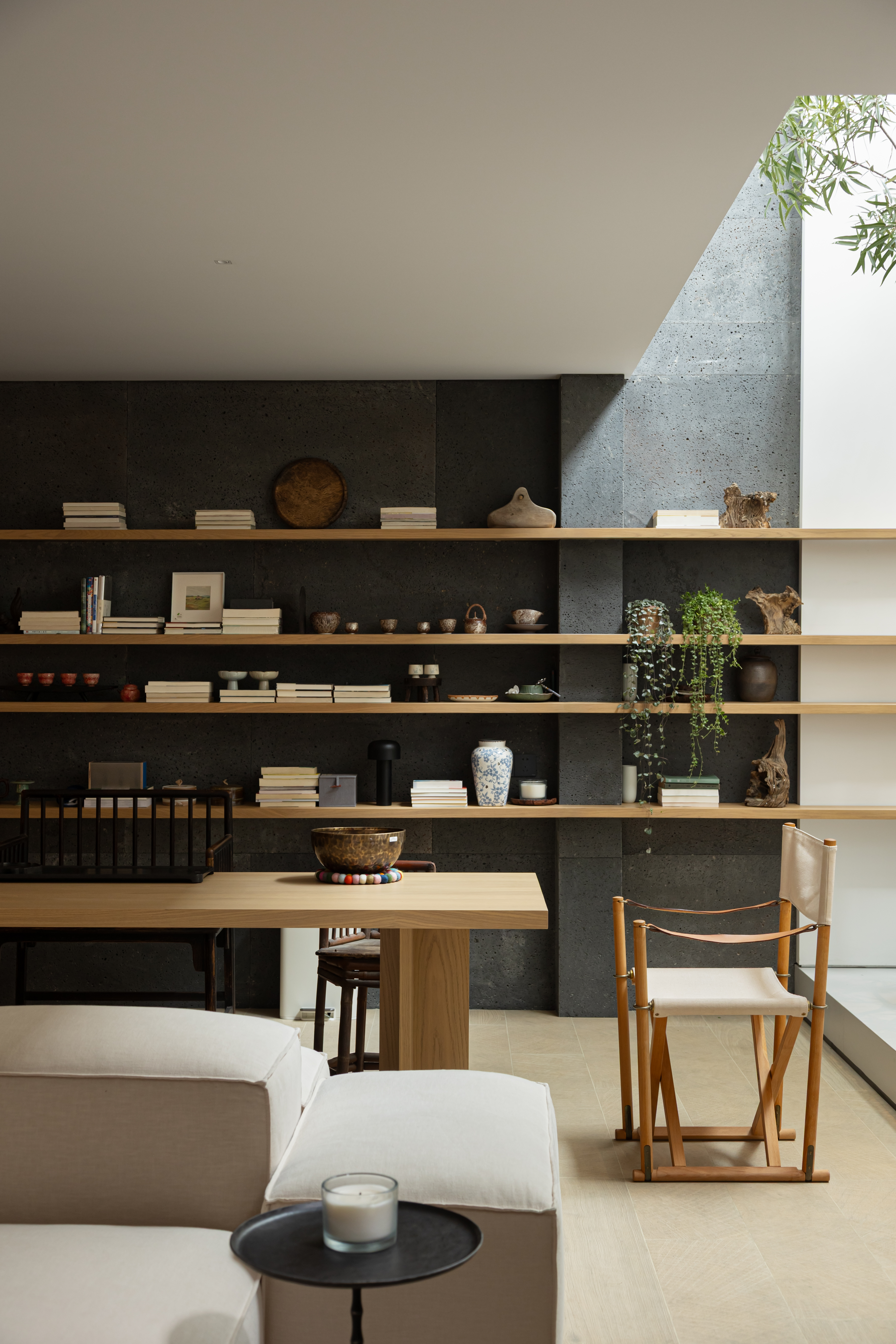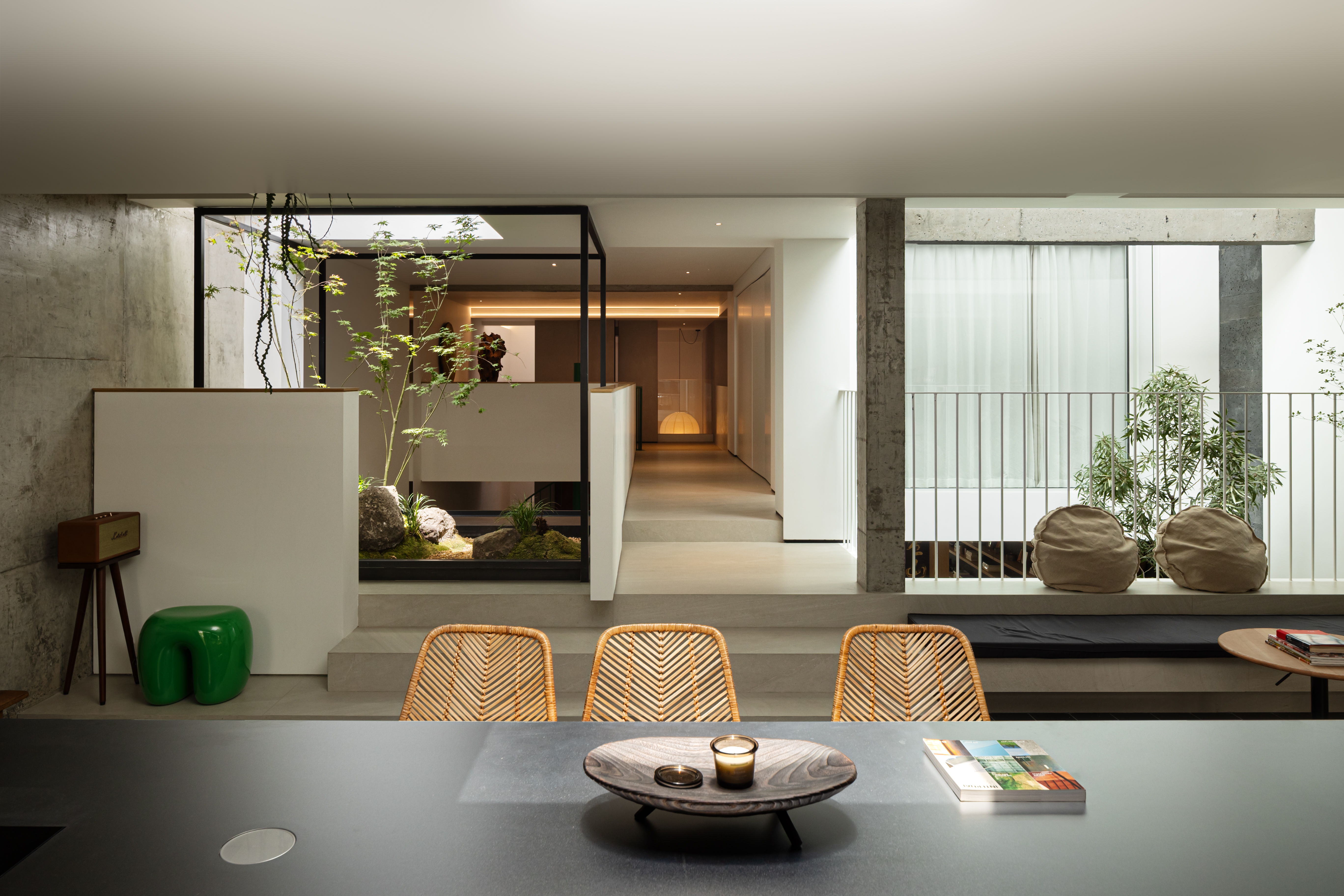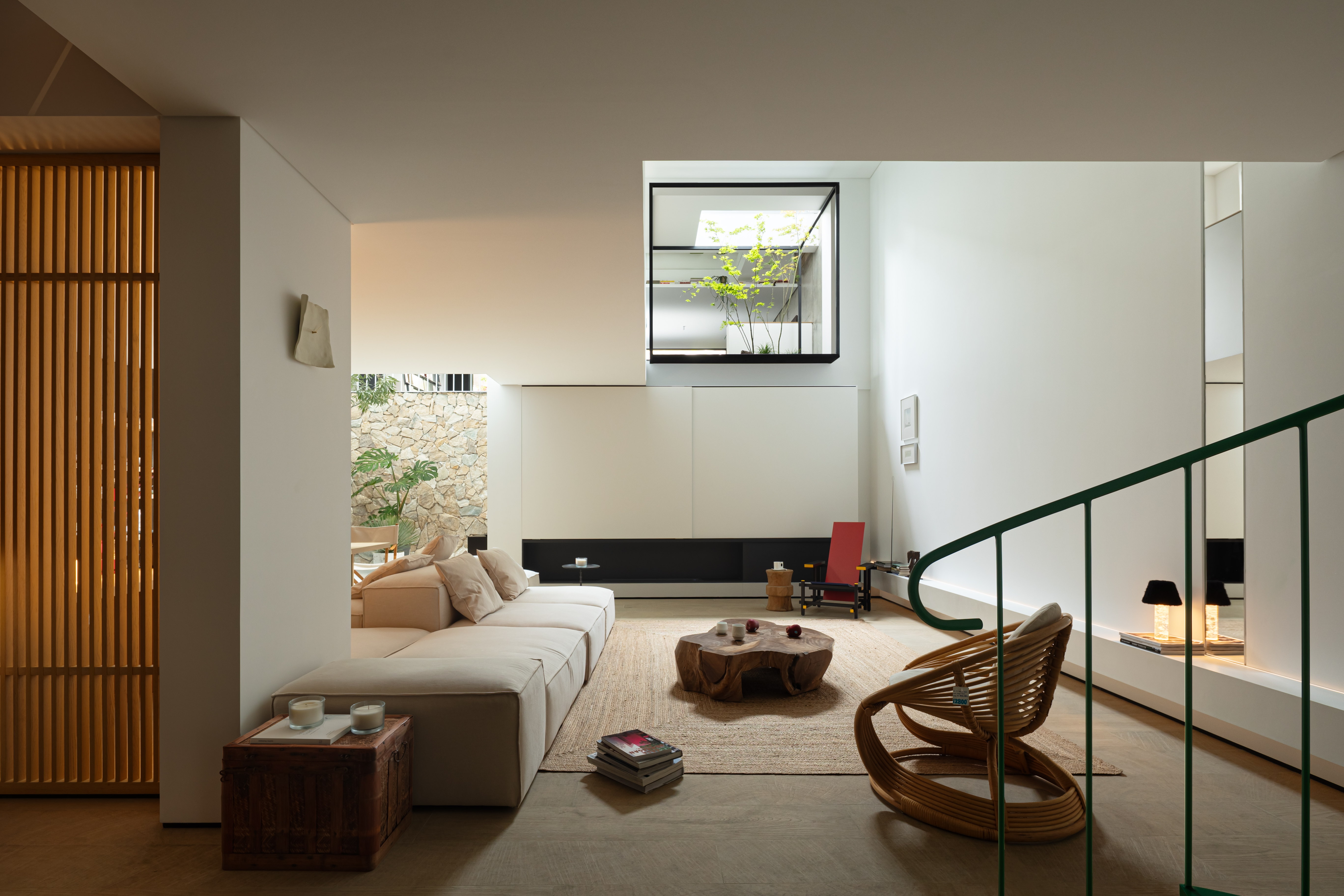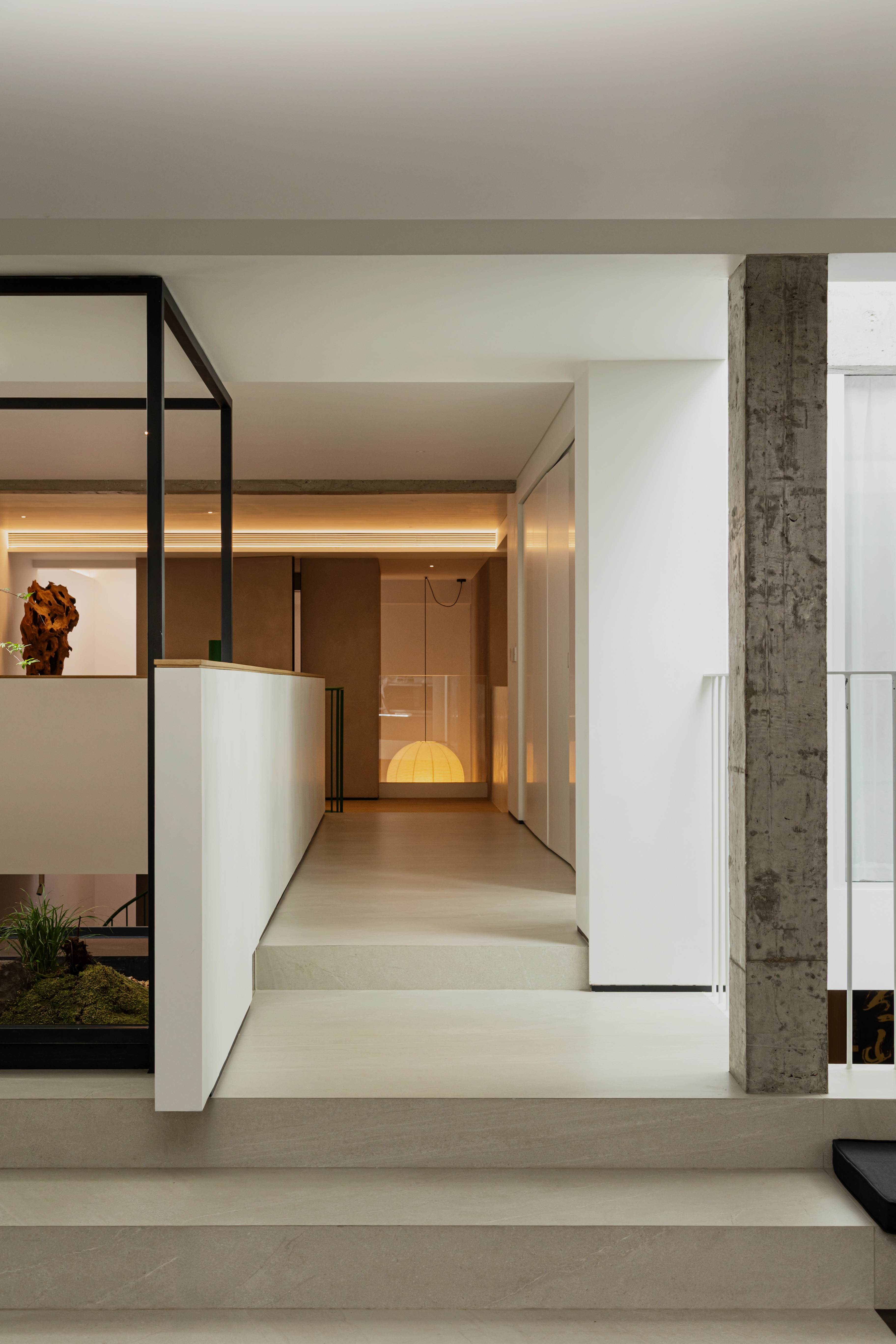 光的叙事:设计将光作为第一材料。通过在一楼庭院下挖,为地下工作室引入直射天光;利用挑空、玻璃框景和天井,让光线在负二、负一、一楼之间自由洒落、折射与漫射。天井下的茶室成为“光的容器”,而玻璃框景则成为捕捉光与生长植物的动态画框,实现了上下楼层间视觉与光线的诗意交汇。