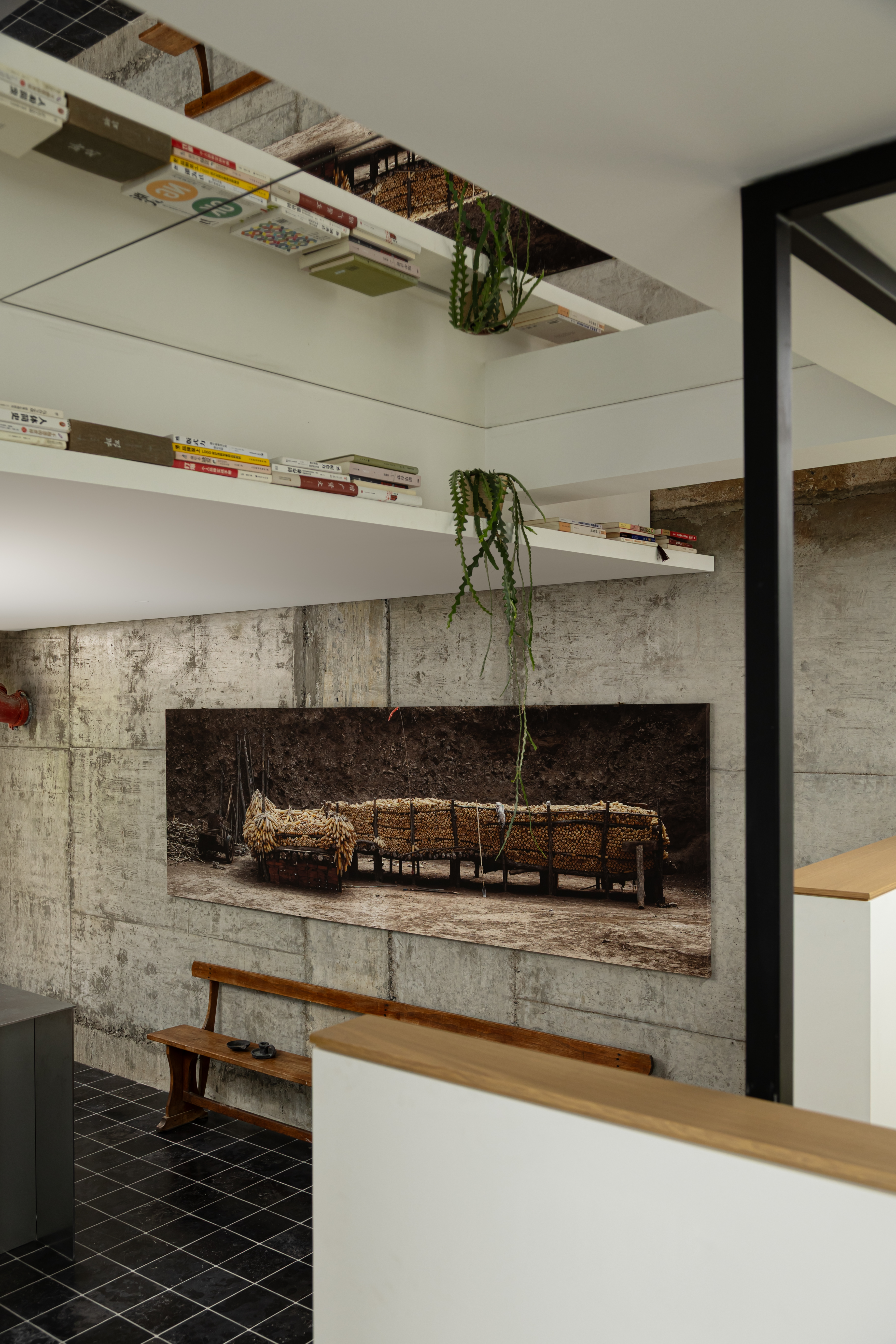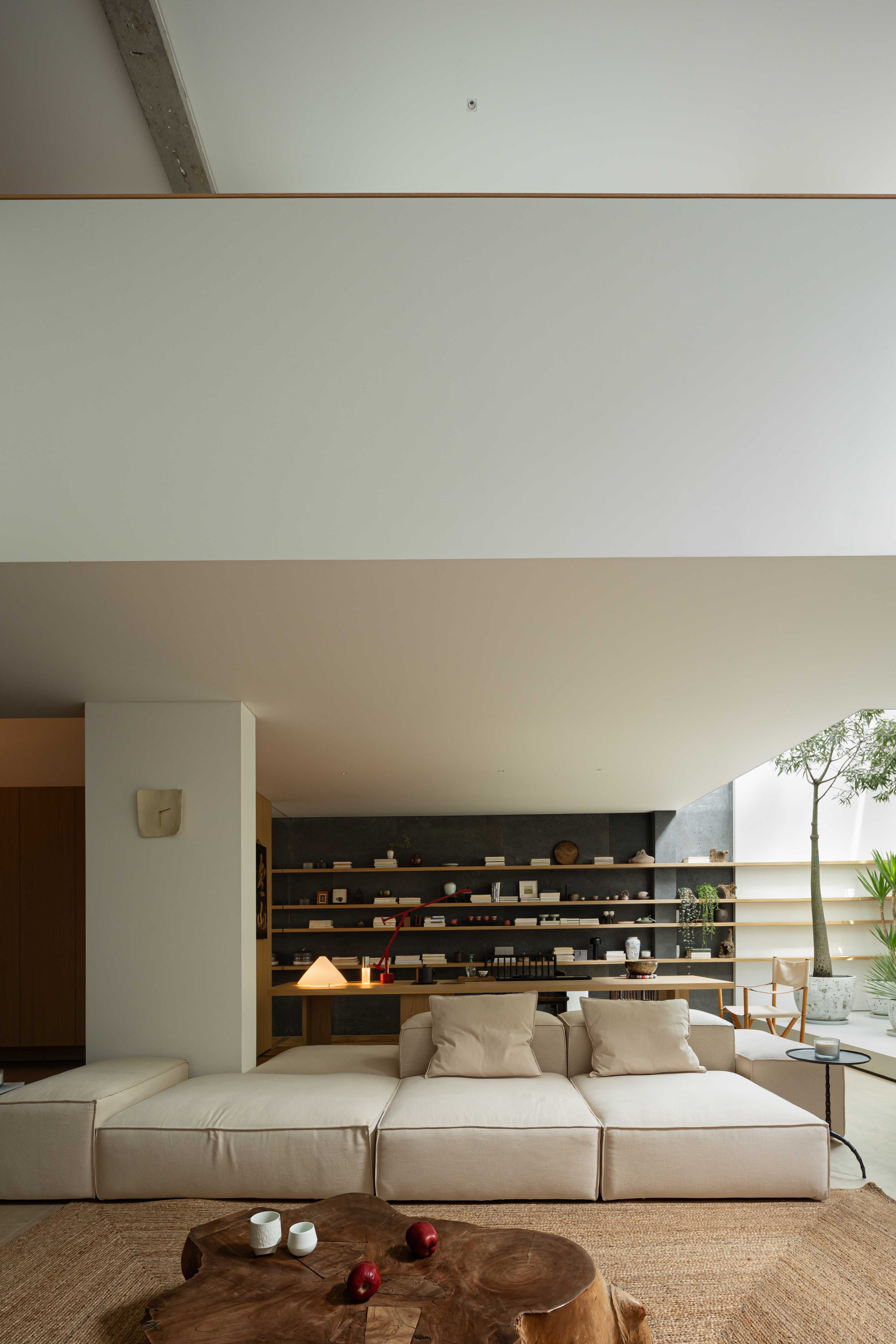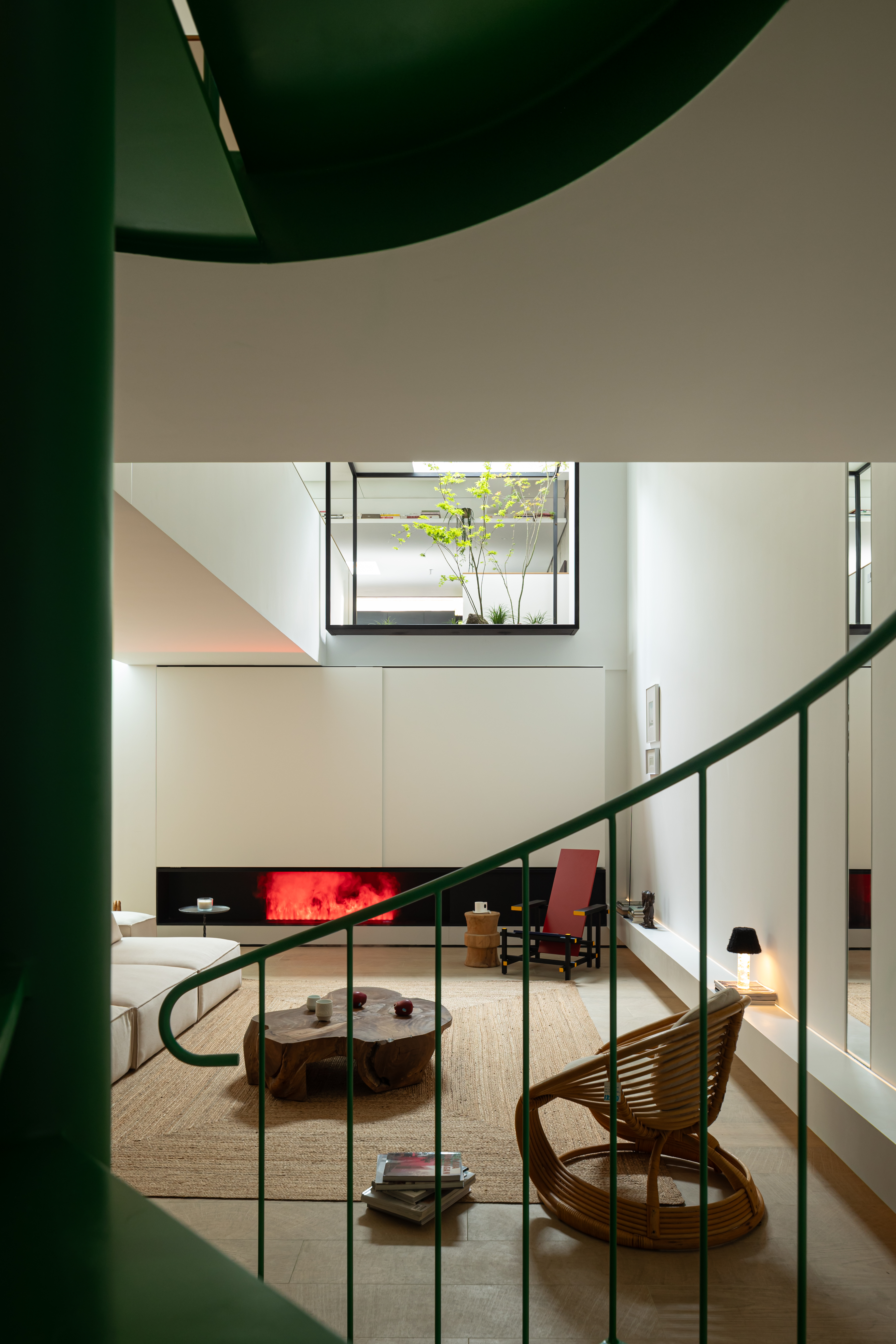 光的叙事:设计将光作为第一材料。通过在一楼庭院下挖,为地下工作室引入直射天光;利用挑空、玻璃框景和天井,让光线在负二、负一、一楼之间自由洒落、折射与漫射。天井下的茶室成为“光的容器”,而玻璃框景则成为捕捉光与生长植物的动态画框,实现了上下楼层间视觉与光线的诗意交汇。
