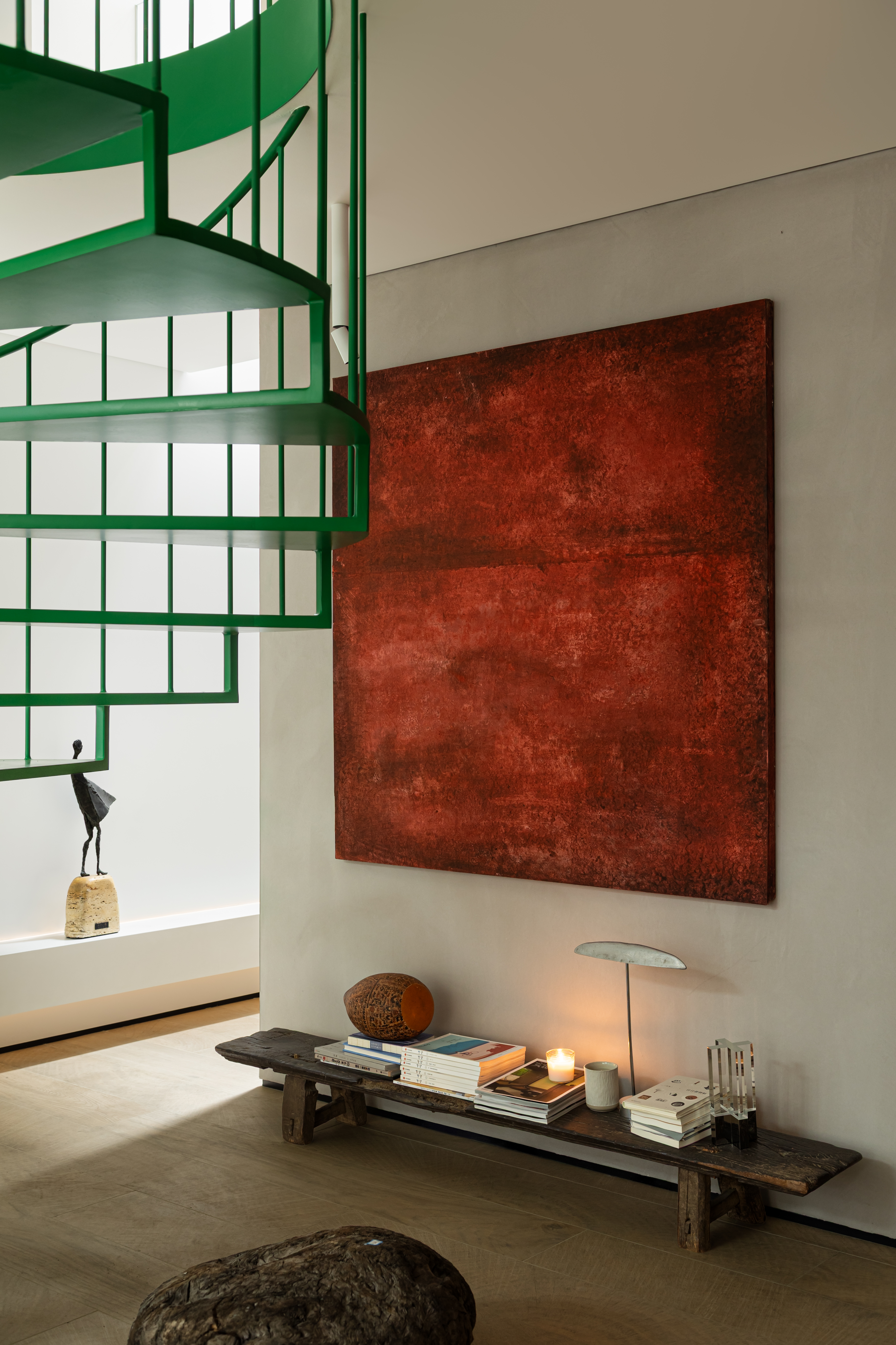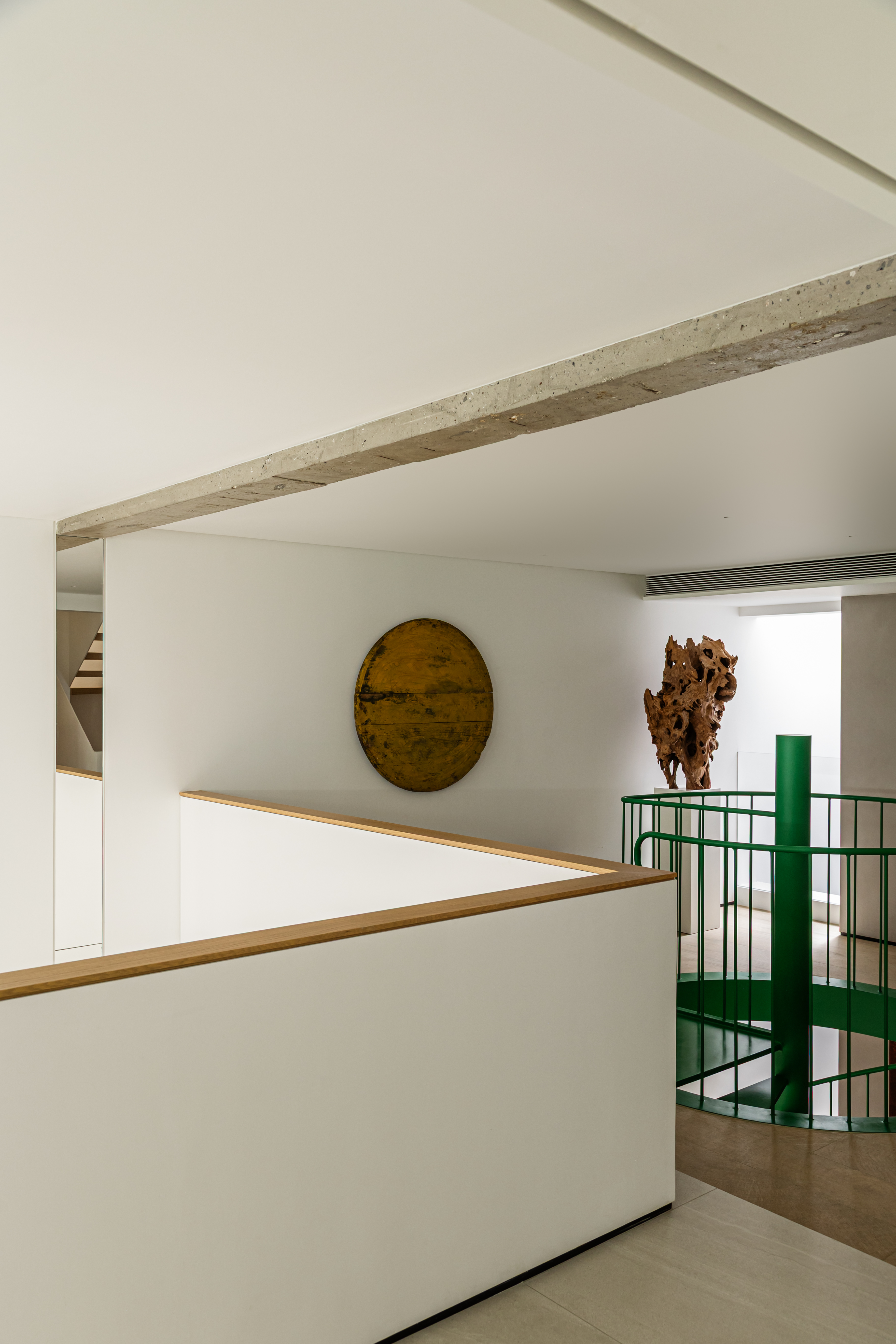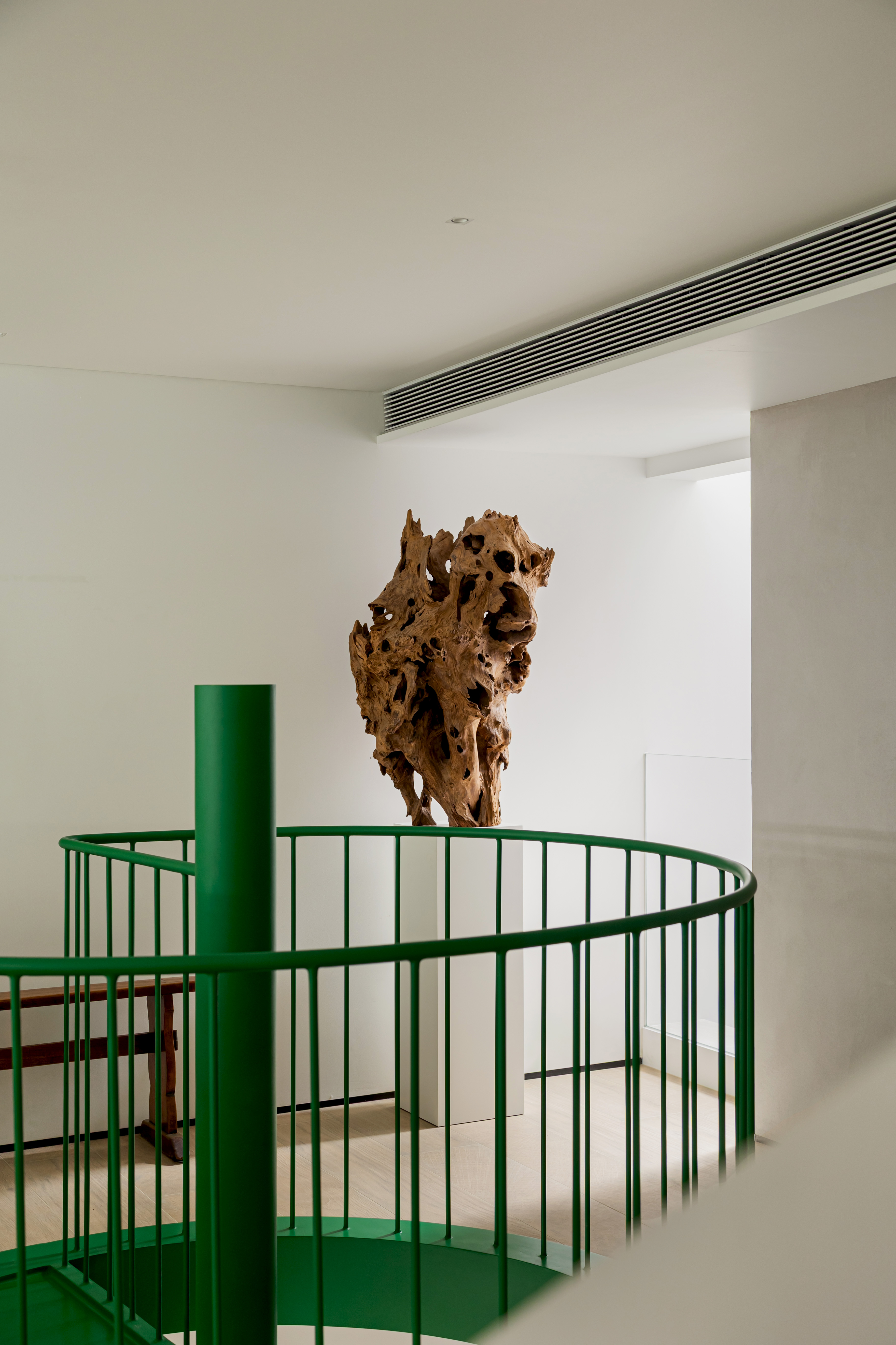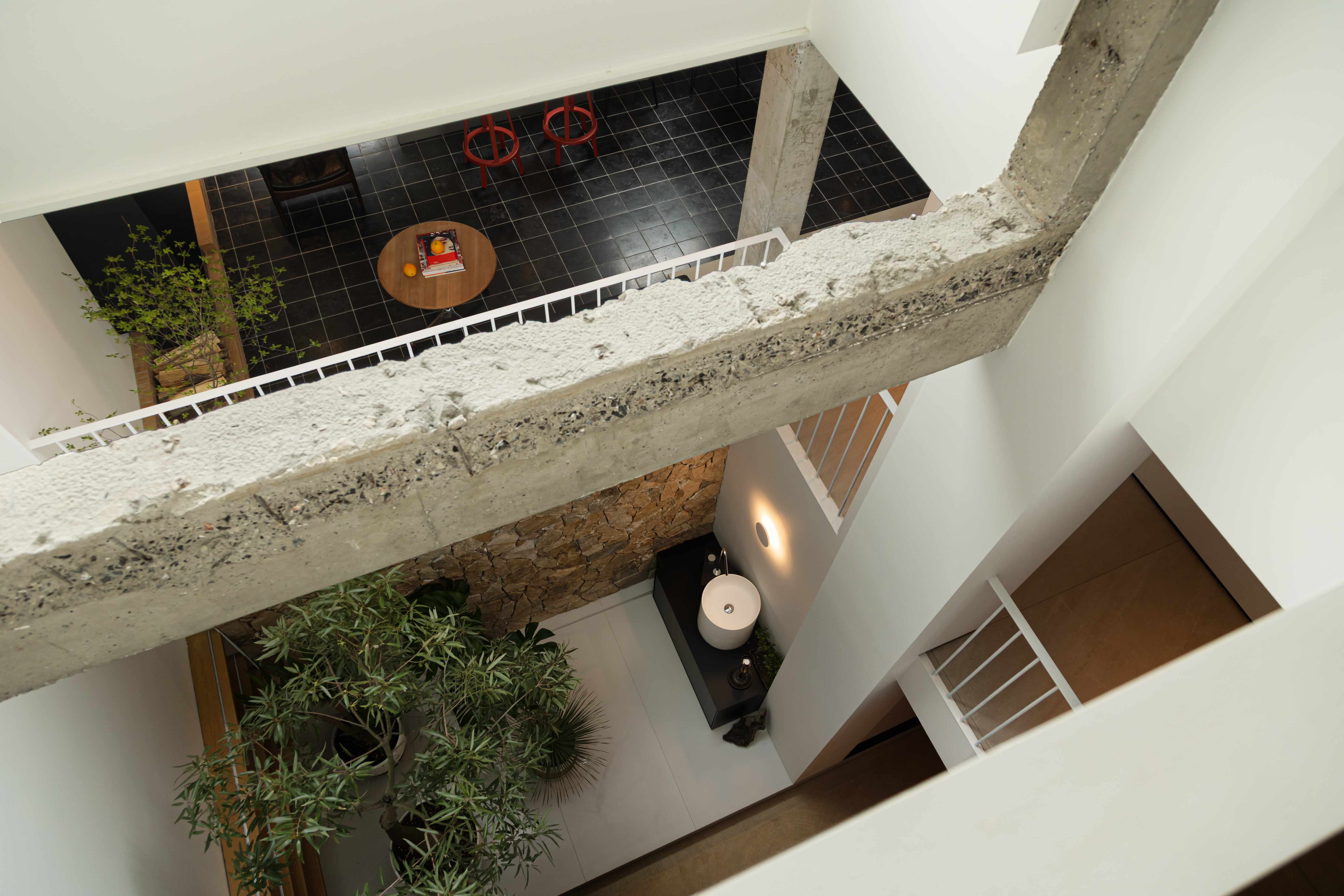 光的叙事:设计将光作为第一材料。通过在一楼庭院下挖,为地下工作室引入直射天光;利用挑空、玻璃框景和天井,让光线在负二、负一、一楼之间自由洒落、折射与漫射。天井下的茶室成为“光的容器”,而玻璃框景则成为捕捉光与生长植物的动态画框,实现了上下楼层间视觉与光线的诗意交汇。