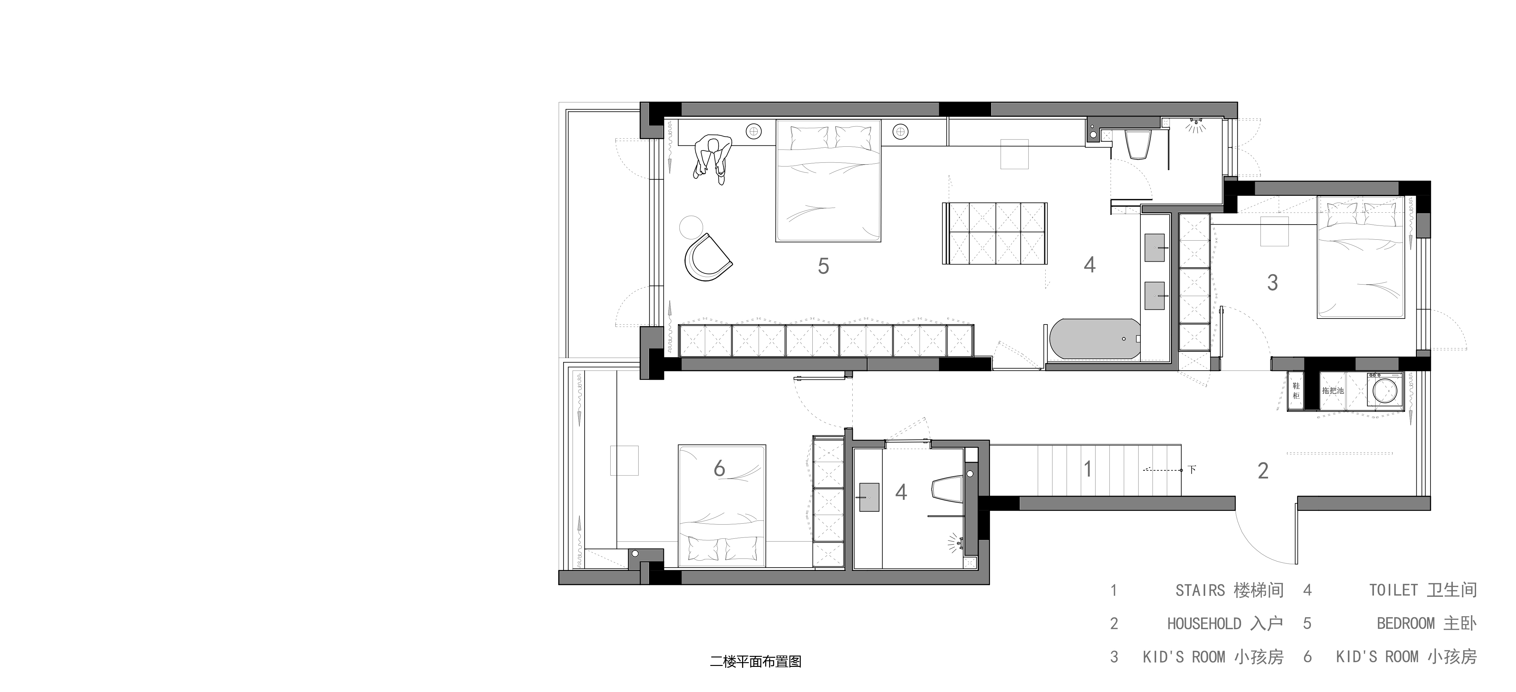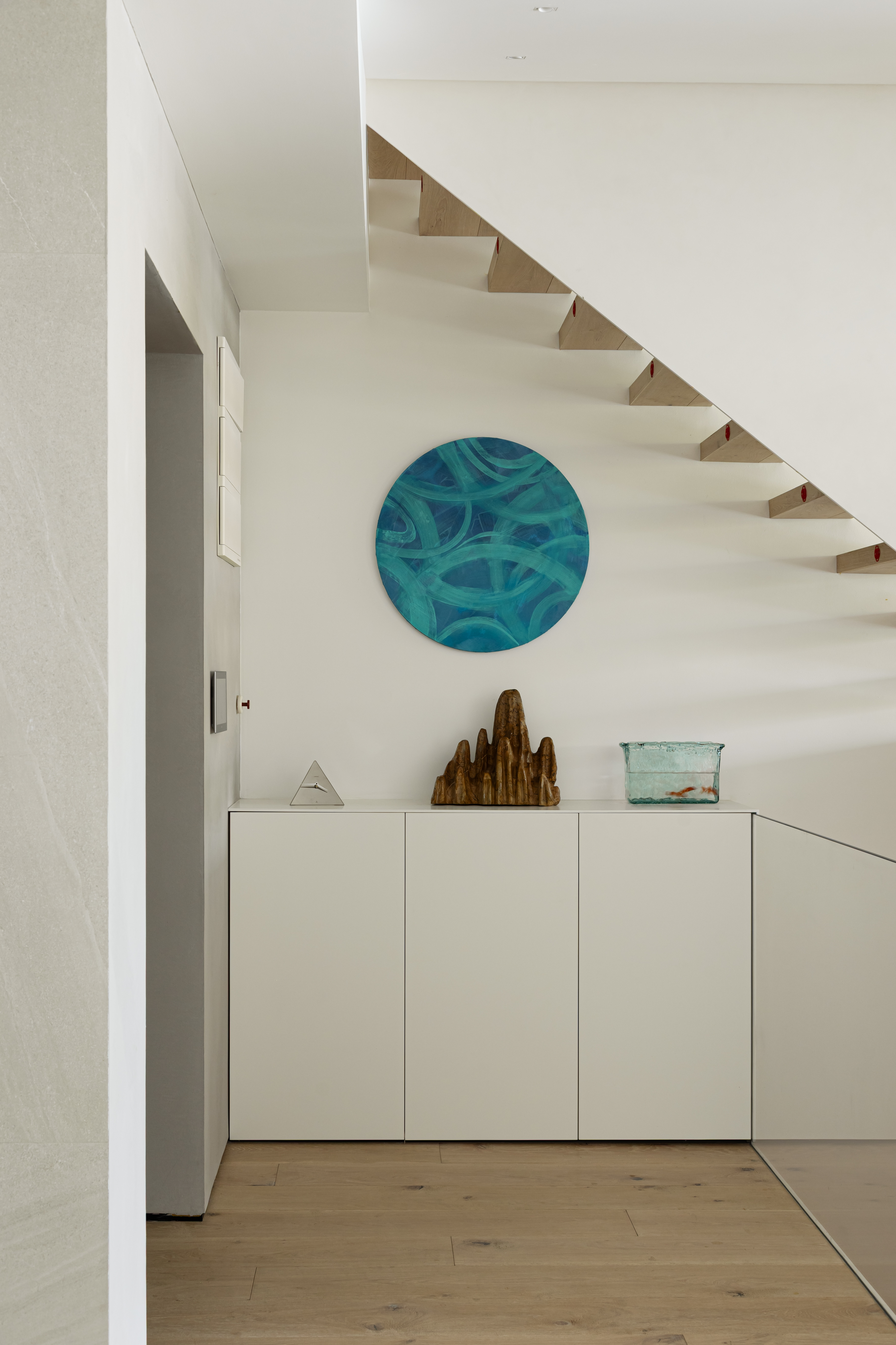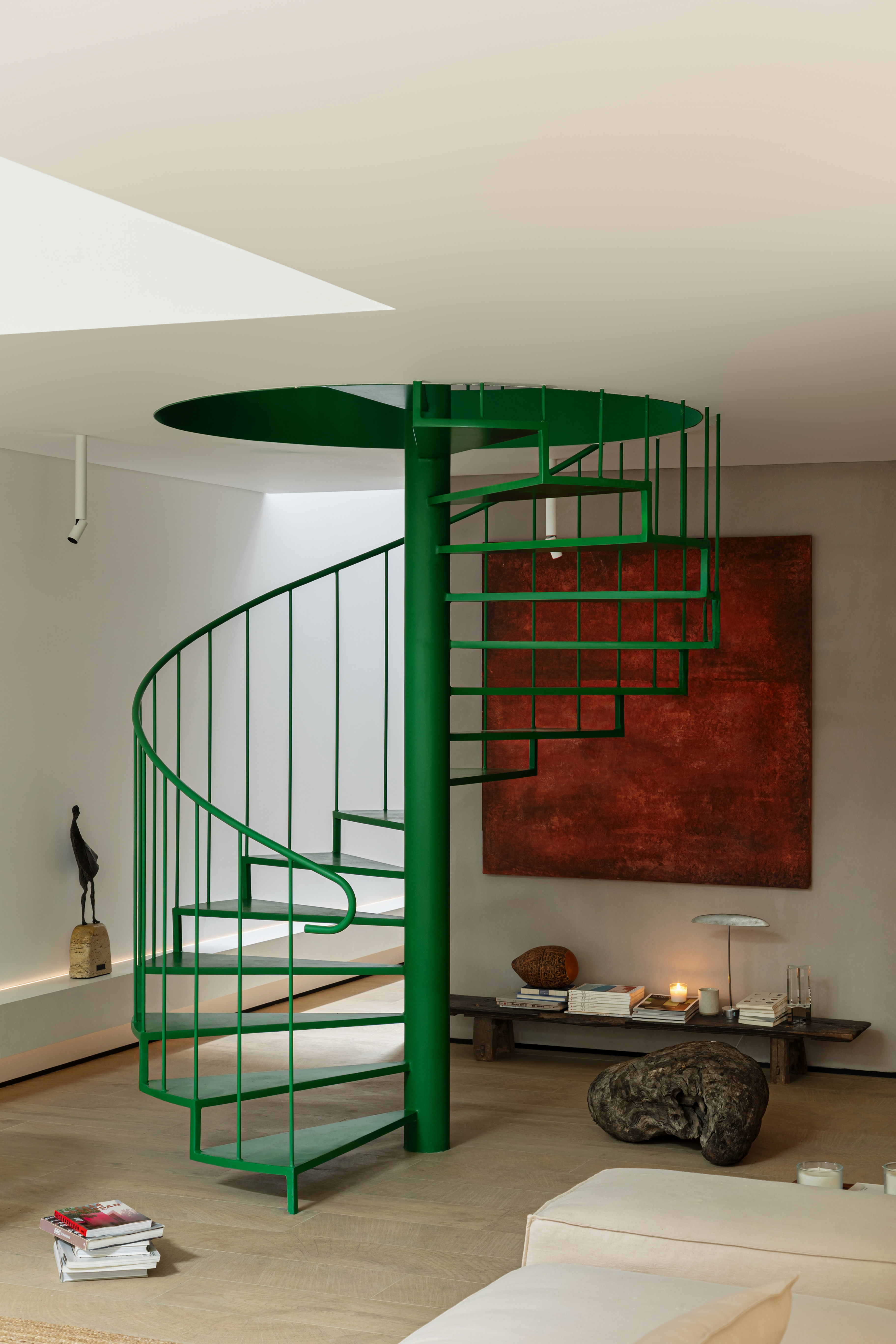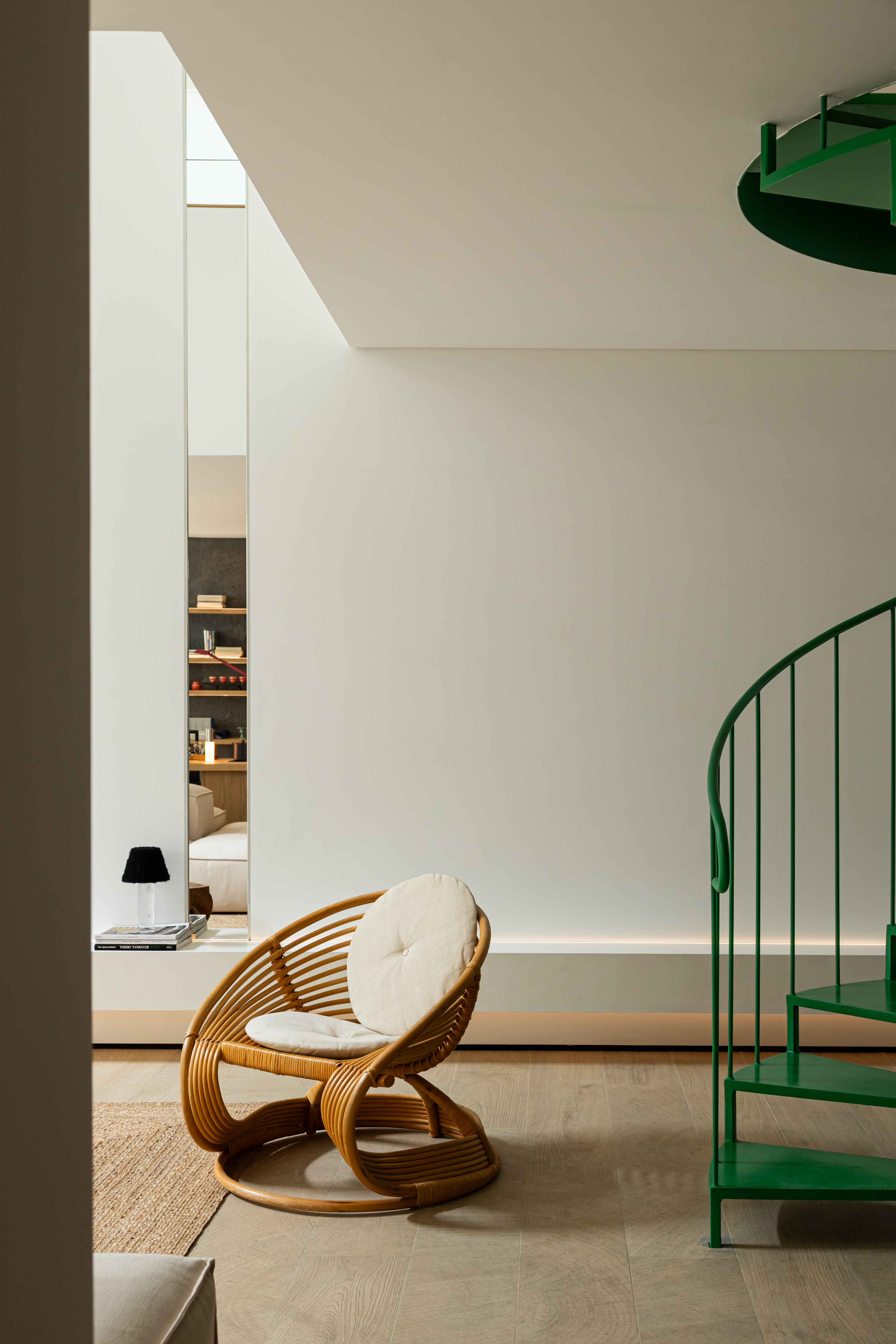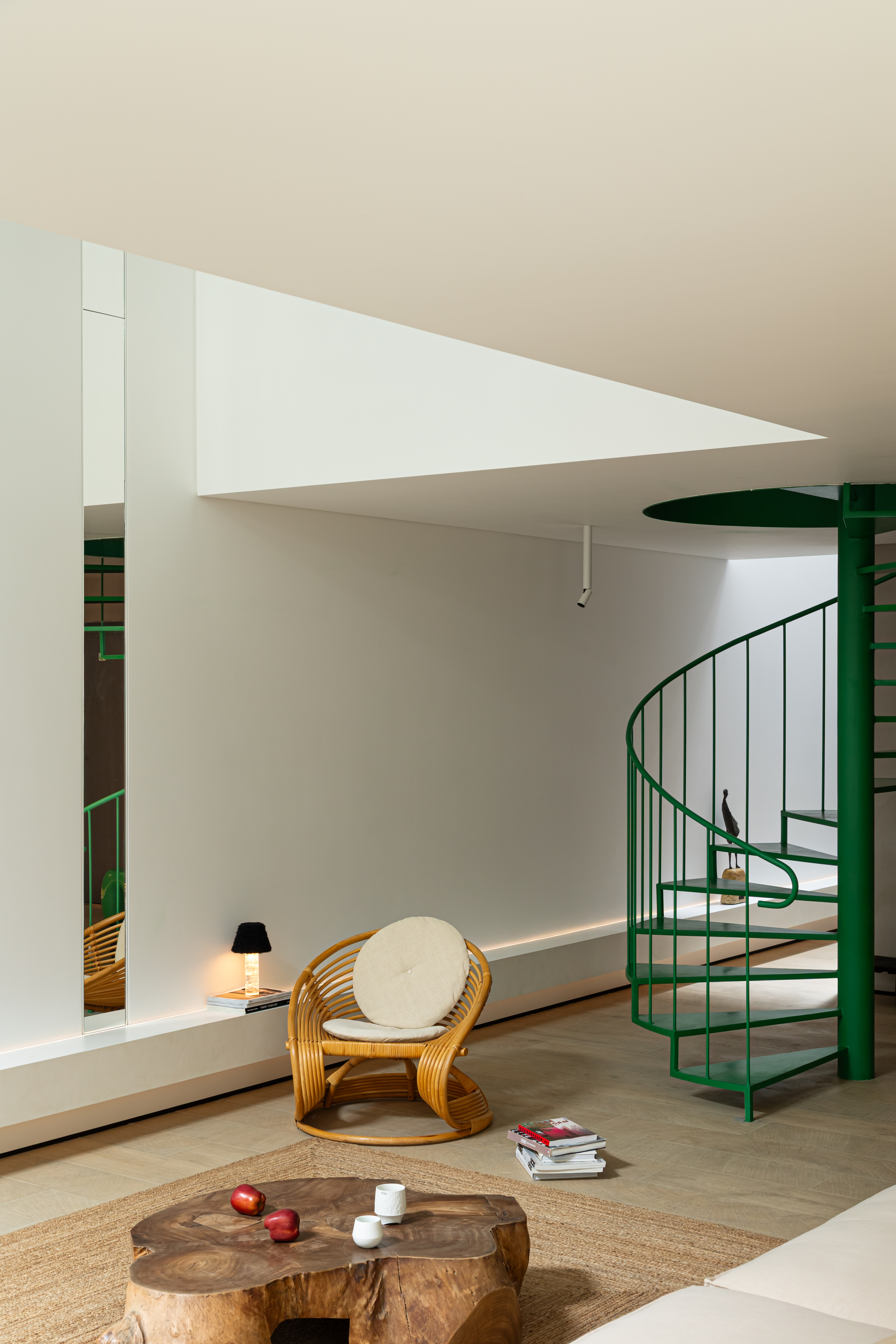 负二层:取消原始低效楼梯,改造为强大收纳区;新建的旋转楼梯成为艺术装置与垂直枢纽;利用挑空隔墙创造“表里世界”,隐藏盥洗洗衣区,形成探索趣味。