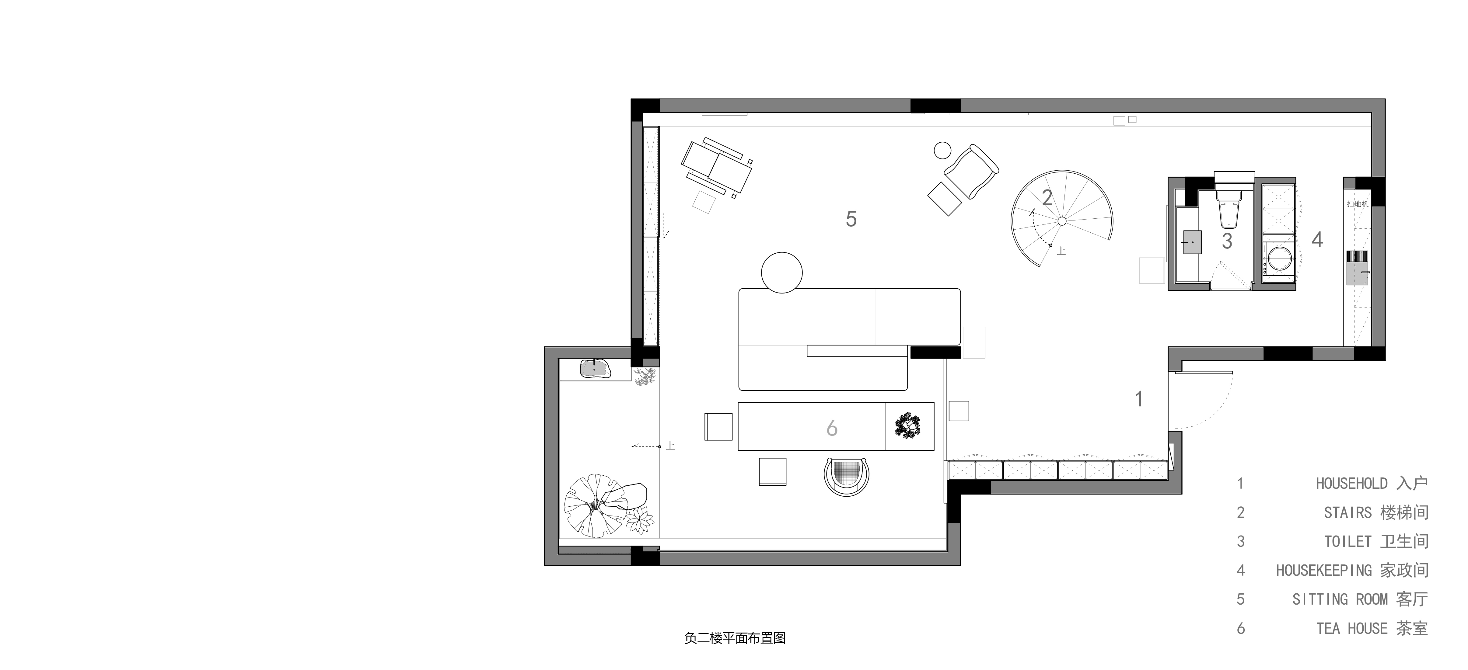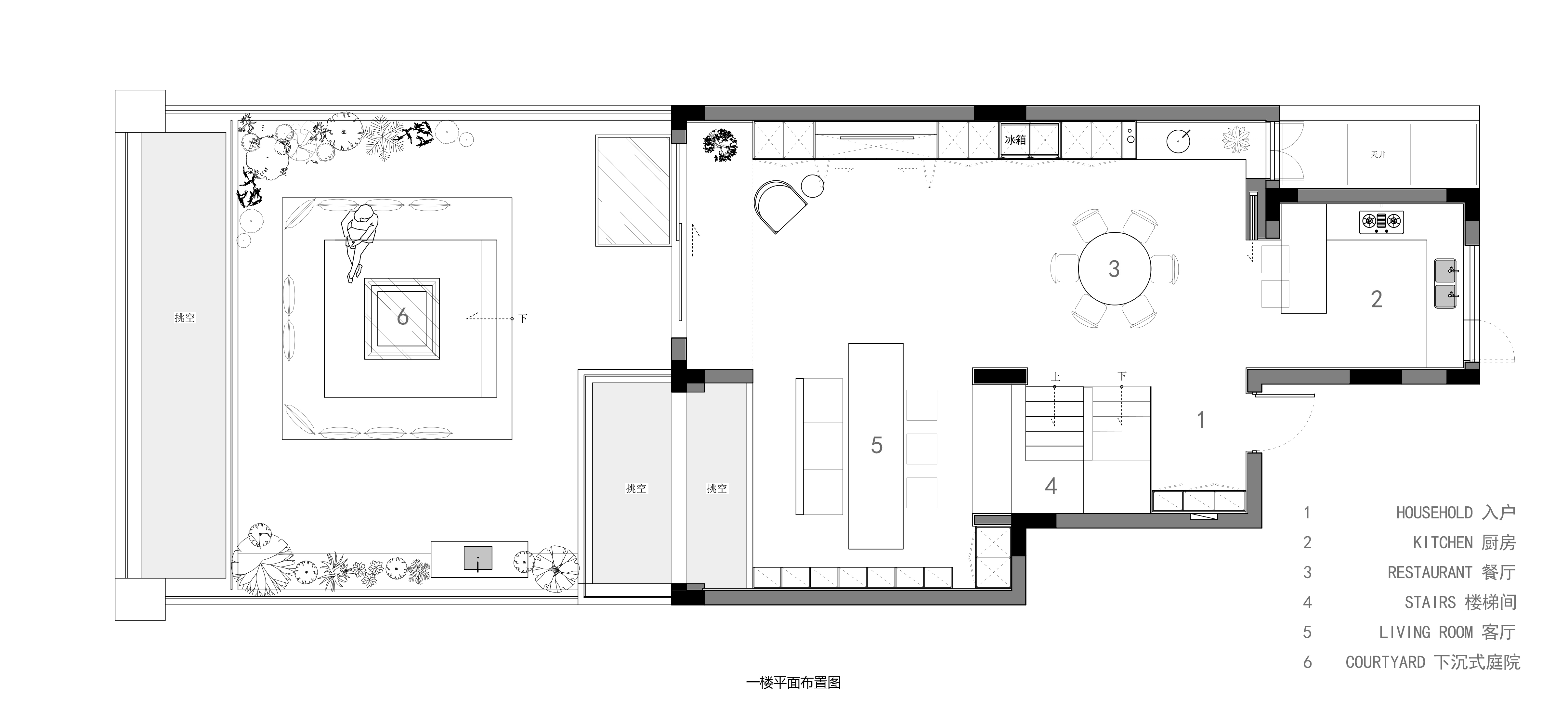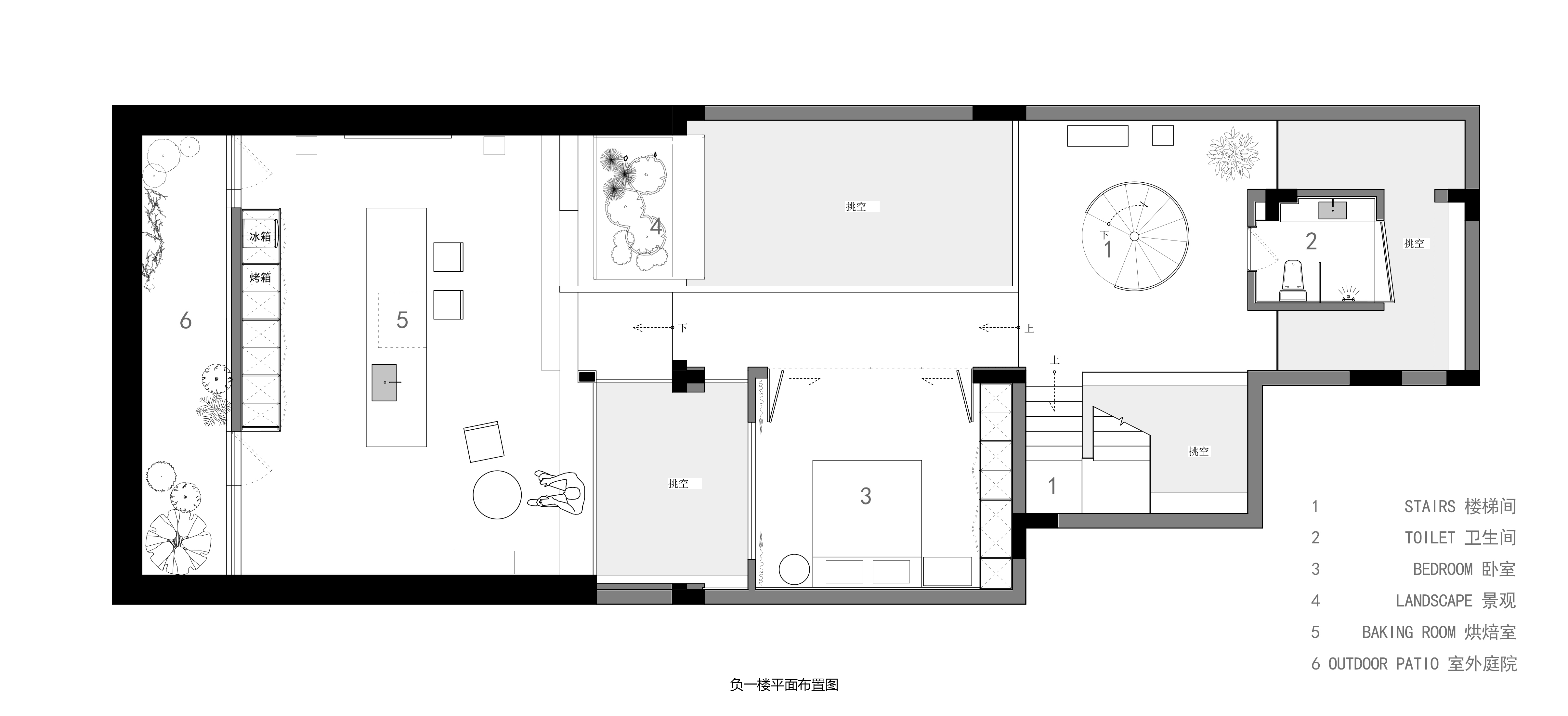 负一层:以天井和绿植为核心,一侧设置下沉式烘焙工作室(宣告状态转换),另一侧安排客卧,形成动静分明的细腻层次。