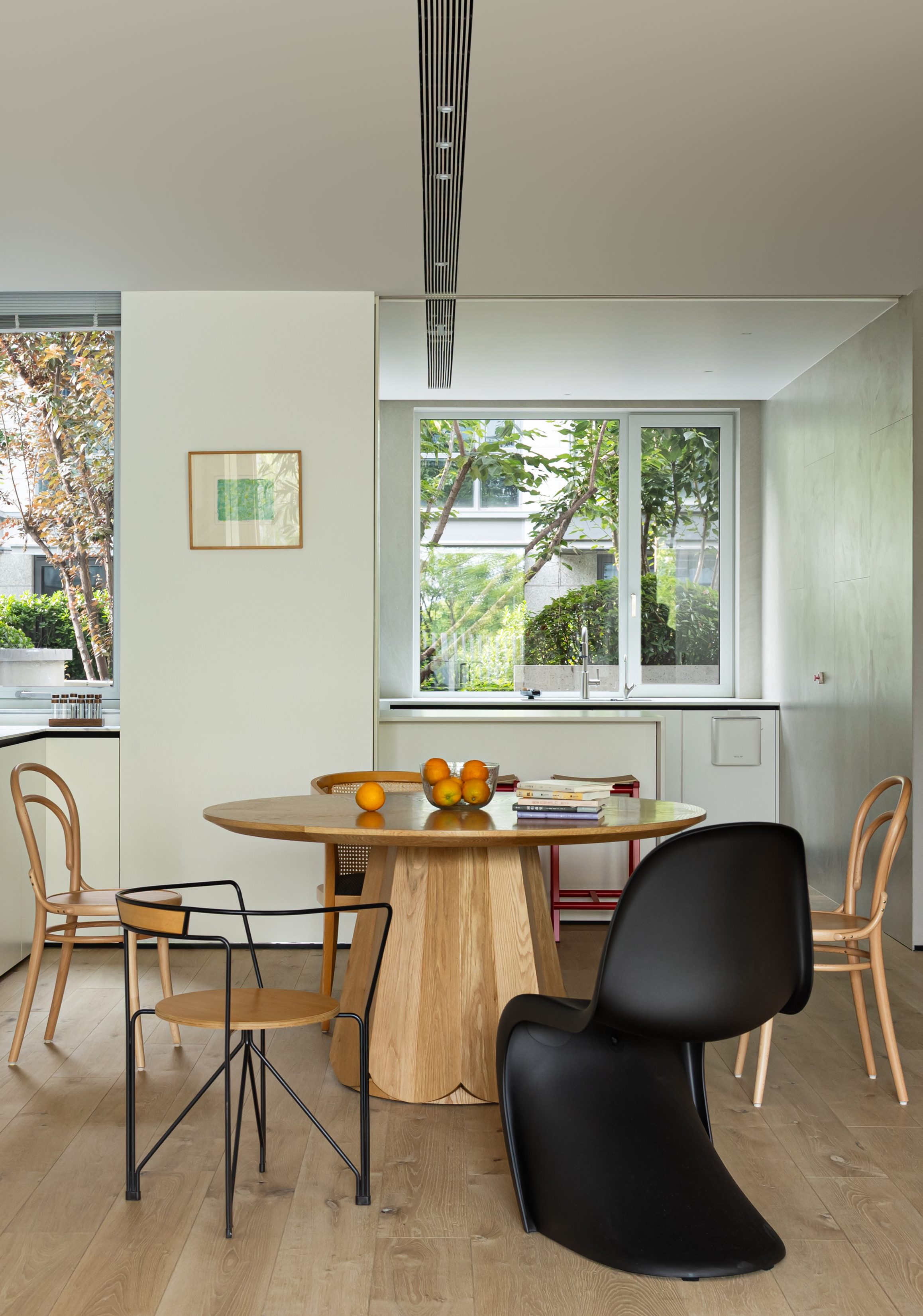 一层:解放原位于动线干扰区的客卧,使公区(客餐厅)恢复完整与宁静。采用“去统一化”的家具配置,允许不同年龄家庭成员根据喜好选择座椅,在有序的功能布局中包容审美的多样性。