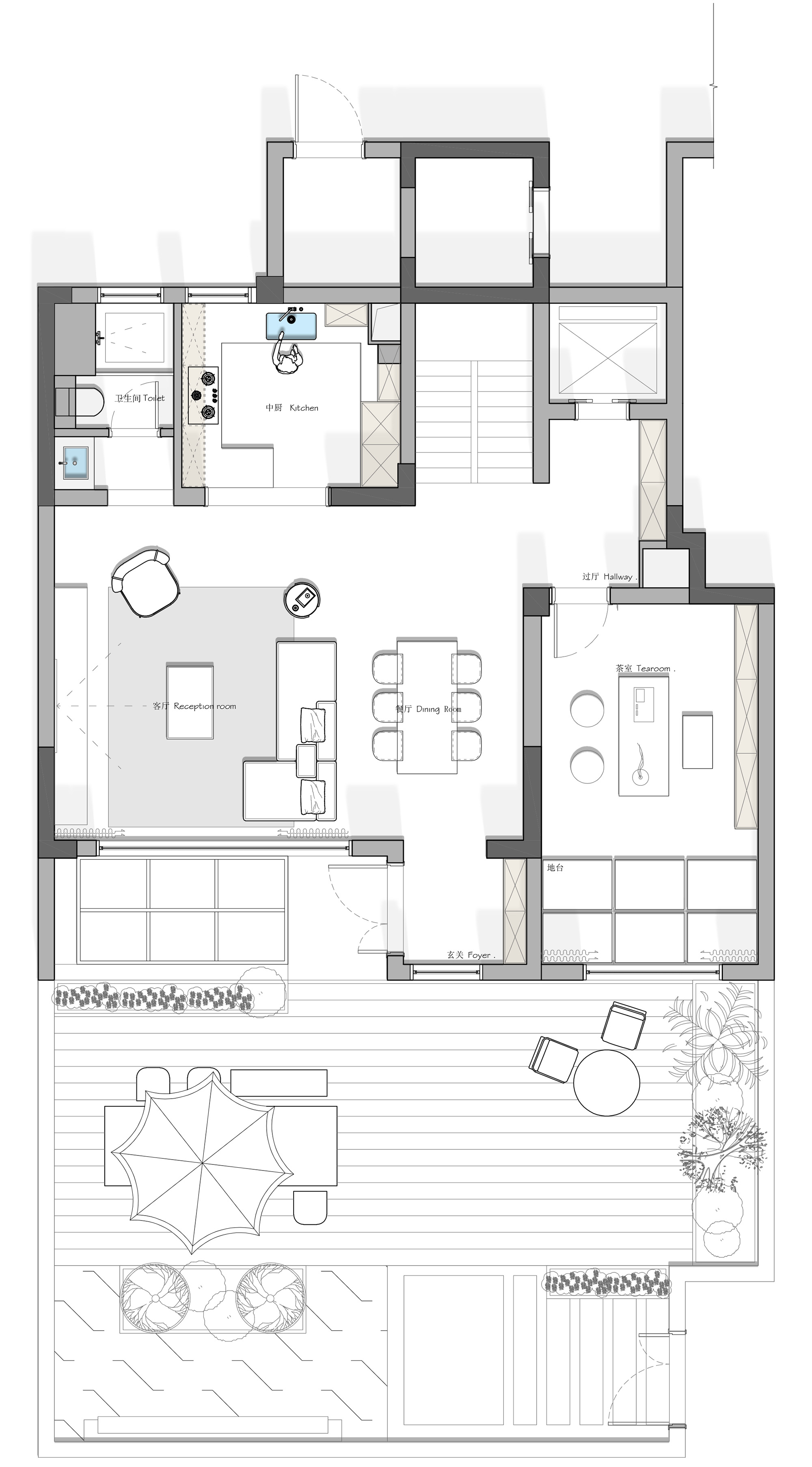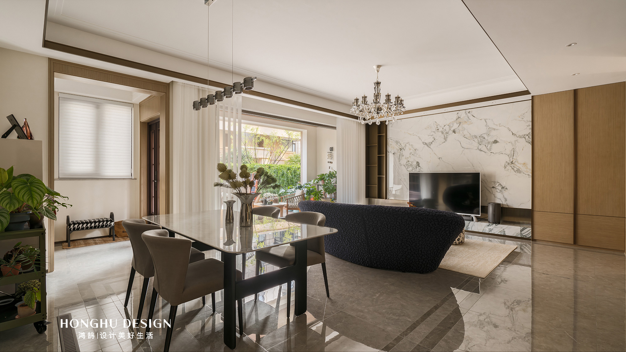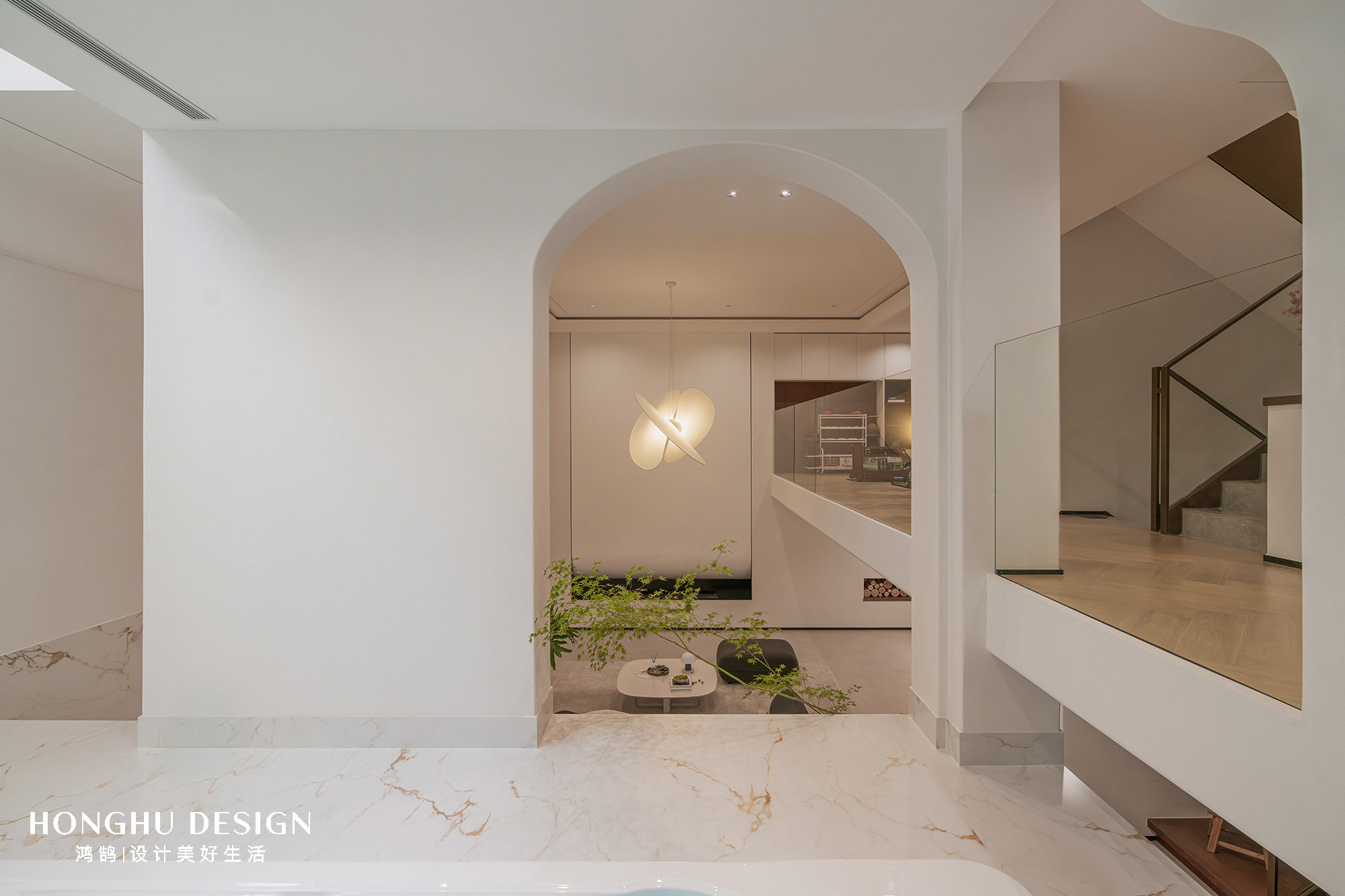 1F的整体空间以精装交付为主,没有做过多的改变,只是通过简单的软装来讲原本没有生命力的精装交付,变得有趣精致。 1F我们主要以院子,客厅,以及一个植物冥想室为主。1F的植物室有一部分空间我们是拓出去的,一方面可以增加植物采光,整个空间也会变大。