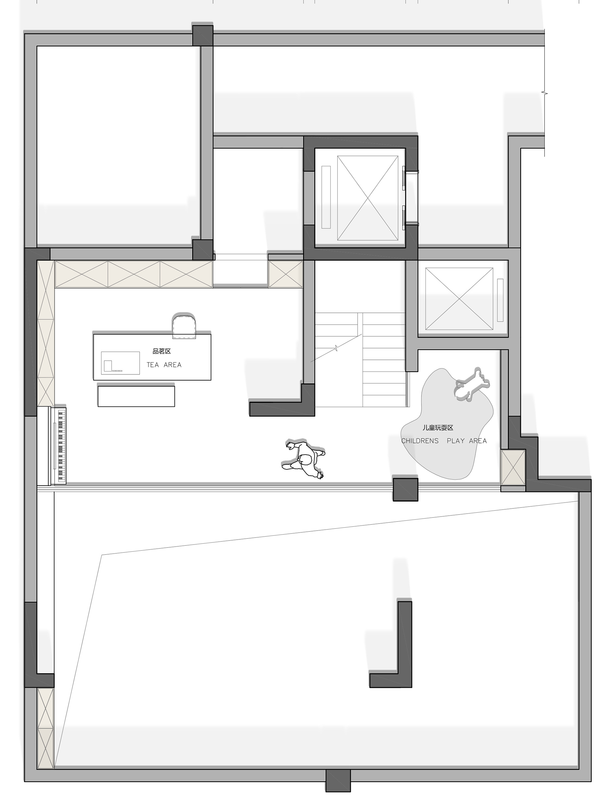 地下室我们是做了一个半挑高的设计,一方面我们要满足业主的攀岩墙的需求,另一方面半挑高的设计可以更加丰富地下室的功能。