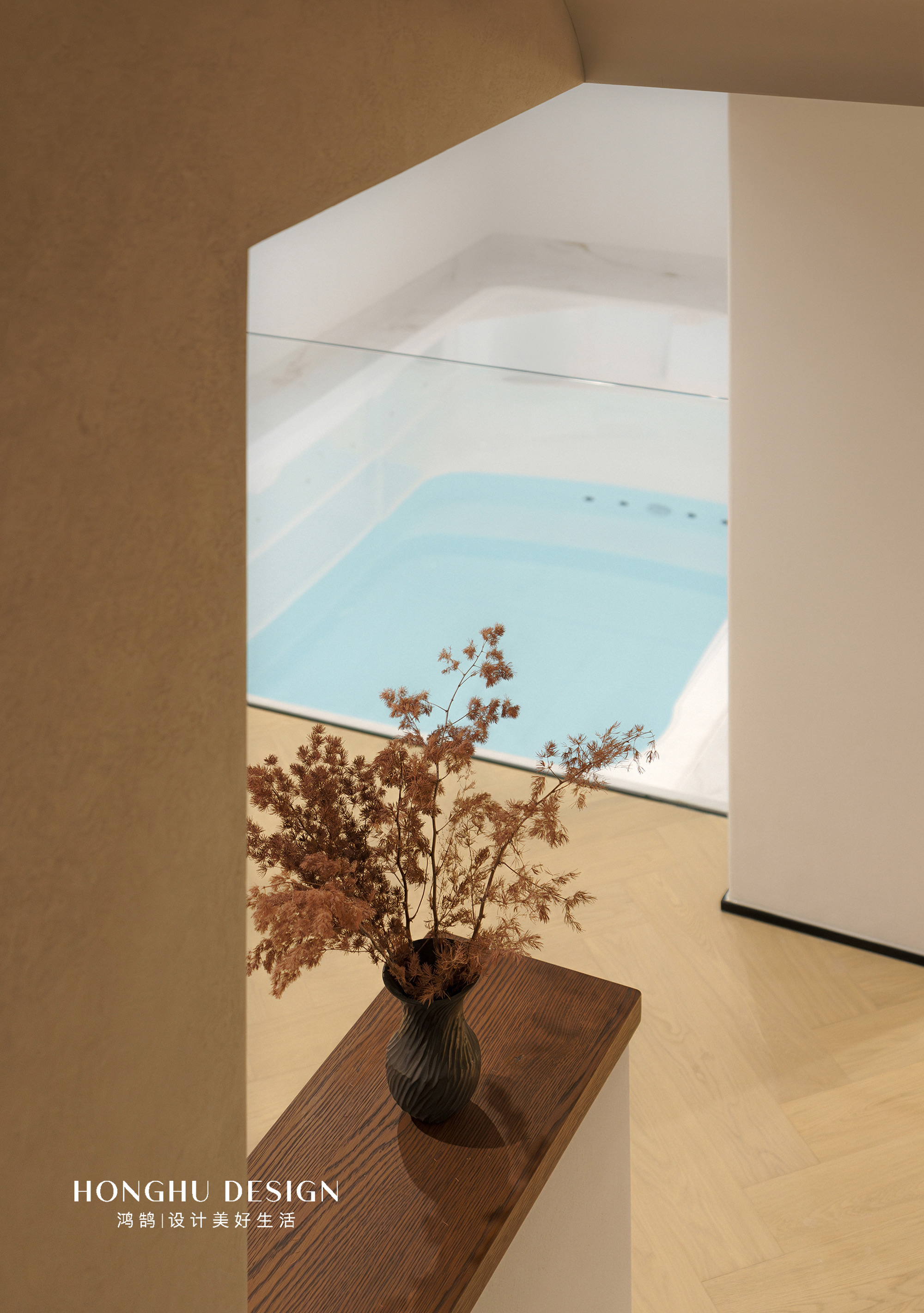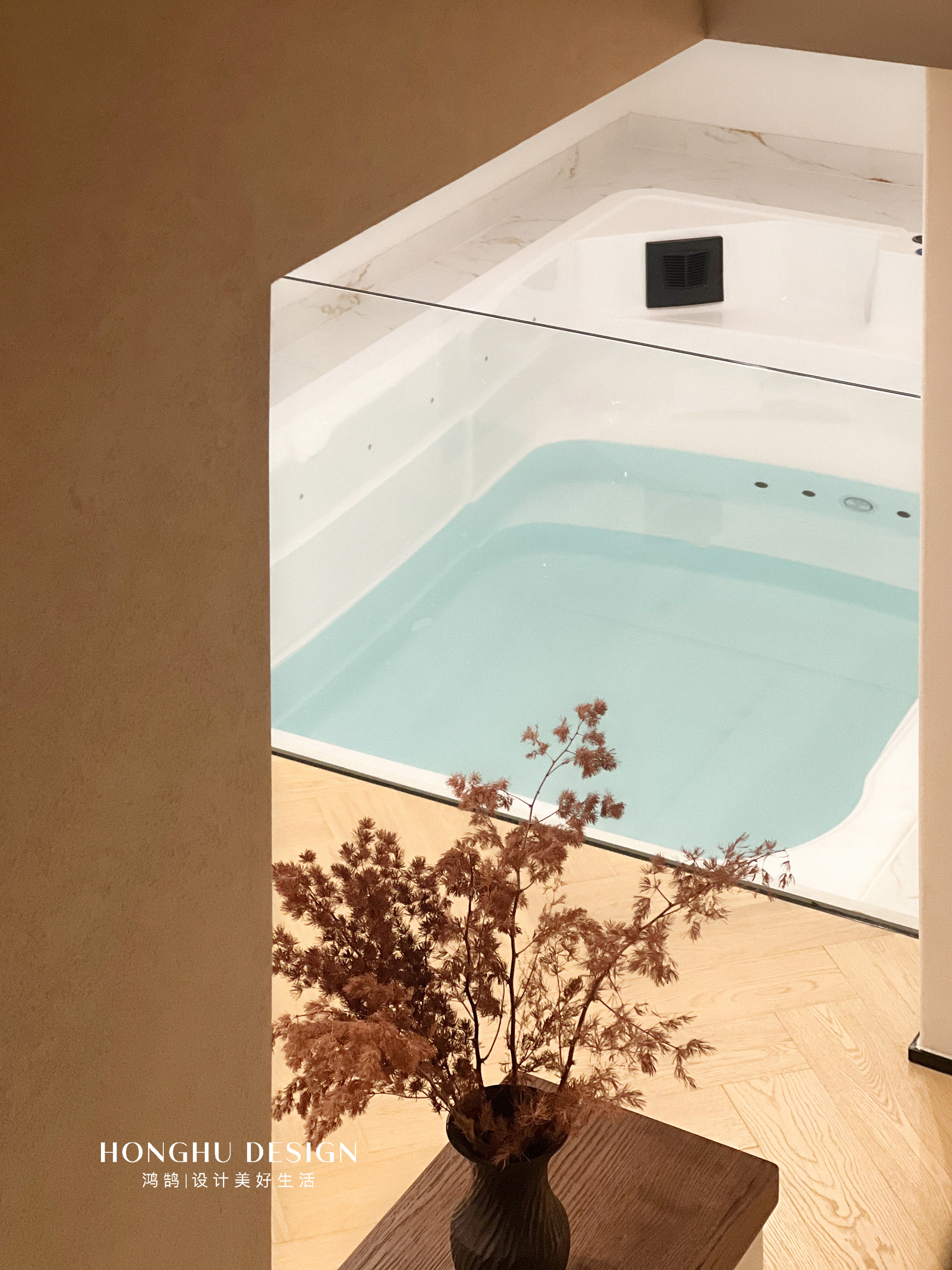 首先这个家我们在地下室启动了三恒系统,保证她的恒湿,恒温,恒氧,跟本身楼盘的精装配置也是一致的,其次设计师在泳池旁边也是增加了除湿功能的。