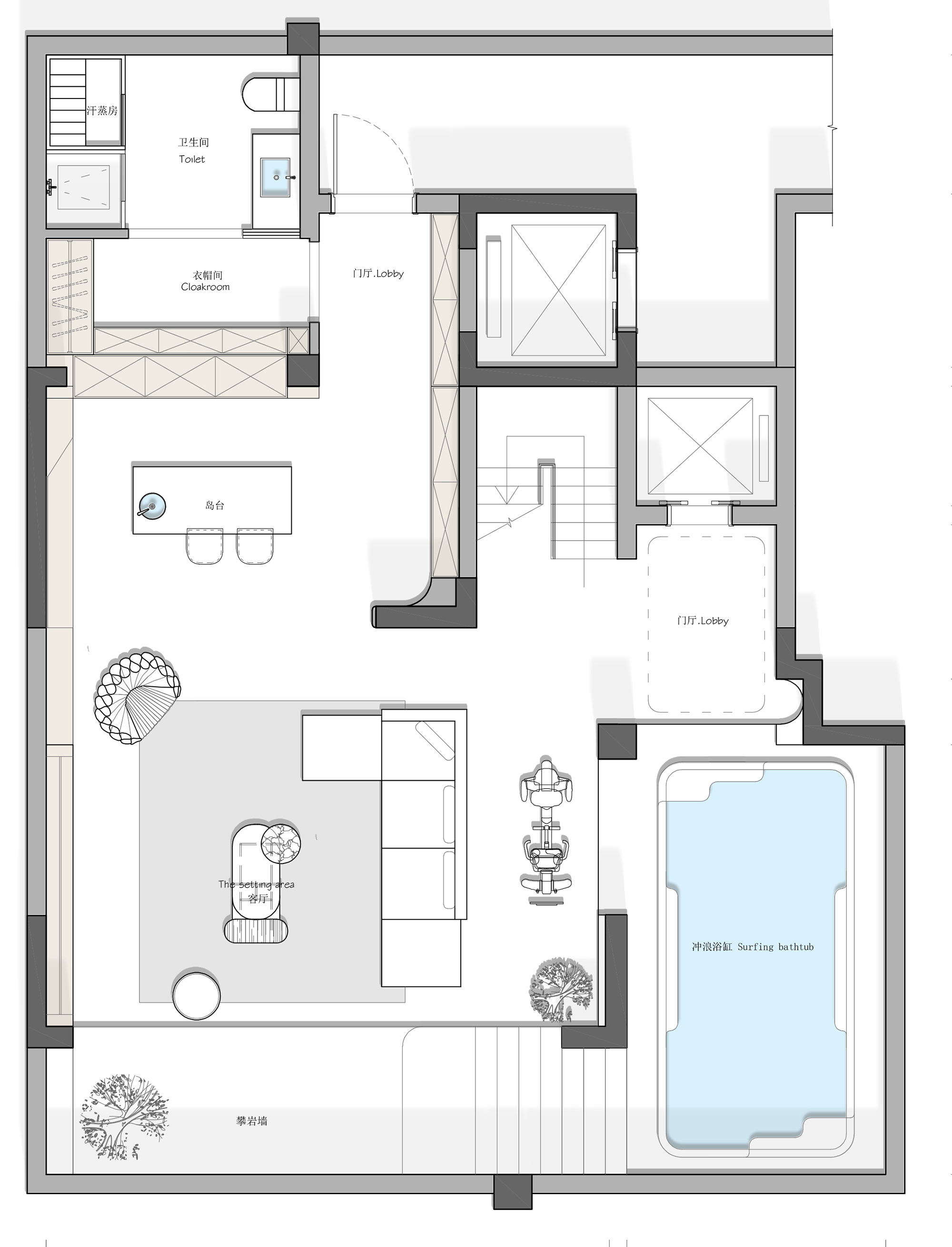 项目定位:这个家的业主是一名瑜伽老师,酷爱运动,对运动的坚持是可以让她的地下室变得很特别,有星空泳池,有整面攀岩墙,还有动静相宜的开放式书房,一切都照着她想象的样子还原。