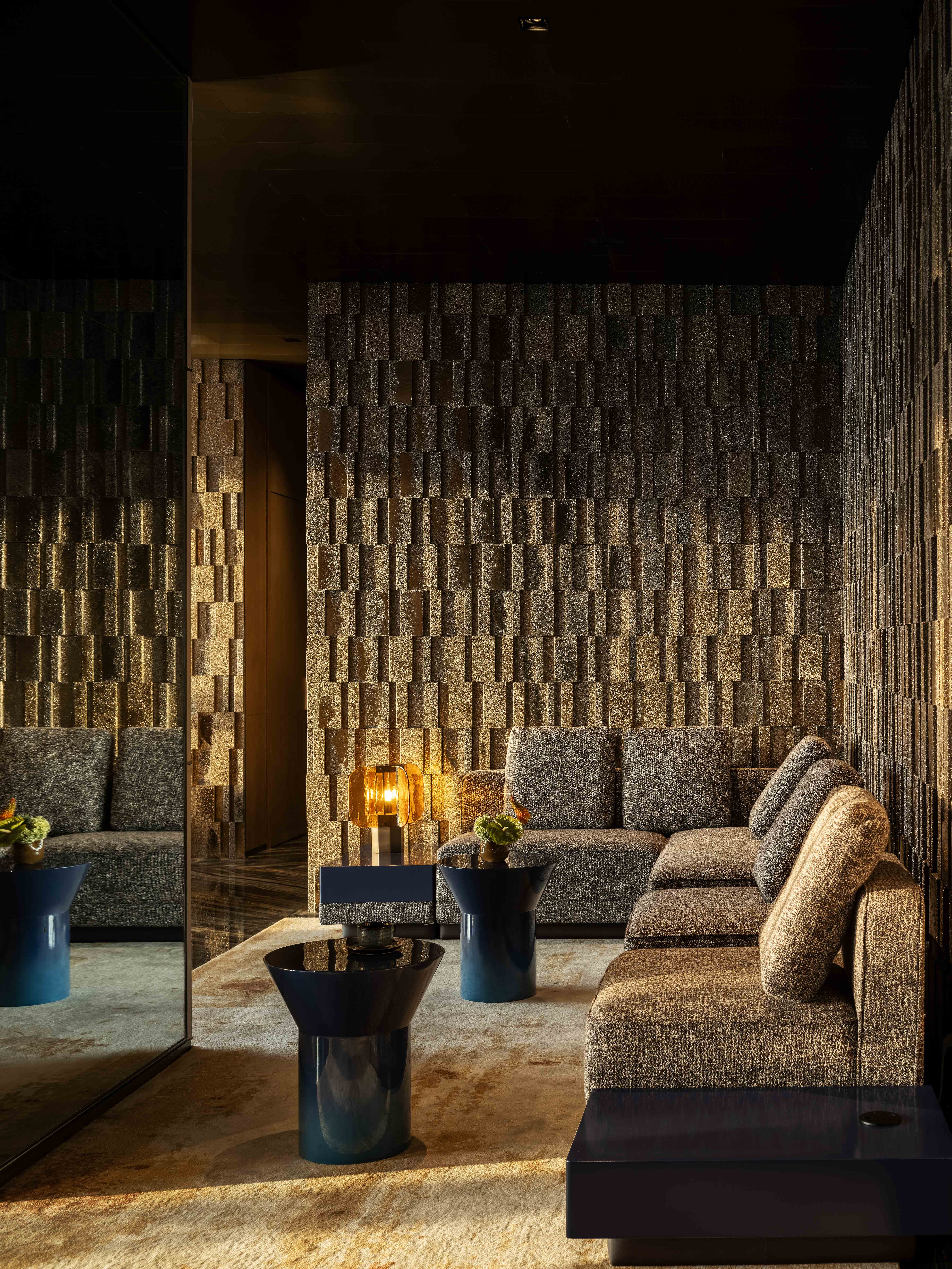 风禾尽起,盈车嘉穗。秋是收获的季节,21楼整层色调围绕秋季进行设计,墙面咖金色的艺术气泡砖和地面上印着黄色枫叶的地毯。