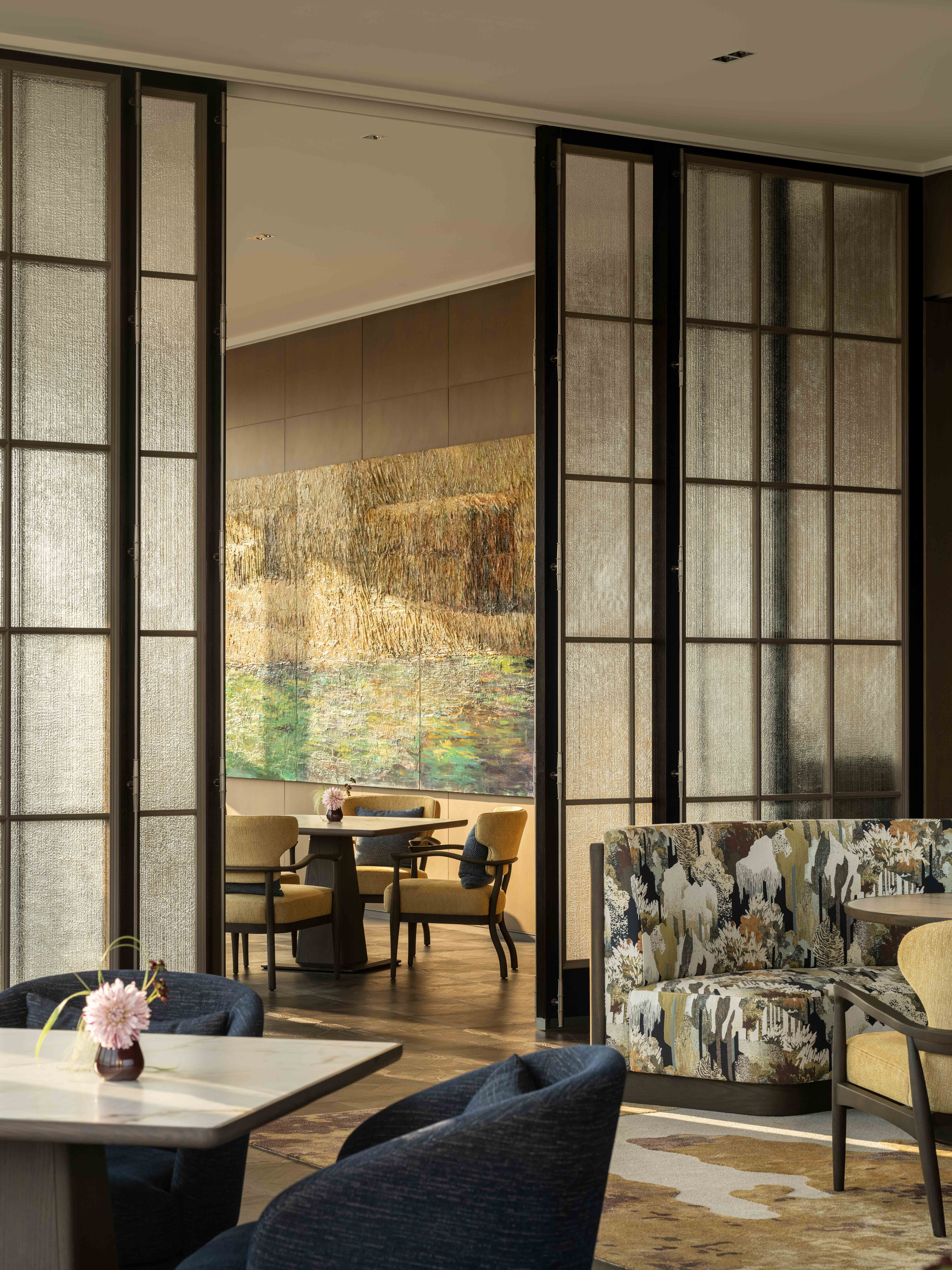 中餐厅散座区域艺术品是以植物自然生长形态为灵感创作,画面渐变。