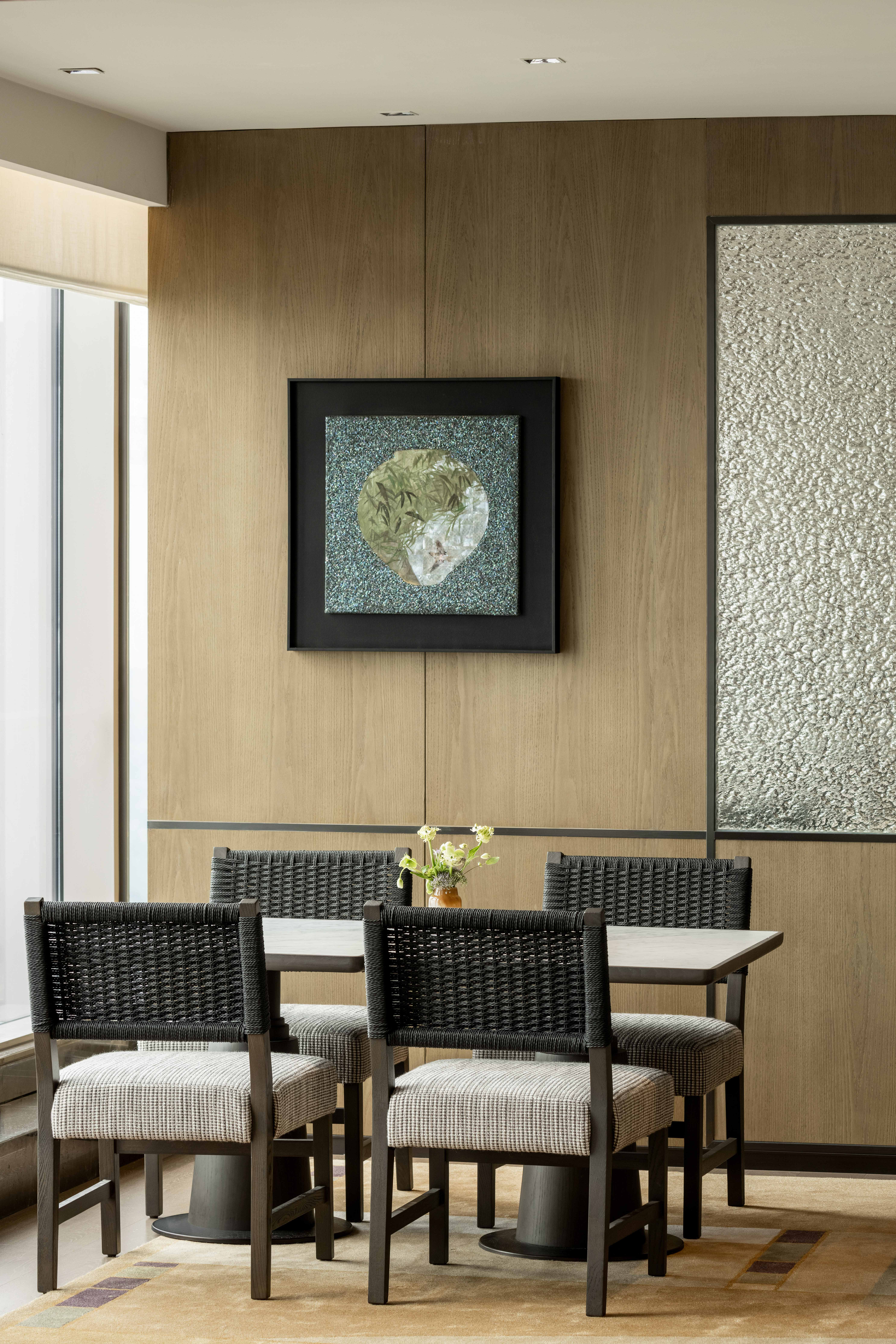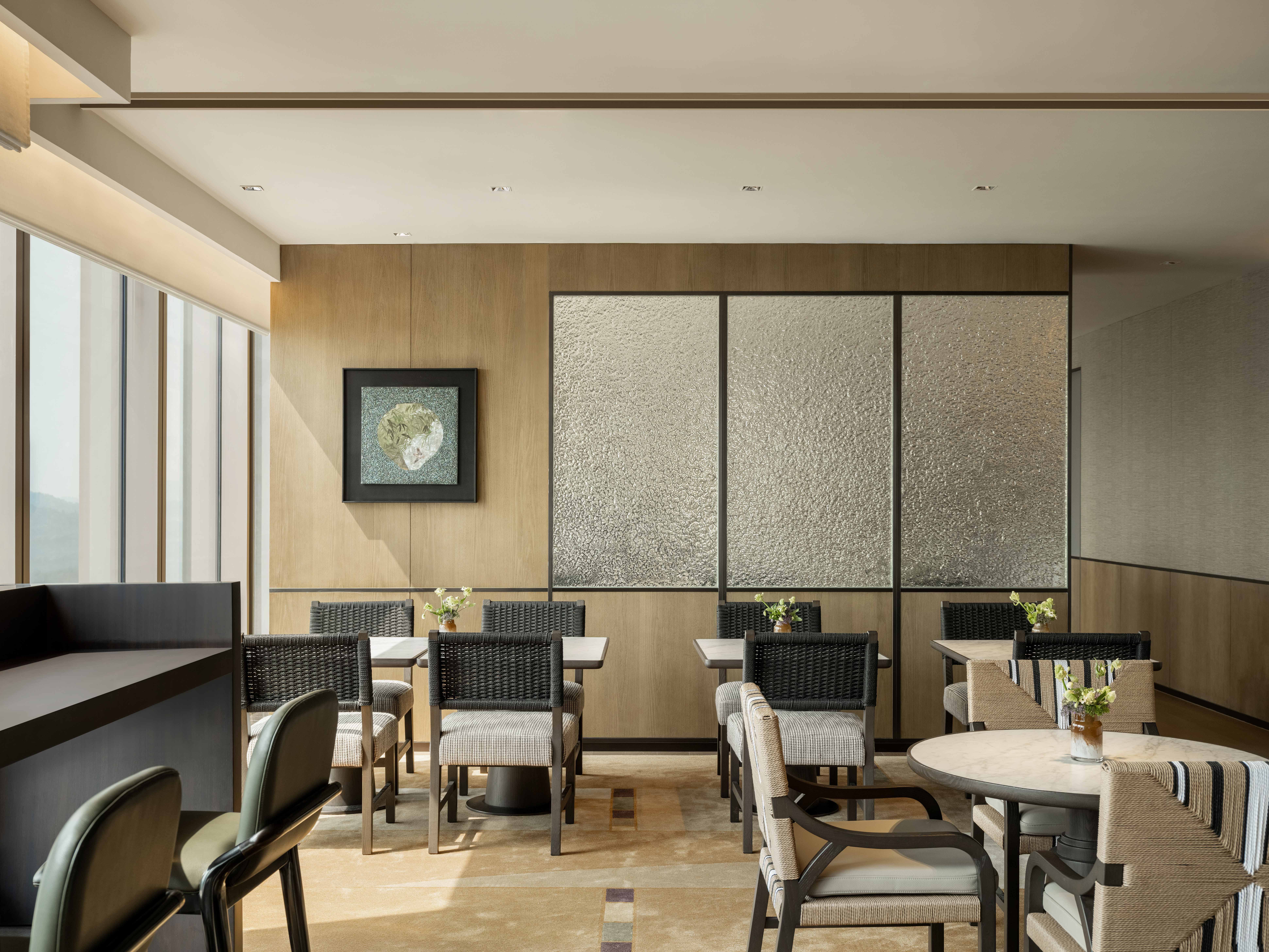 34楼行政酒廊内部,这幅长画,画面整体以防火纸来制作出马赛克的状态,作品拥有一种安静的氛围,暗示着潜藏在表面之下的更深层次的意义,黑色的肌理代表书法的痕迹,底部的马赛克如同书生行走的雪地。整体融合金属制品和柔和的色调,创造了一幅充满渴望和冥想的风景。