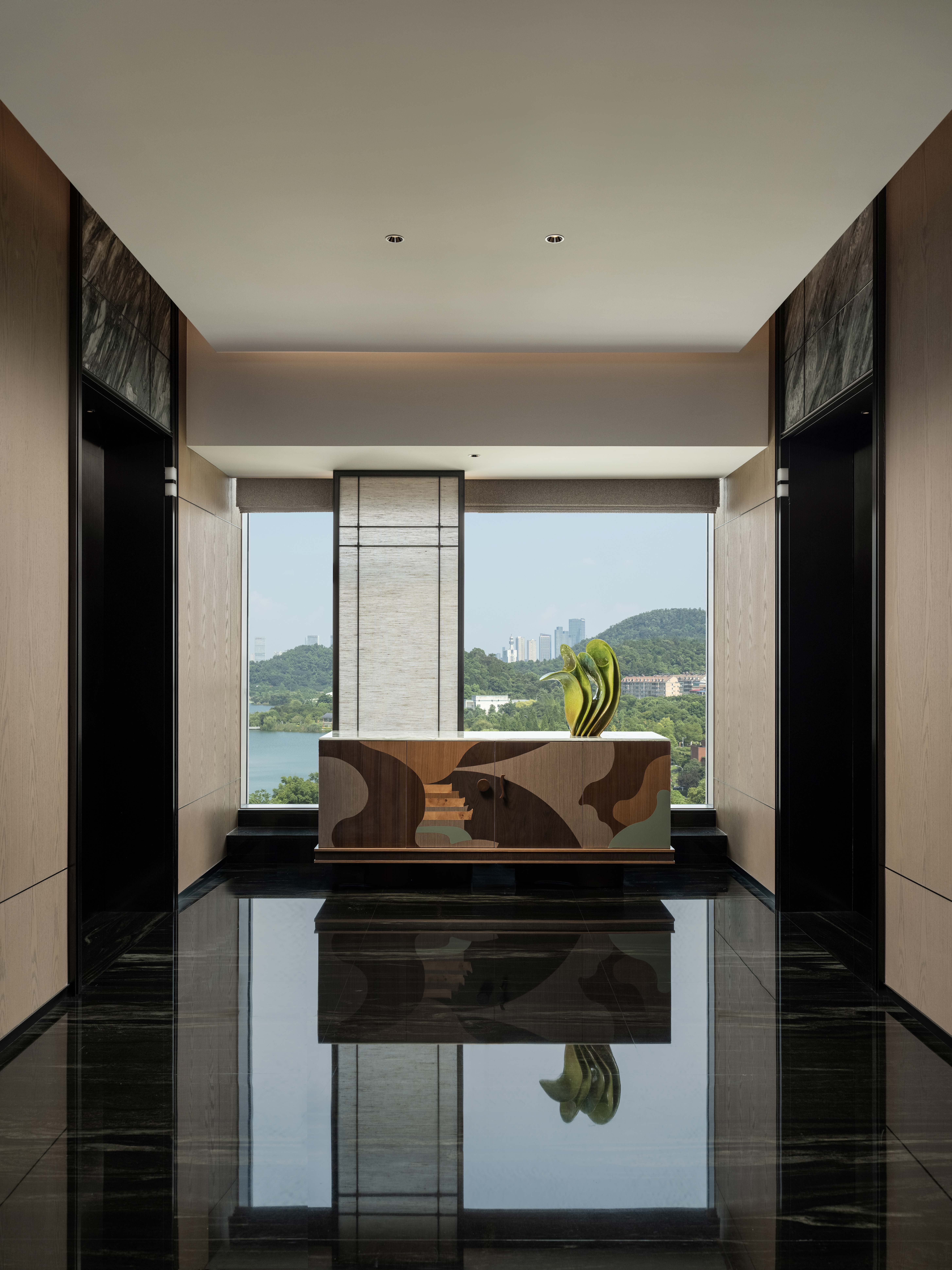 客房电梯厅,边柜灵感来源于岳麓山和爱晚亭,每一层楼的边柜台面上放置的陶瓷艺术品都是由陶瓷艺术家以宁制作的一系列作品。