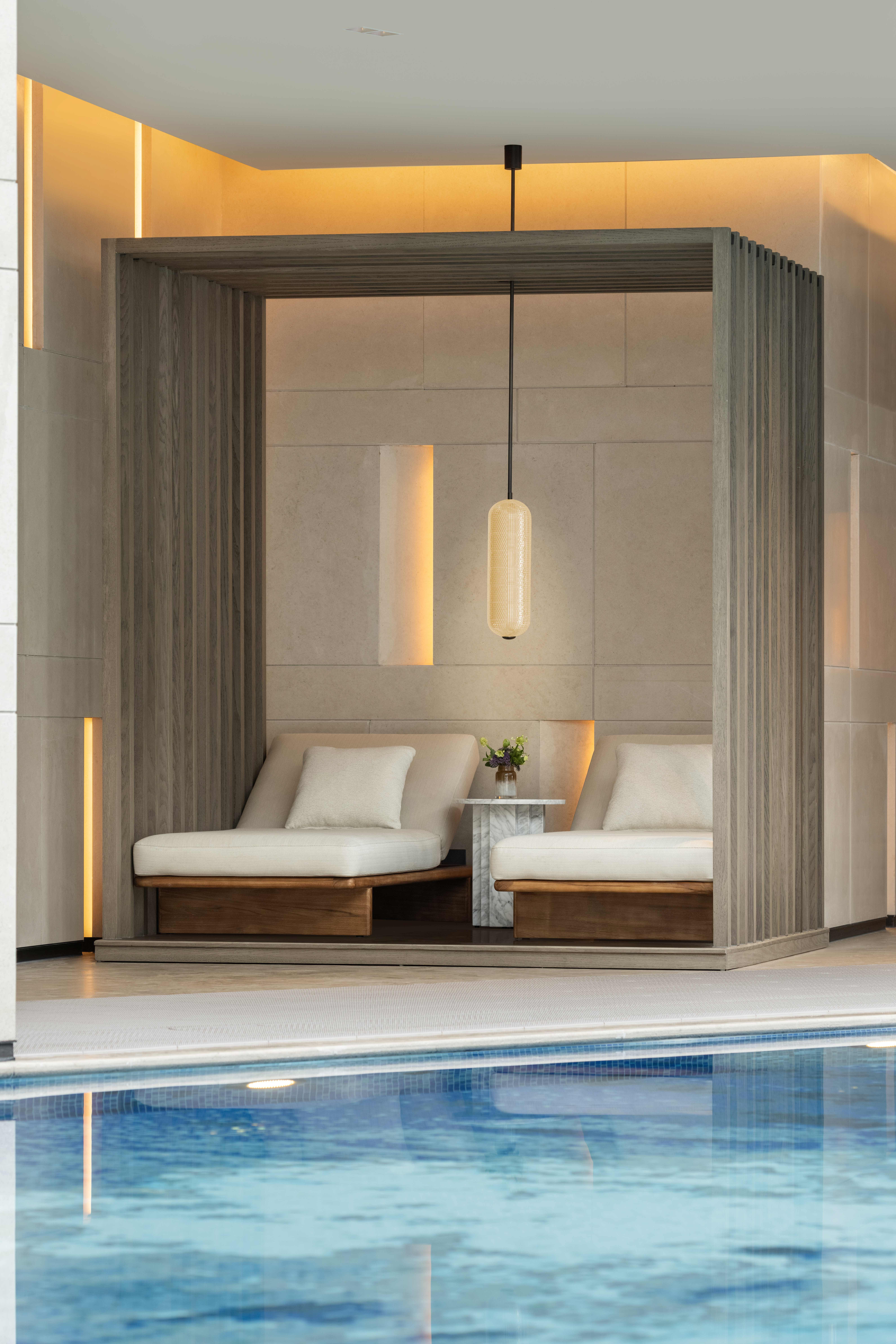 泳池区域地面蓝紫色的马赛克拼贴出丰富的画面。