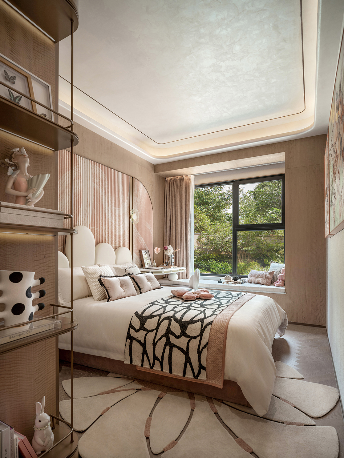 天花我们使用了天鹅绒艺术漆来替代乳胶漆,他丰富了空间的细节层次,同时成本可控。 -