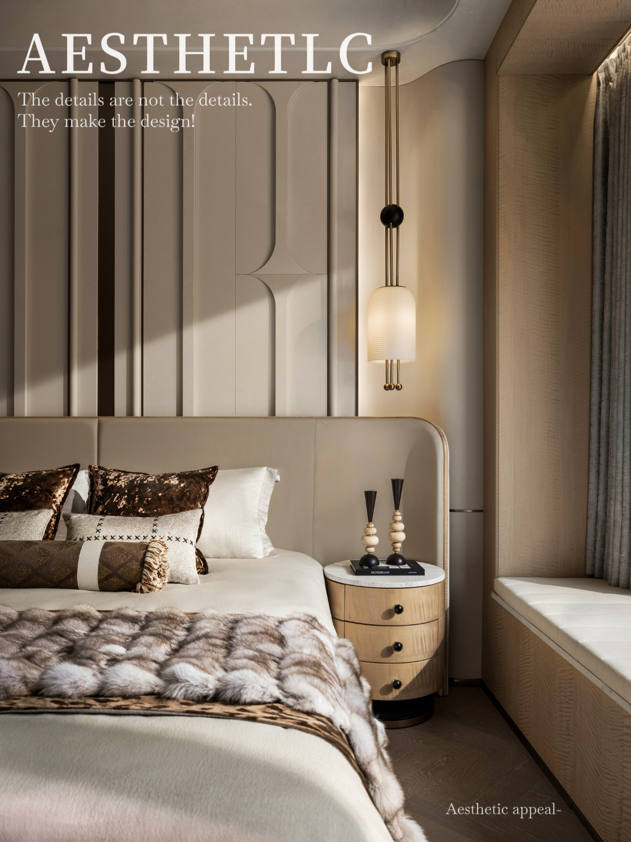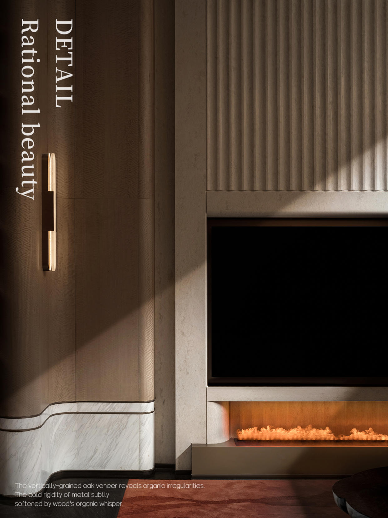 设计选材:墙面的材料我们用了非常少见的枫影木,他表达了这种大纹理带来的奢华感。同时他颜色非常的温润、柔和。让客户在参观时既能感受到高端酒店的品质,又能想象到日后居住时的舒适与温馨。