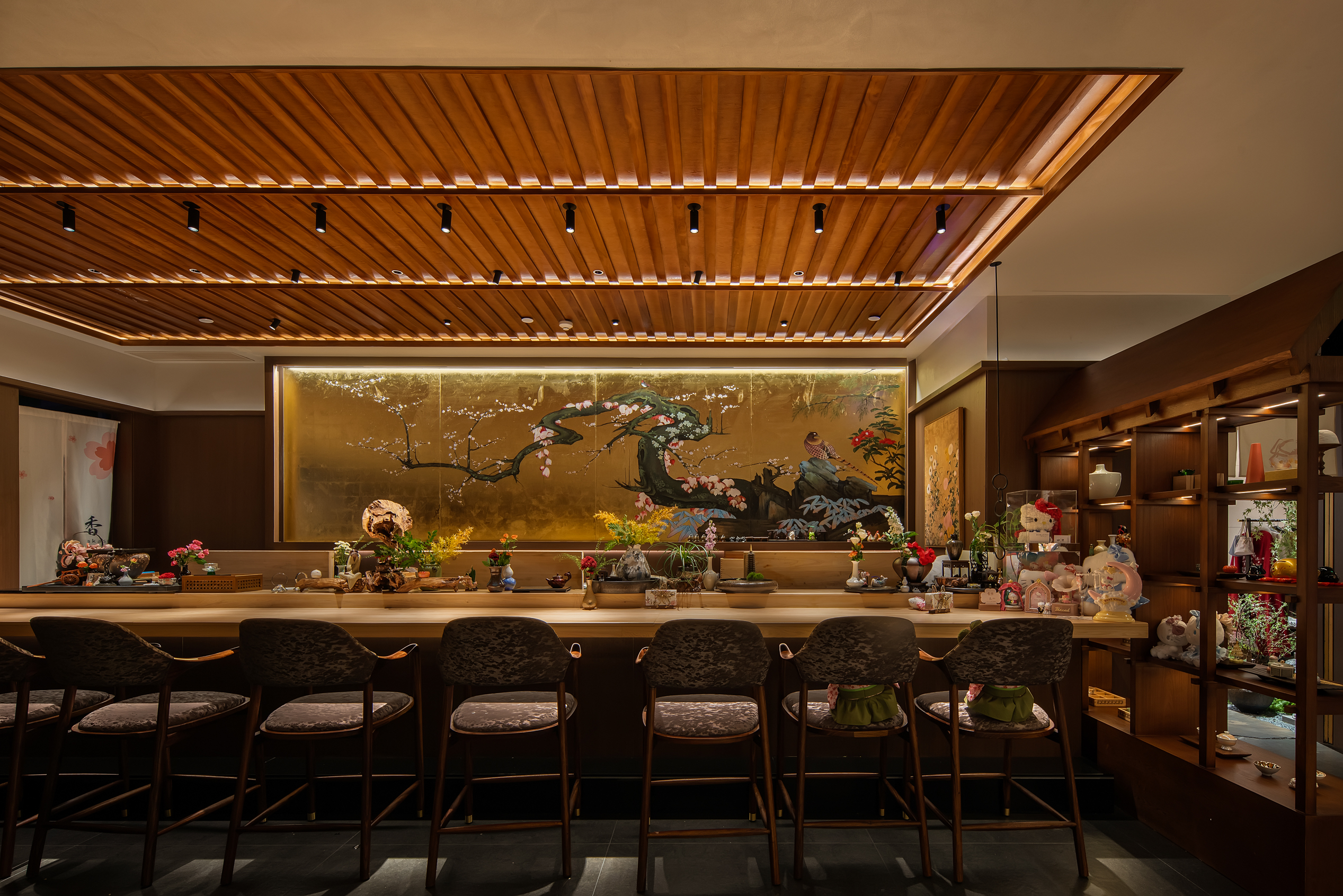 板前的背景是用金箔做的江户时期的名画-《梅花游禽图》。