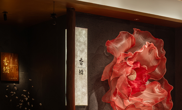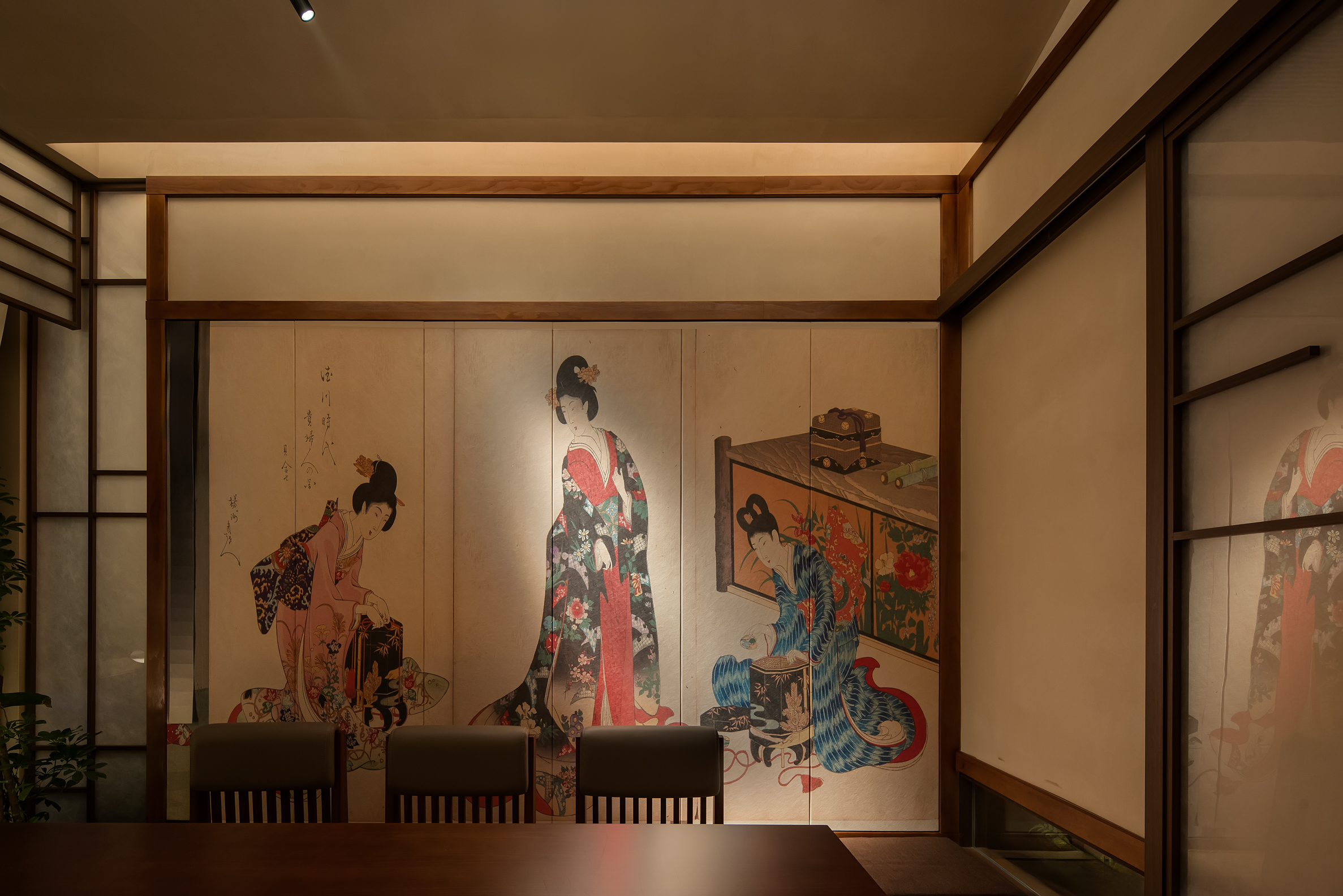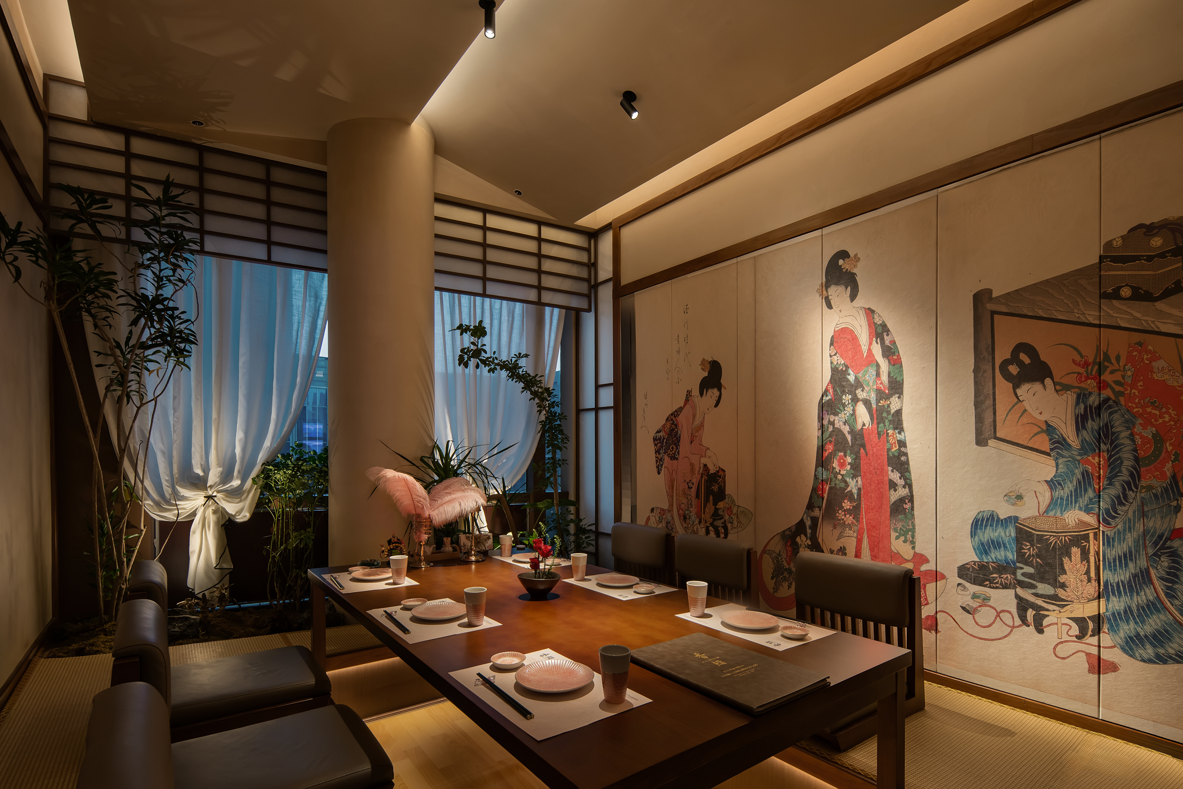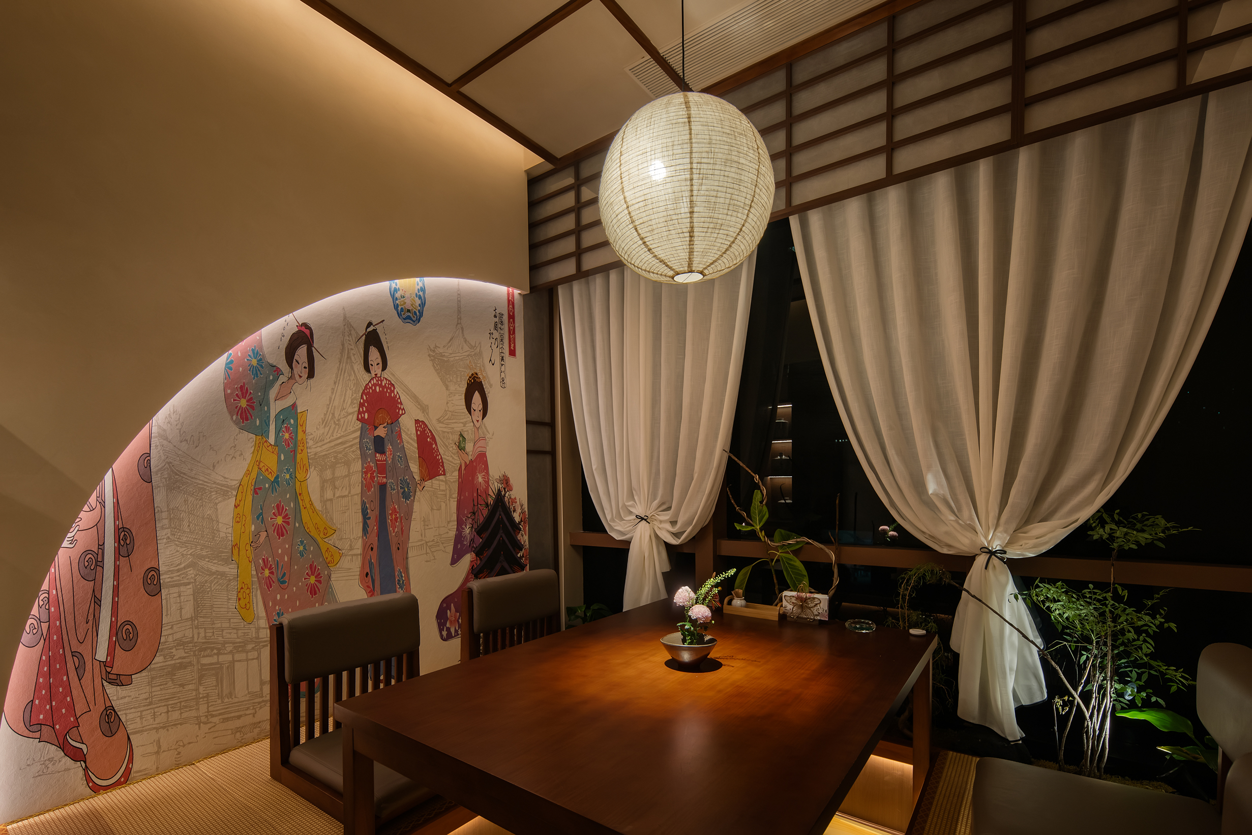色彩搭配:空间主色调以“浅木色+深棕”为基底,奠定温润、内敛的日式基调;浮世绘壁画的红、棕、金等色彩作为视觉亮点,打破单调的同时,呼应日式传统色彩中的“浓淡相生”;软装花艺的低饱和粉色、红色,与餐具的米白色陶瓷、原木色筷架形成色彩呼应,让空间色彩在统一中富有变化。