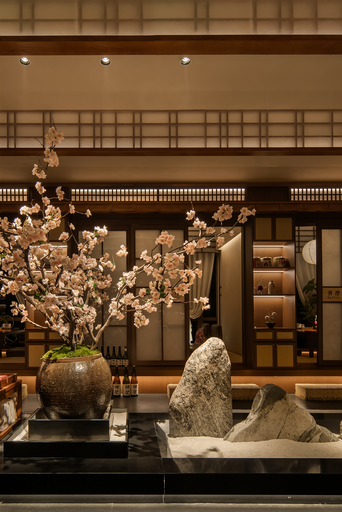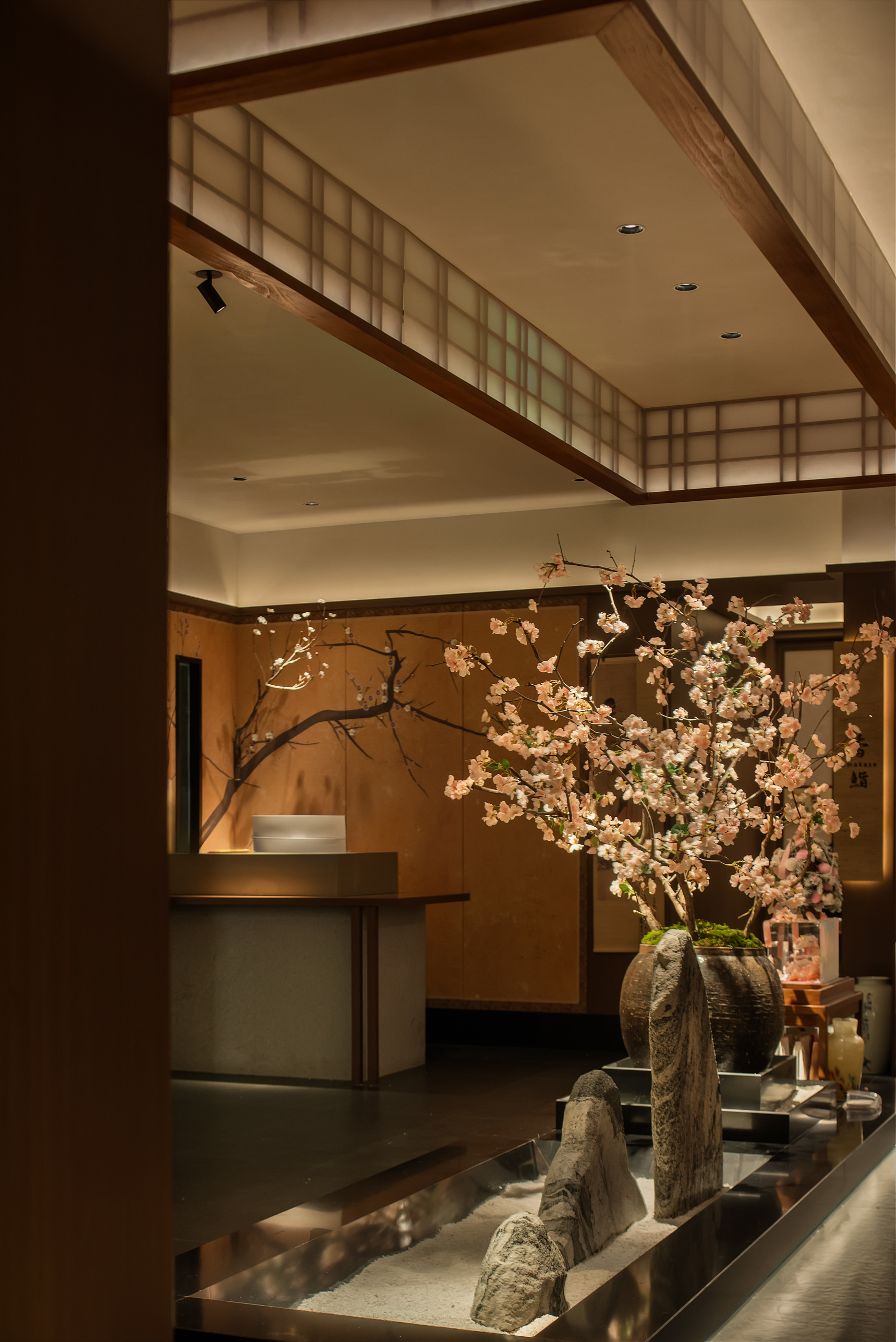 空间中,枯山水造景是视觉核心:原石叠砌的山形搭配细沙铺就的“水纹”,凝练出日式园林的写意意境;旁侧古拙的粗陶花器中,樱花枝舒展绽放,柔美的花艺与冷峻的石景形成刚柔对比,为空间注入鲜活生机。