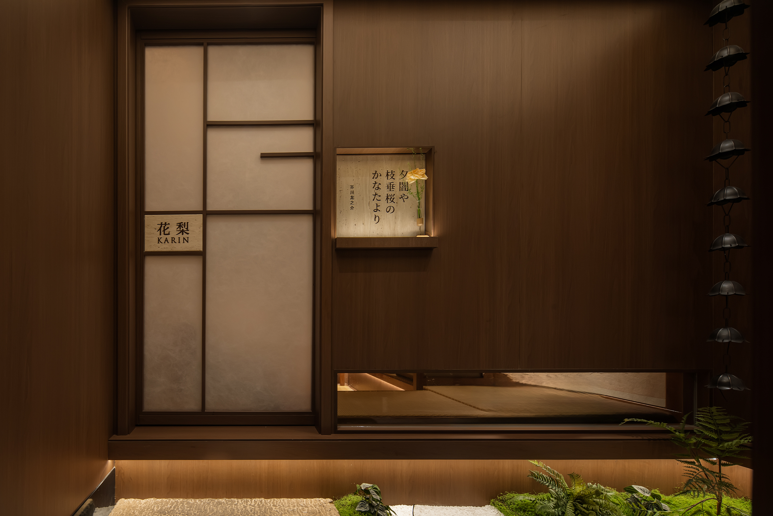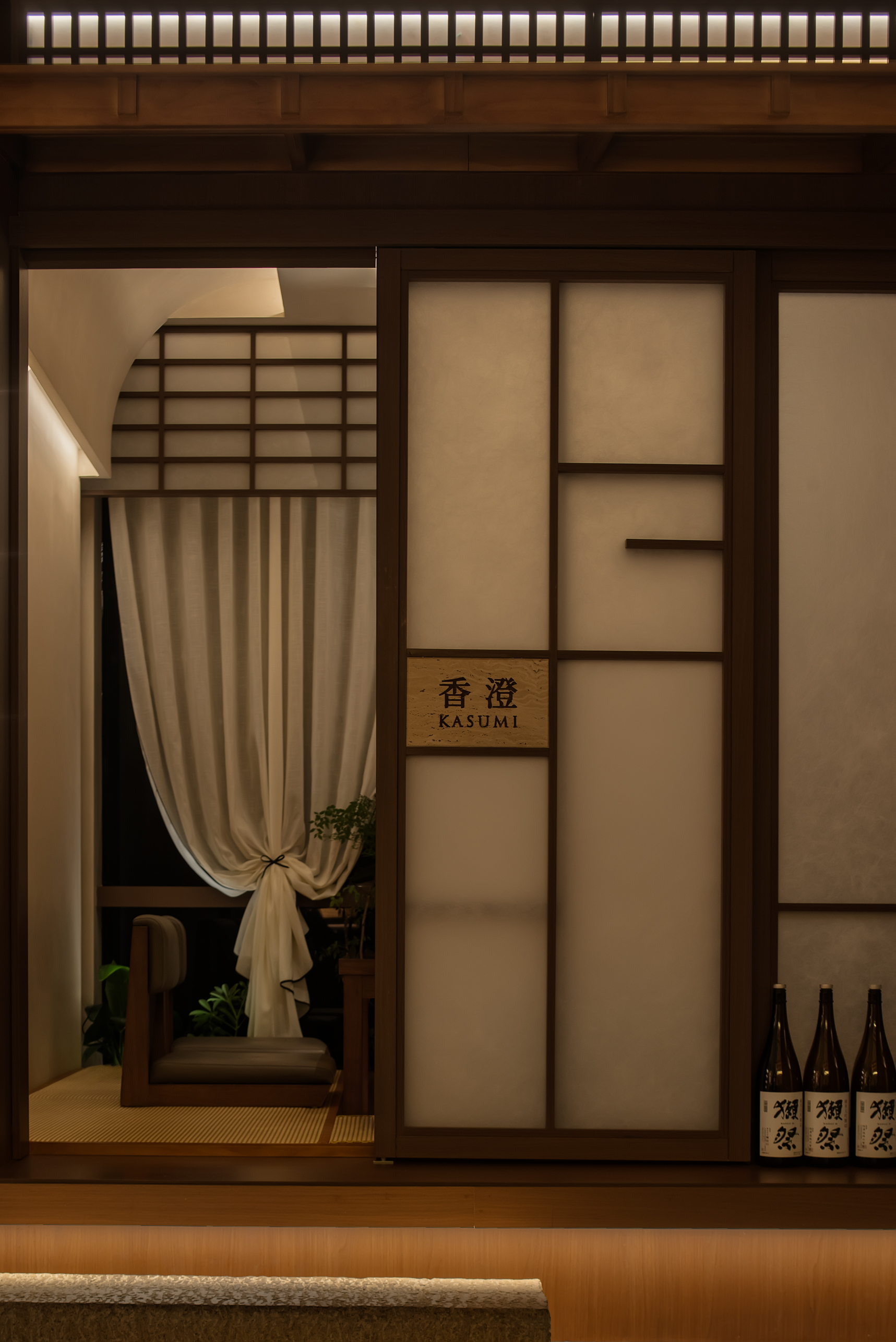 背景沿用日式经典的格子推拉门与木格栅,浅木色与暖调灯光交织,既保留了和式建筑的通透感,又通过层叠的木质结构营造出丰富的光影层次。细节处的酒器、置物格等陈设,则让空间兼具功能性与日式居酒屋的闲适韵味,整体在简约中沉淀出东方禅意的静谧与雅致。