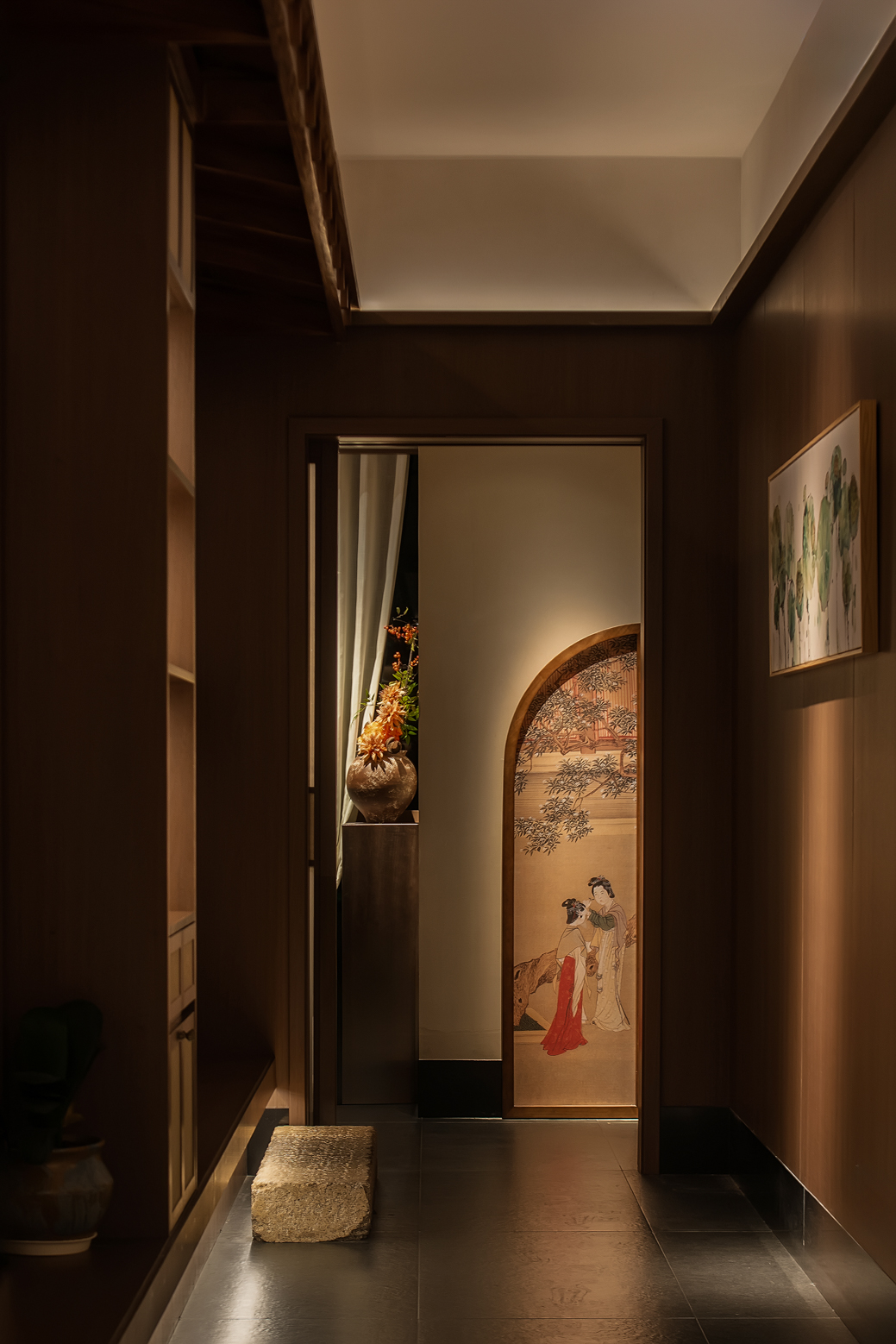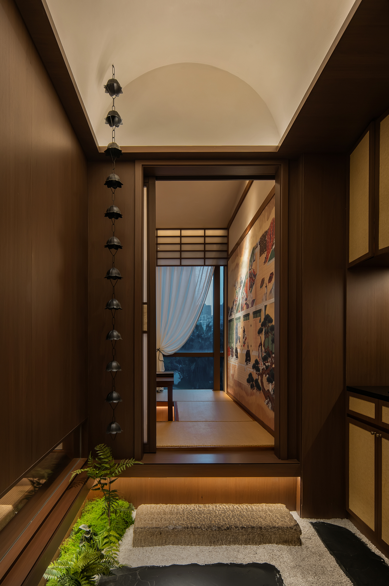 节处的酒器、置物格等陈设,则让空间兼具功能性与日式居酒屋的闲适韵味,整体在简约中沉淀出东方禅意的静谧与雅致。