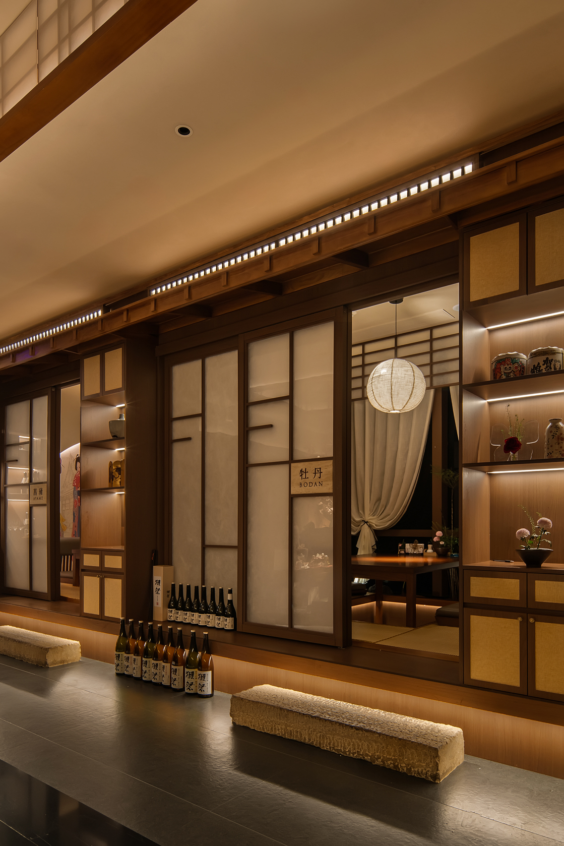 包厢的立面沿用日式经典的格子推拉门与木格栅,浅木色与暖调灯光交织,既保留了和式建筑的通透感,又通过层叠的木质结构营造出丰富的光影层次。细