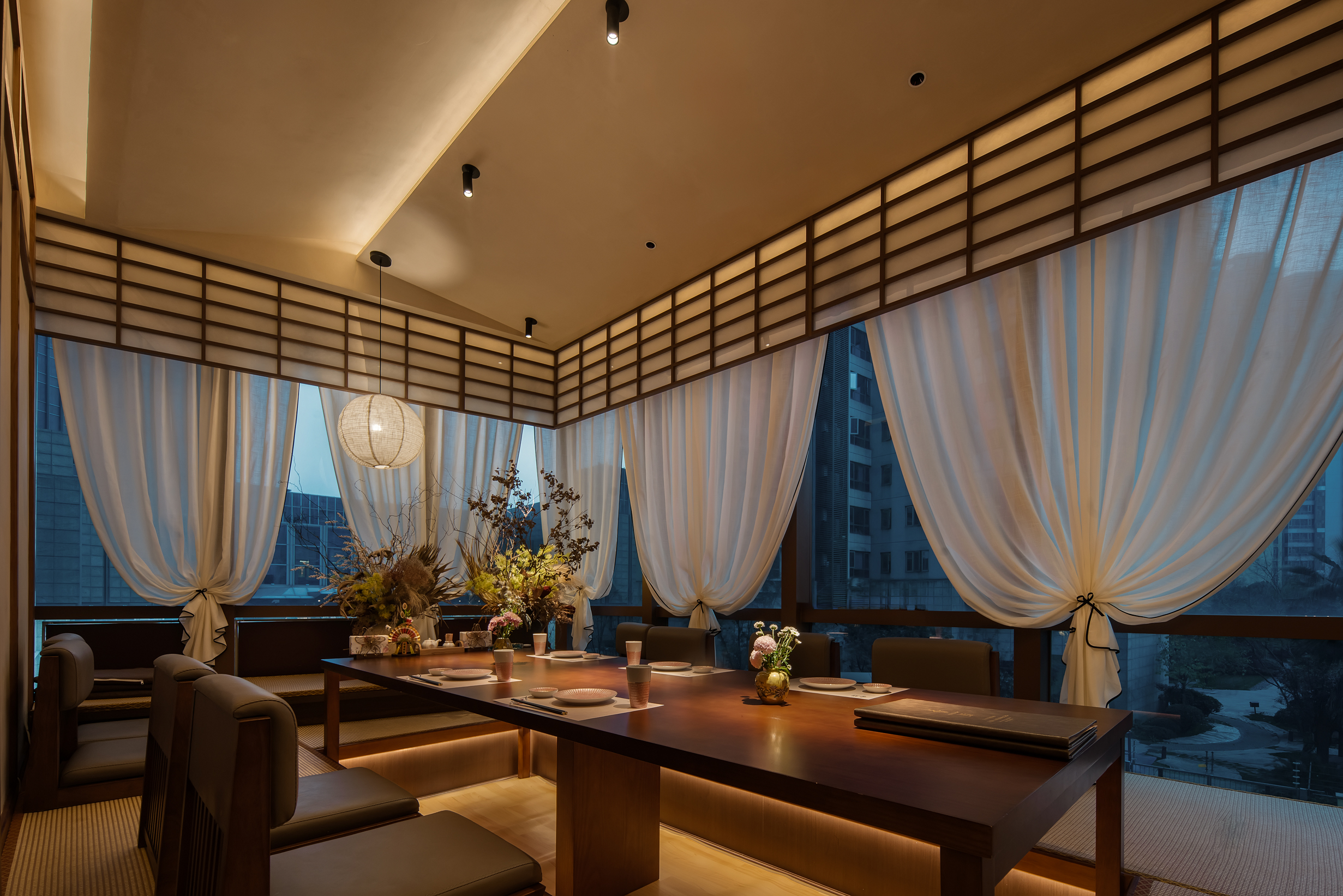 移步入内, 包厢内采用“围合式”布局, 以长形实木餐桌为视觉中心, 餐桌保留自然木纹与结疤, 呼应日式“自然为本”的理念。