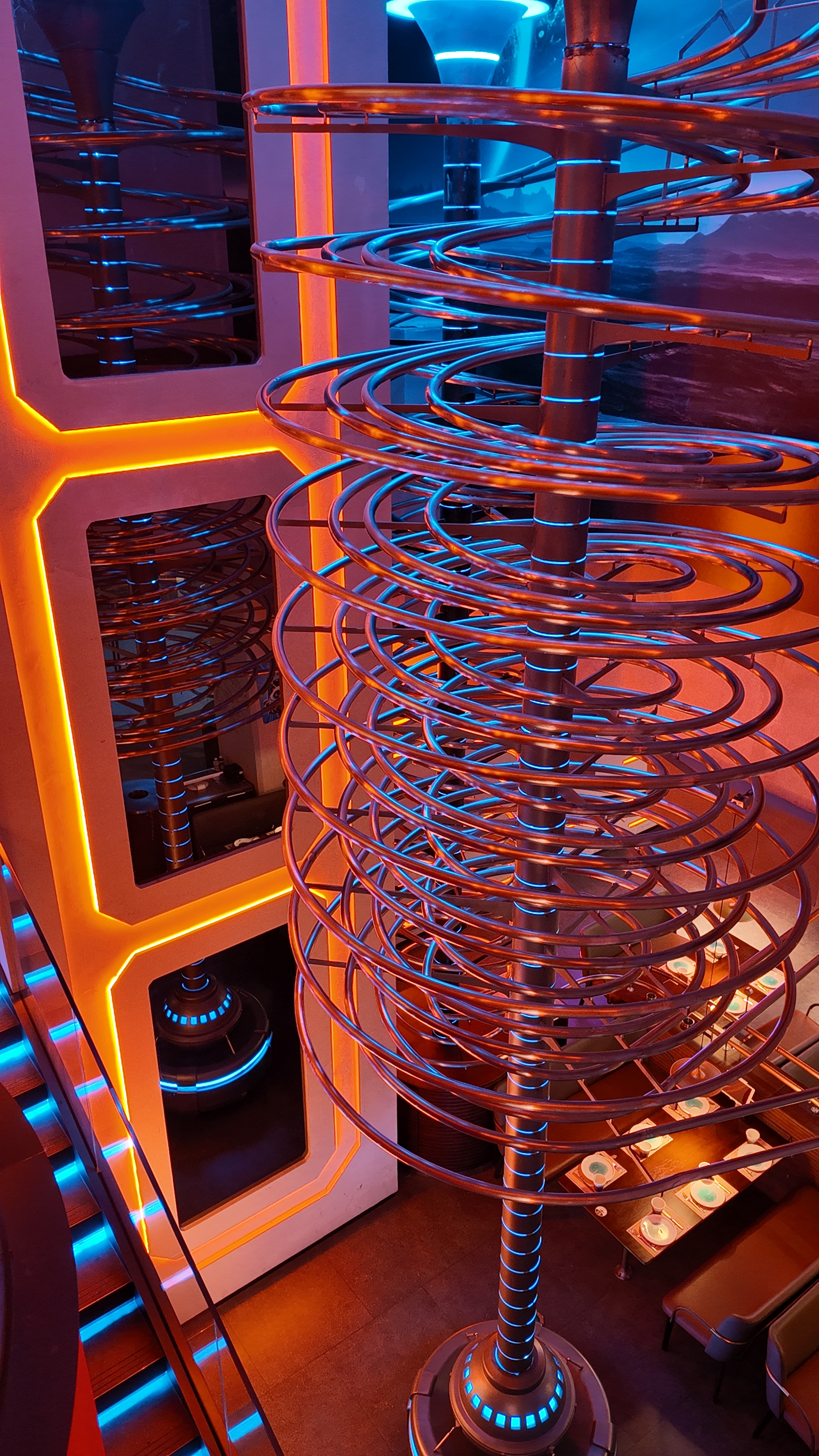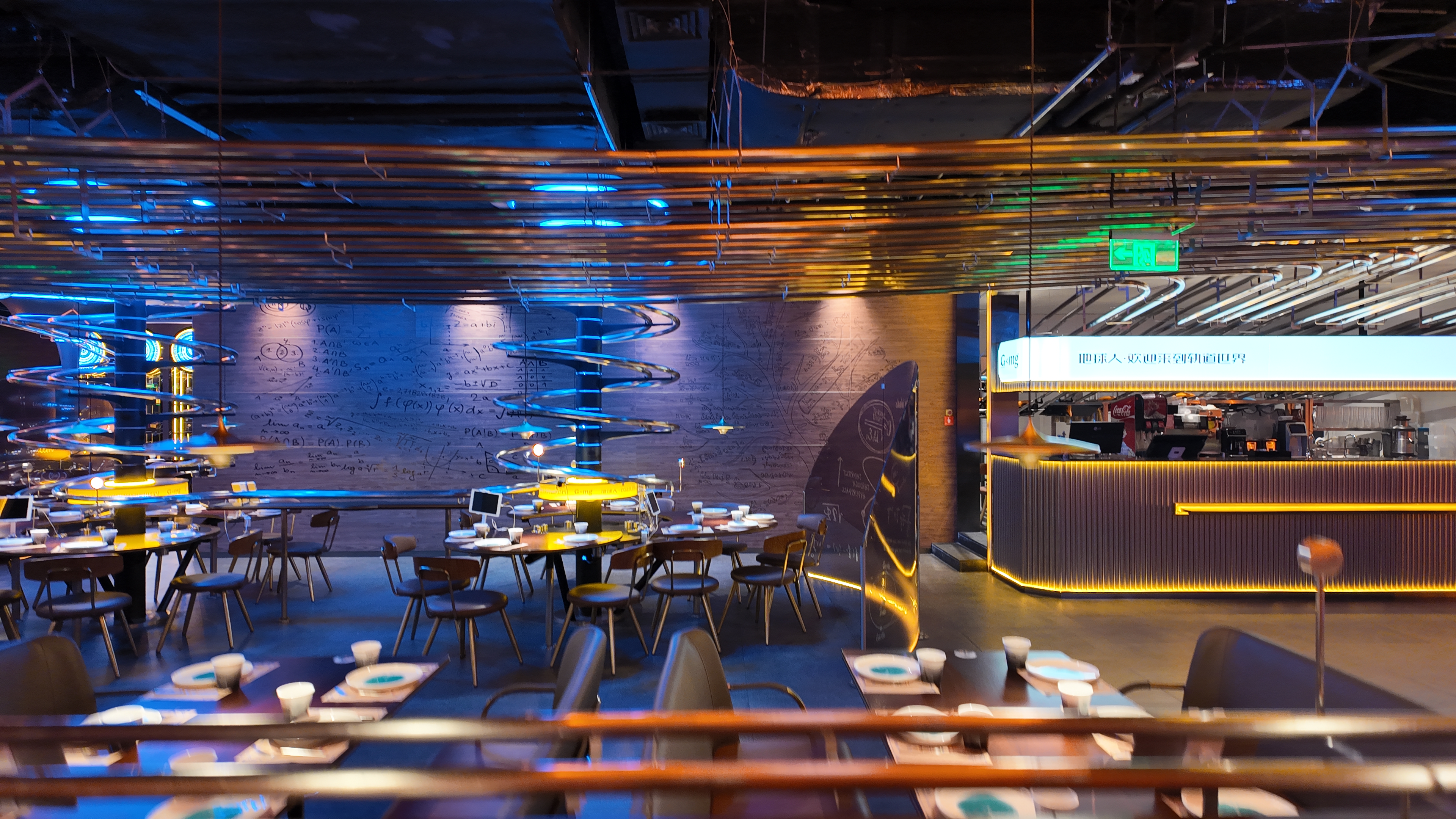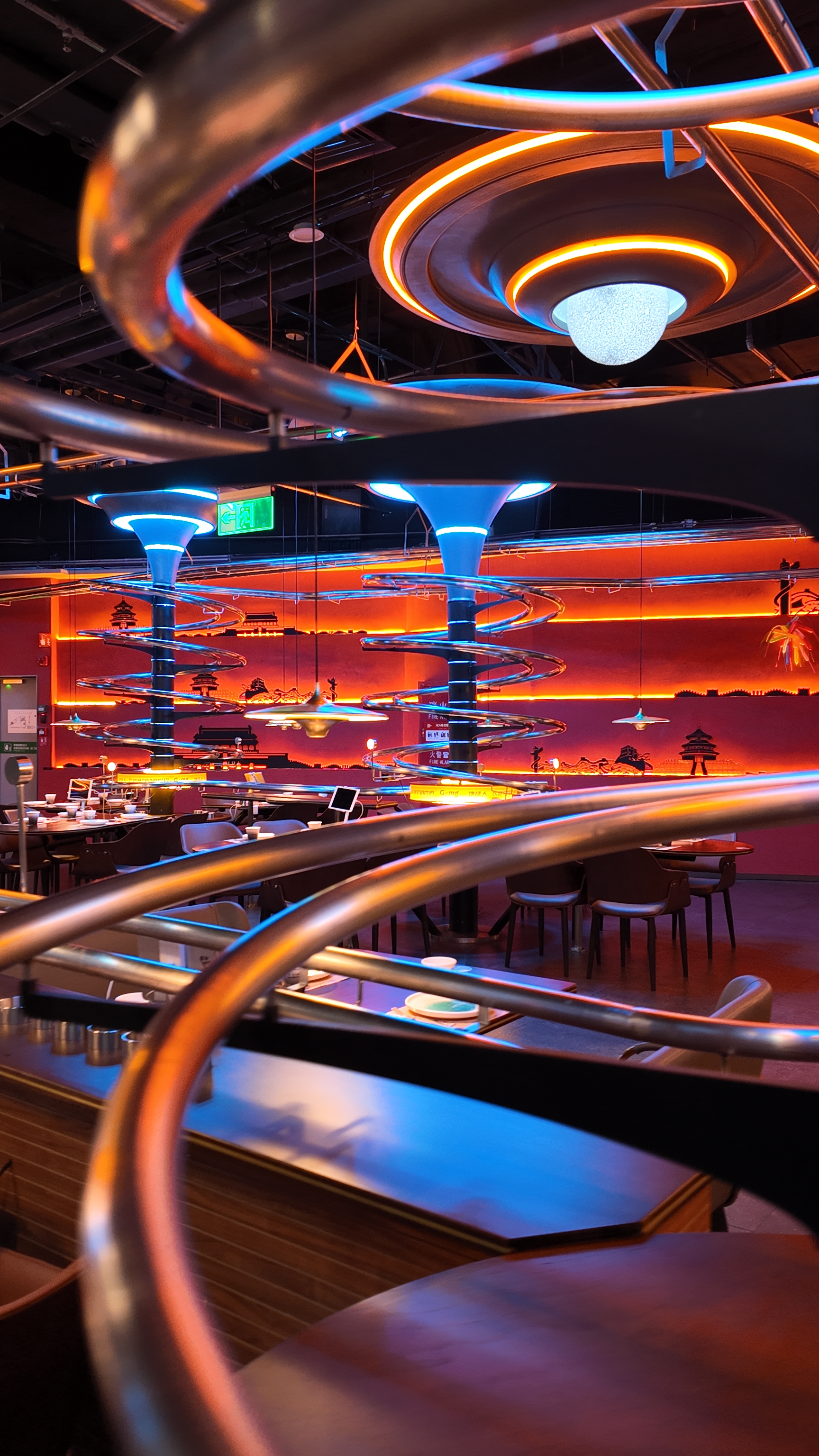空间意境:食物通过炫酷的螺旋轨道直接传送到你面前!在这个高级感十足的工业环境中,你可以通过iPad轻松自助点单。更有趣的是,还有智能机器人为你送餐,让用餐体验更加别具一格。