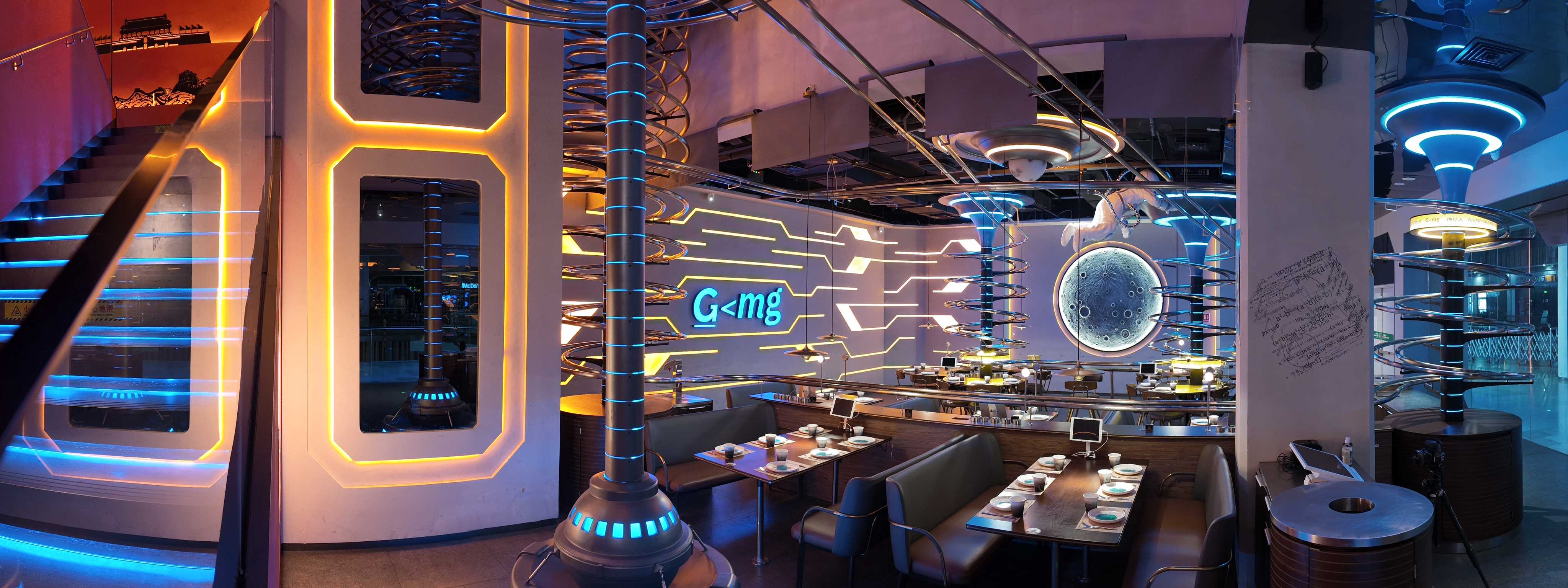 项目定位:失重餐厅(Spacelab)是一家以科技为主题的西式简餐餐厅,该餐厅的核心特色是利用失重原理,通过双螺旋轨道系统将菜品快速传送至餐桌,顾客可体验自动化点餐和机械化送餐的科幻氛围。