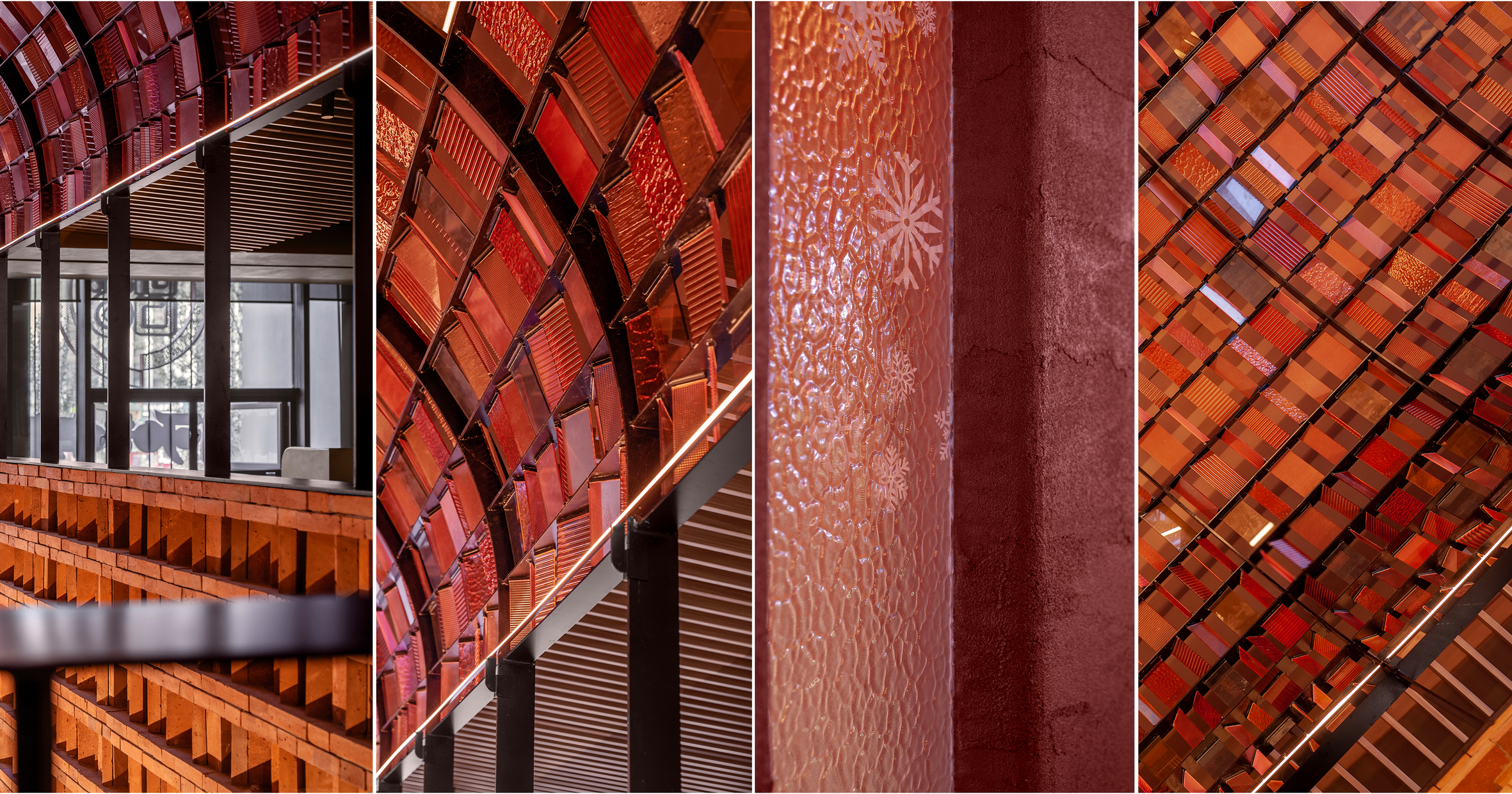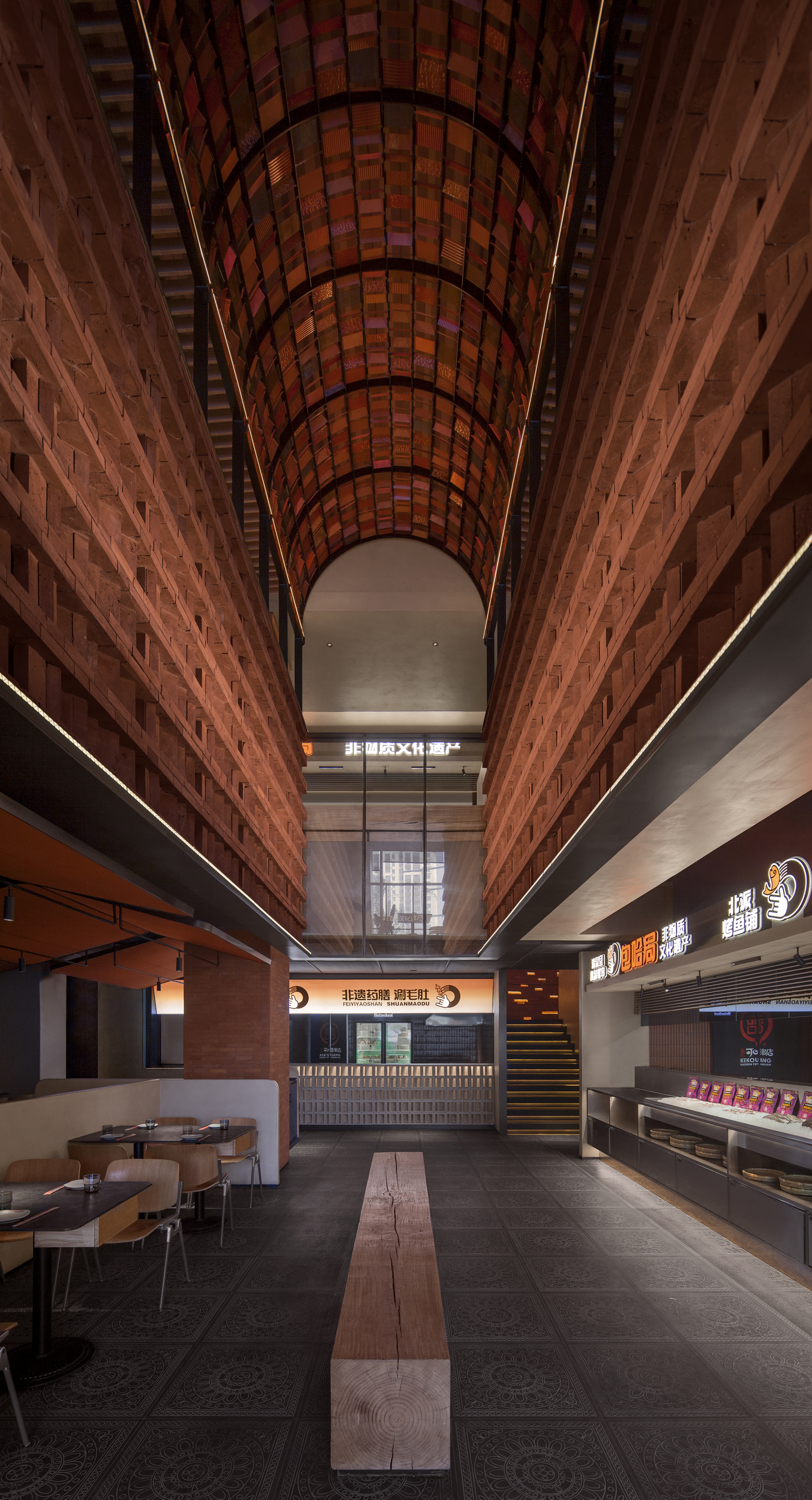 设计选材:运用回收红砖,减低造价大面积使用环保涂料,石材改用瓷砖,最大限度保留空间形态。