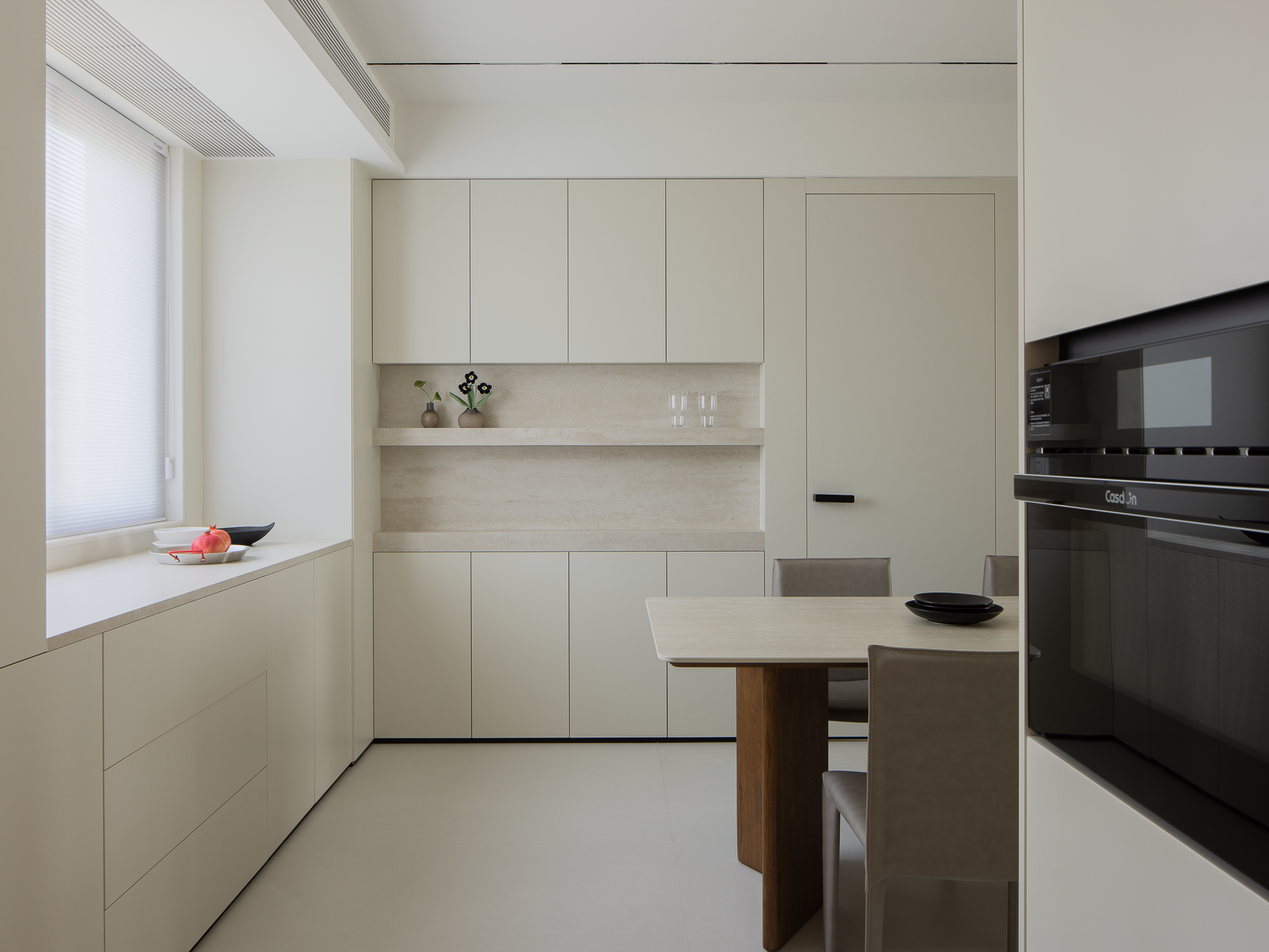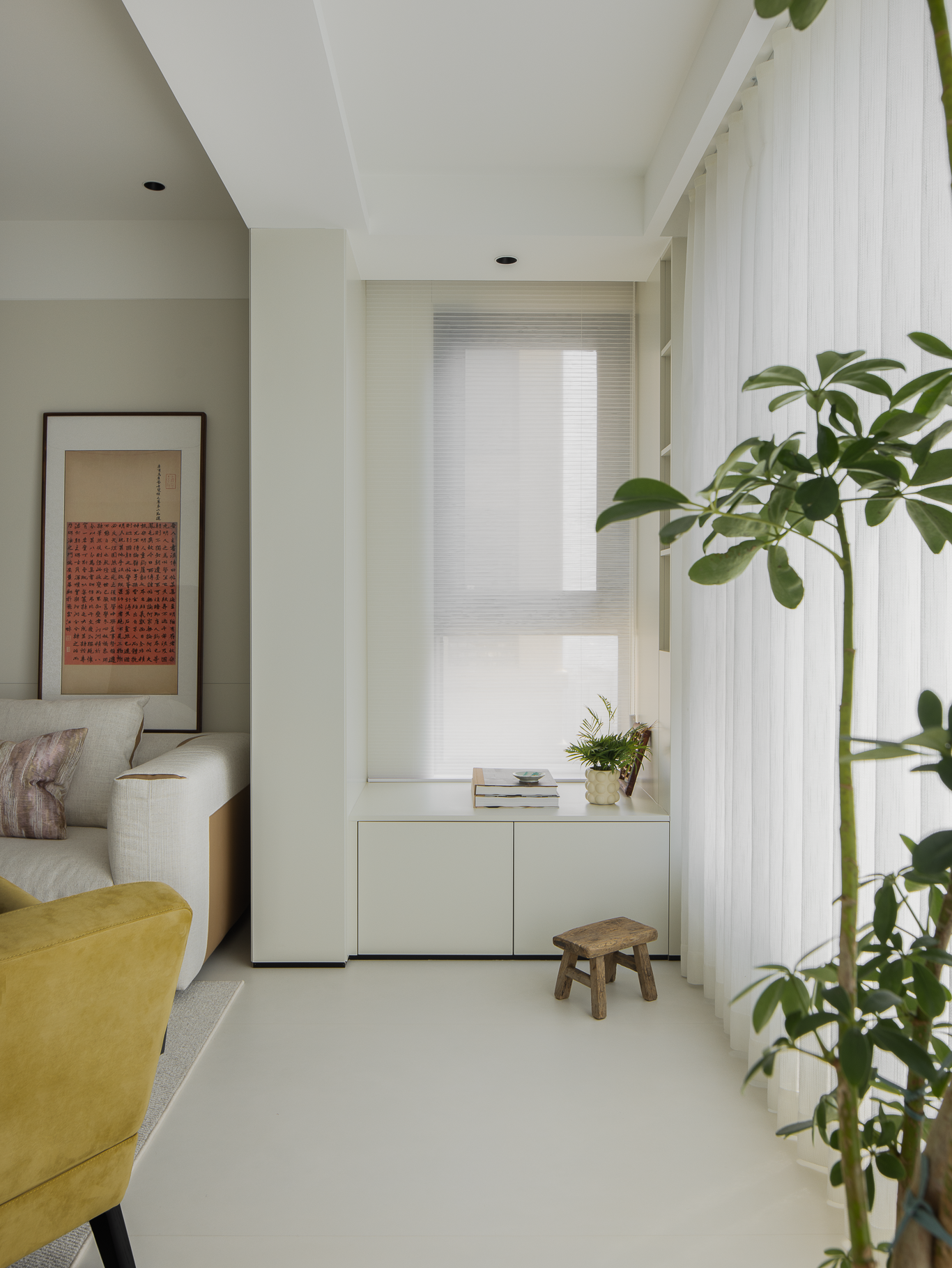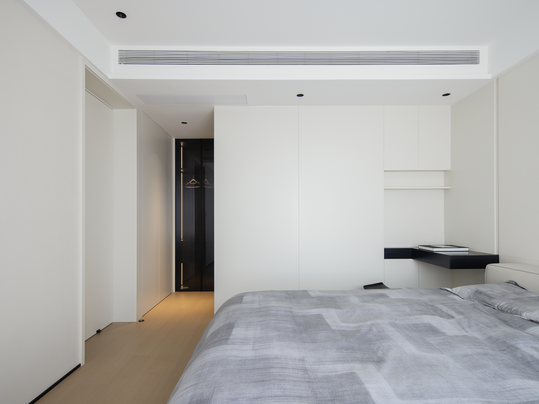 空间意境:在整体的色调选择上,我们以纯净的白色与温润的木色作为空间的主旋律,以简洁而纯粹的方式,勾勒出温暖舒适的氛围。空间上摒弃了冗余的装饰元素,转而以简洁有力的体块语言塑造格局,通过定制化的收纳柜体作为空间的“骨架”,既承担起分隔区域的功能,又让整体布局更显统一。无论硬装还是软装,皆以哑光质感材质为主导,触感所及皆是细腻的温润质地。在光的作用下,这些由材质共性营造出的自然感,才能给人带来家的归属感。于空间美学而言,核心精髓在于内在的骨骼支撑,而非表面的皮相装饰。我们要做的是以业主的真实需求为出发点,完善空间高效利用的机能。于是我们牺牲一部分洗衣房的空间,外扩厨房形成一个“L”字型开放式厨房,提高了空间使用率。在追求高品质生活的当下,家居空间的打造注重整体性与协调性。主卧继续沿用客厅的色调,打造温润的空间氛围。女孩房应用低饱和度的藕粉色作为点缀色,赋予空间浪漫与温馨。考虑到未来孩子的成长需求,沿墙定制的阳台柜子,可解决日后的收纳问题。