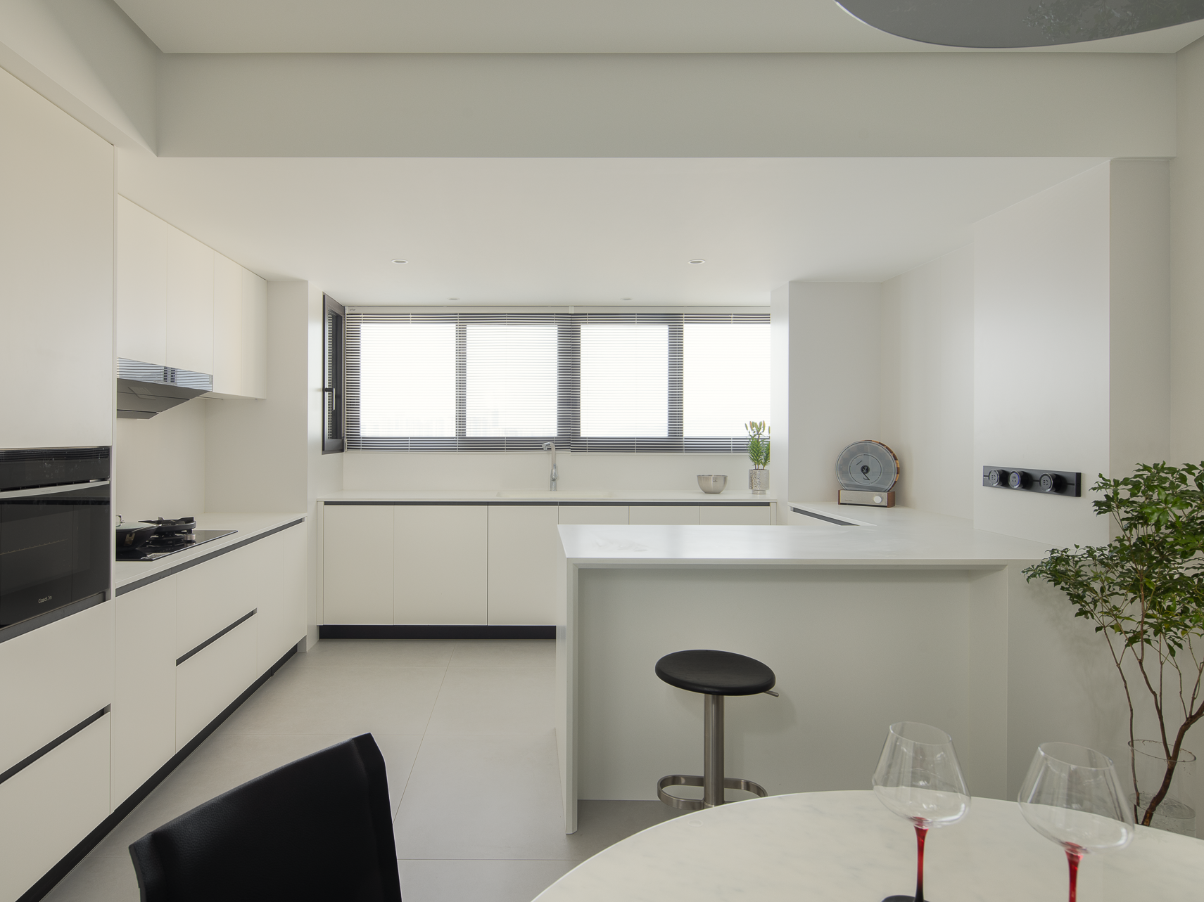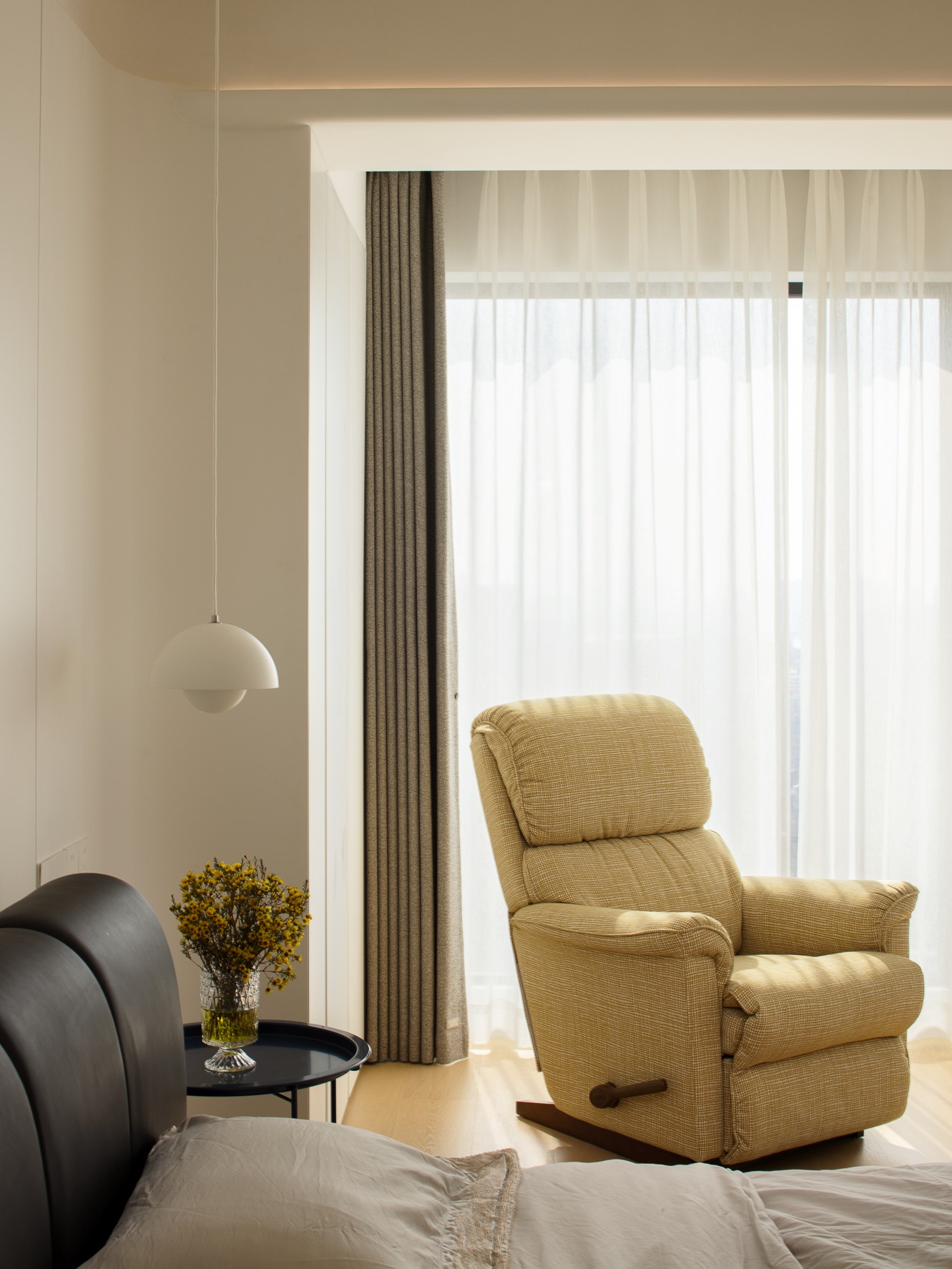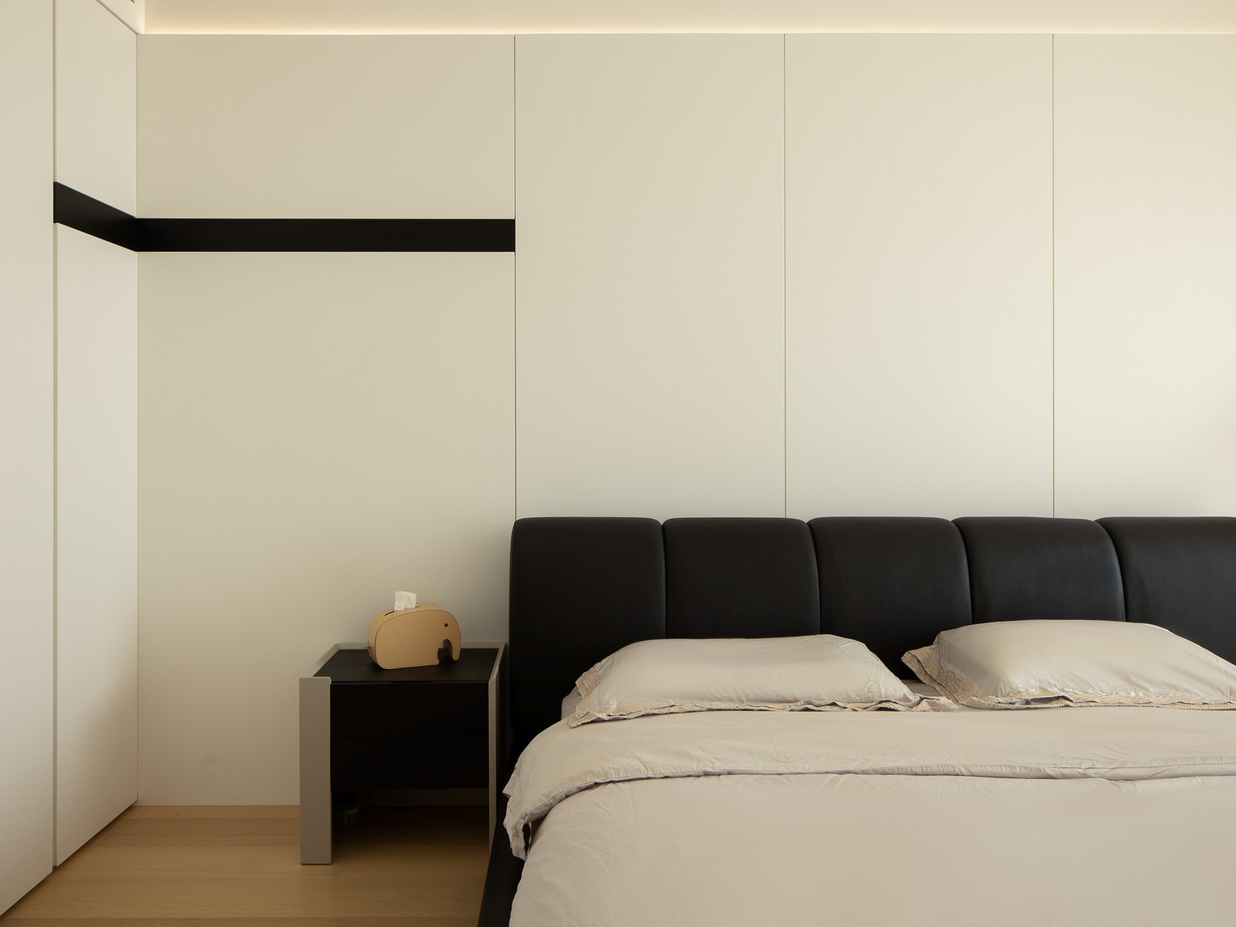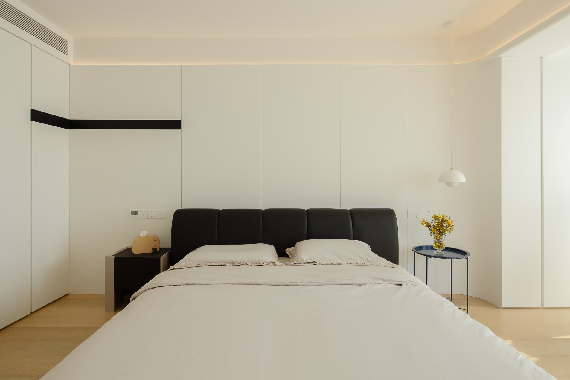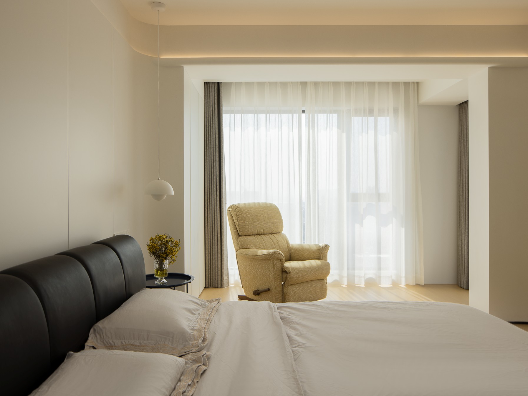 空间意境:公共区采用无主灯设计,磁吸轨道灯与隐藏灯带如星轨般勾勒空间轮廓,在黑白灰的基调中编织出光影的韵律学,通过材质对比与灯光层次传递高级感。洞石肌理与艺术漆墙面形成材质对话 —— 前者以地质年轮诉说自然史诗,后者以细腻肌理构建触觉维度,低饱和沙发如悬浮的几何体,绿植的翠意成为空间唯一的色谱变量,演绎 "极简主义" 的视觉净化法则。一日三餐承载的家庭温情,在这个快节奏的时代下,催生出对家人自然相聚空间的渴求,摒弃传统厨房的封闭边界,以开放式设计重构空间逻辑,实现餐厨一体。烹饪行为与餐厅互动自然交融,打破功能区隔的同时,让烟火气成为情感交流的媒介。日常备餐时的轻声细语,聚会时刻的温馨谈笑,都在这片空间里编织成连接家人的生活叙事,完美诠释现代居住美学中 “功能与情感共生” 的高阶理念。洞石台面与护墙板的材质呼应整体极简美学,让每一次烹饪都化作光影与烟火共舞的生活剧场,让厨房不再只是料理空间,更成为承载温情与故事的情感场域。主卧是光与体块共筑的静谧诗篇,当视线随空间游走,灯光沿顶面、墙面悄然流淌,不同角度的光影切割出体块层次 —— 床具的方正、沙发的圆润、柜体的隐于无形,在极简语境里完成功能与美学的和解。每一处留白、每一道光影,都是 “少即是多” 的具象诠释,让空间在纯粹的线条与克制的配色中,生长出安宁的呼吸感。当居者于此处休憩,无主灯的光晕将日常晕染成沉浸式的治愈剧场,让极简美学不仅是视觉符号,更成为触手可及的舒适哲学。