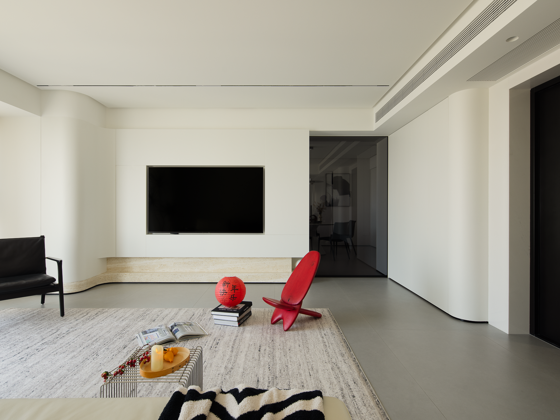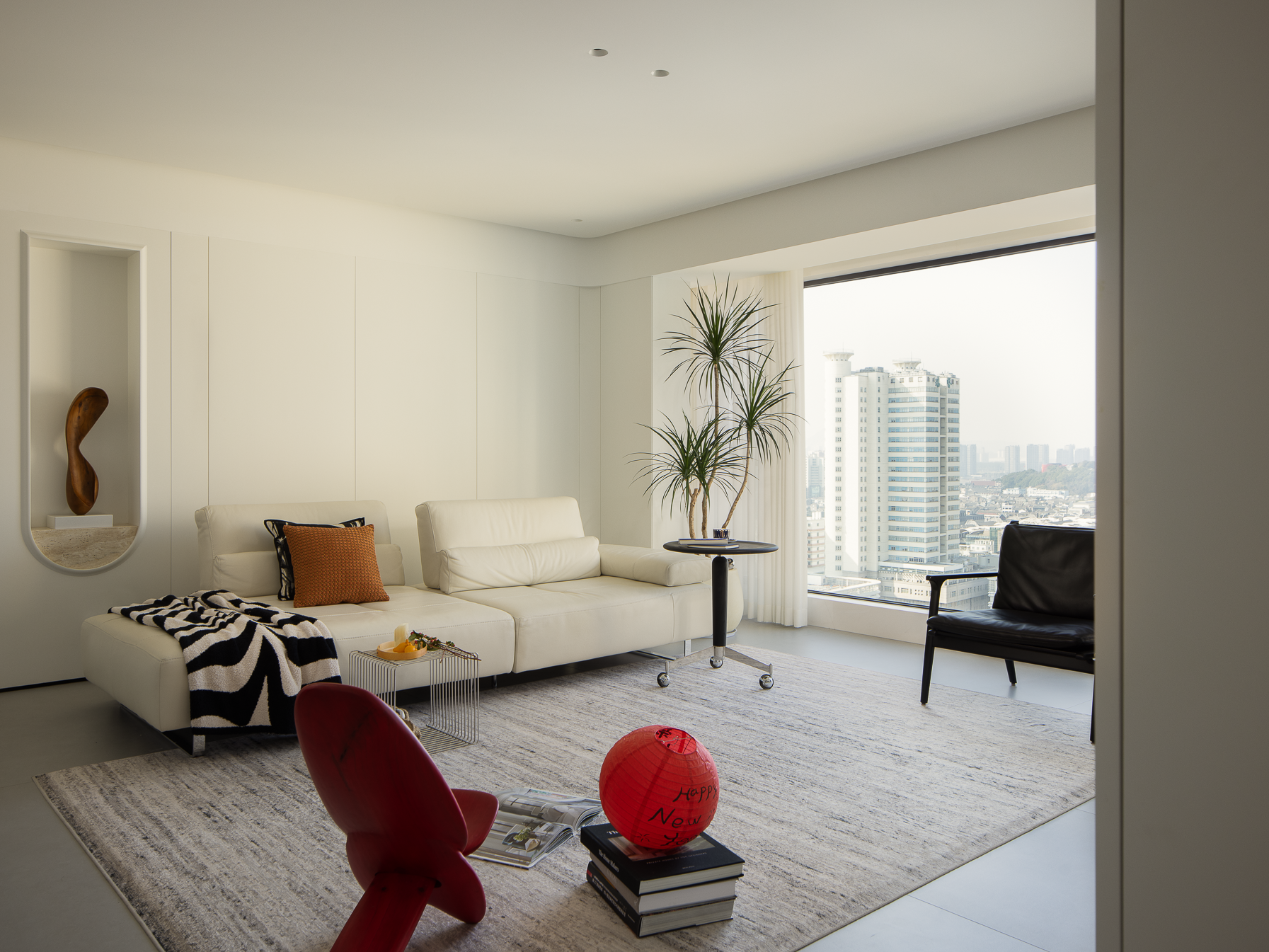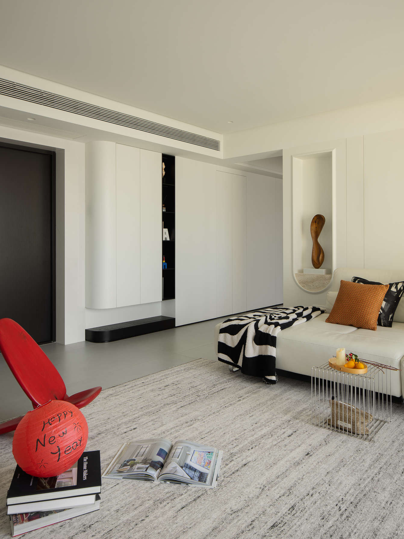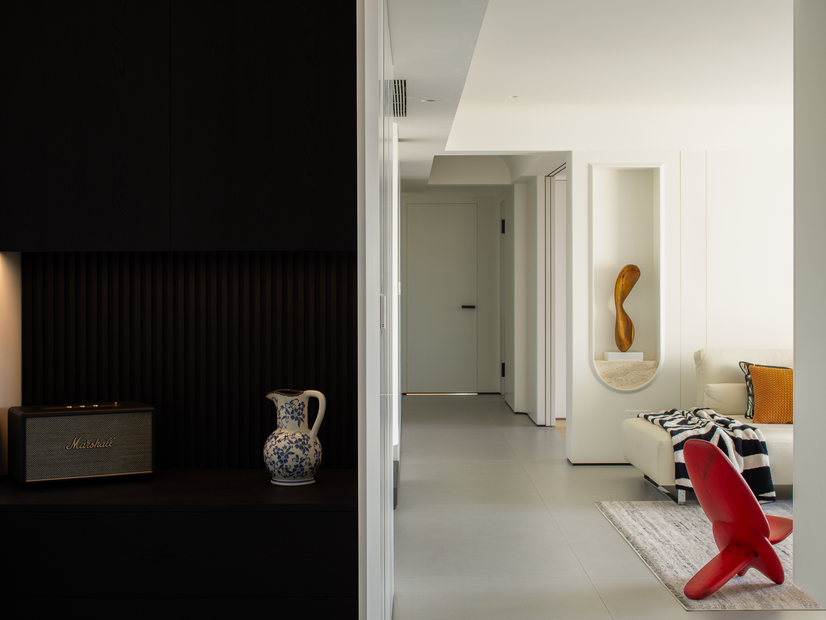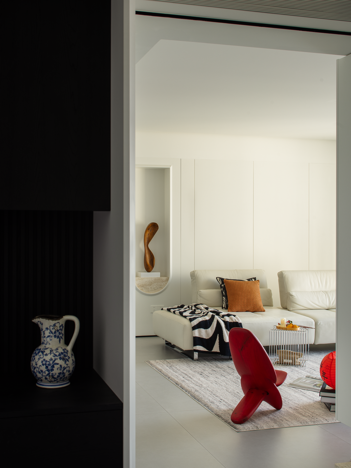 空间布局:玄关延伸处的黑色柜体,宛若一座沉默的 “生活博物馆”,蓝白花纹瓷器静立其上,传统东方美学基因,与现代极简语境碰撞,开启空间对话的序章。客厅的光影与陈设渐次铺展,红与黑的家具色块、柔软的织物纹理,在视线穿梭间,完成功能区的接驳。行至过道纵深,纯白墙体构筑起 “光的容器”。嵌入式壁龛如精心留白的画框,金色雕塑以流动线条打破墙面的静态,成为空间的视觉锚点。