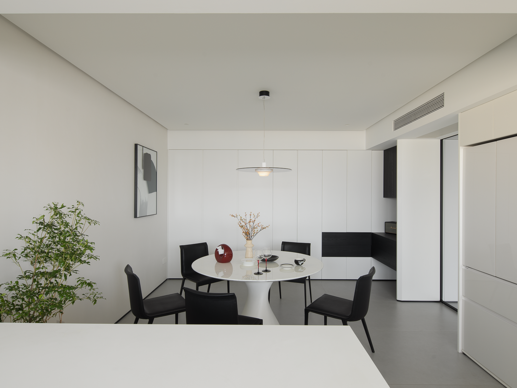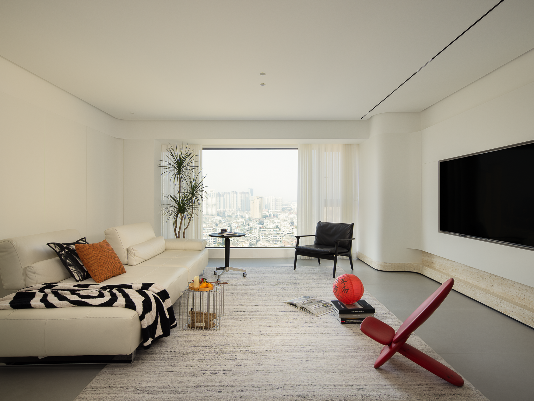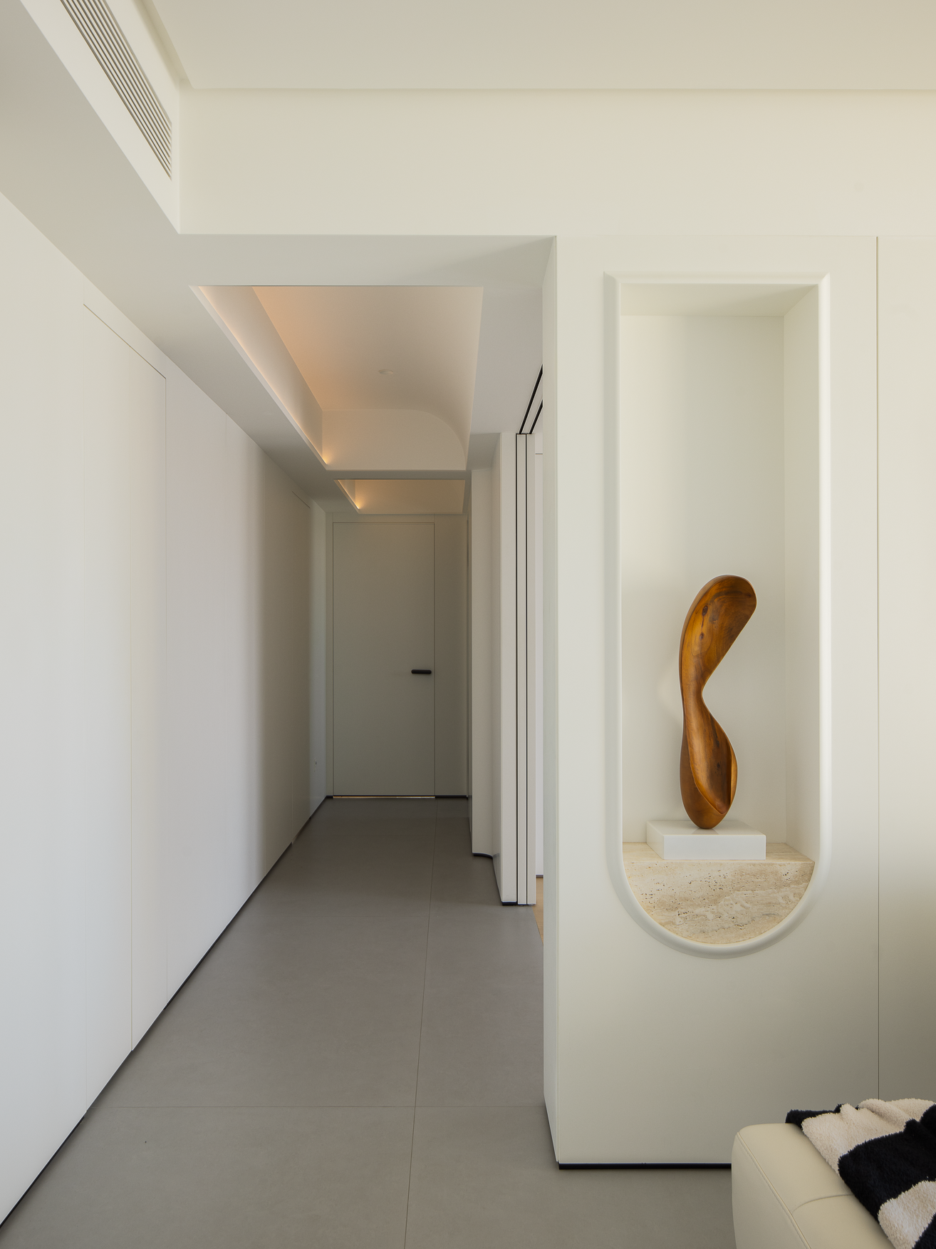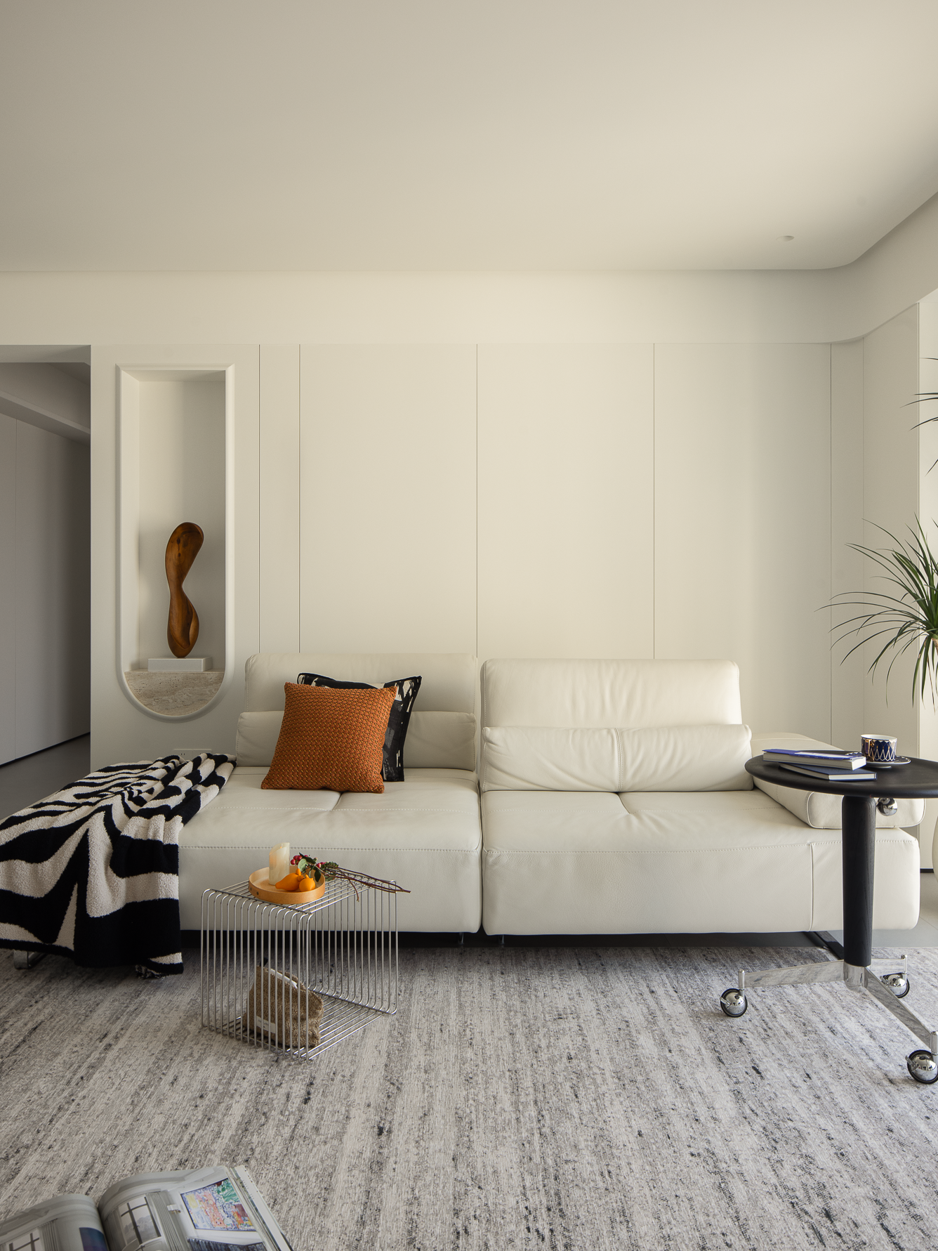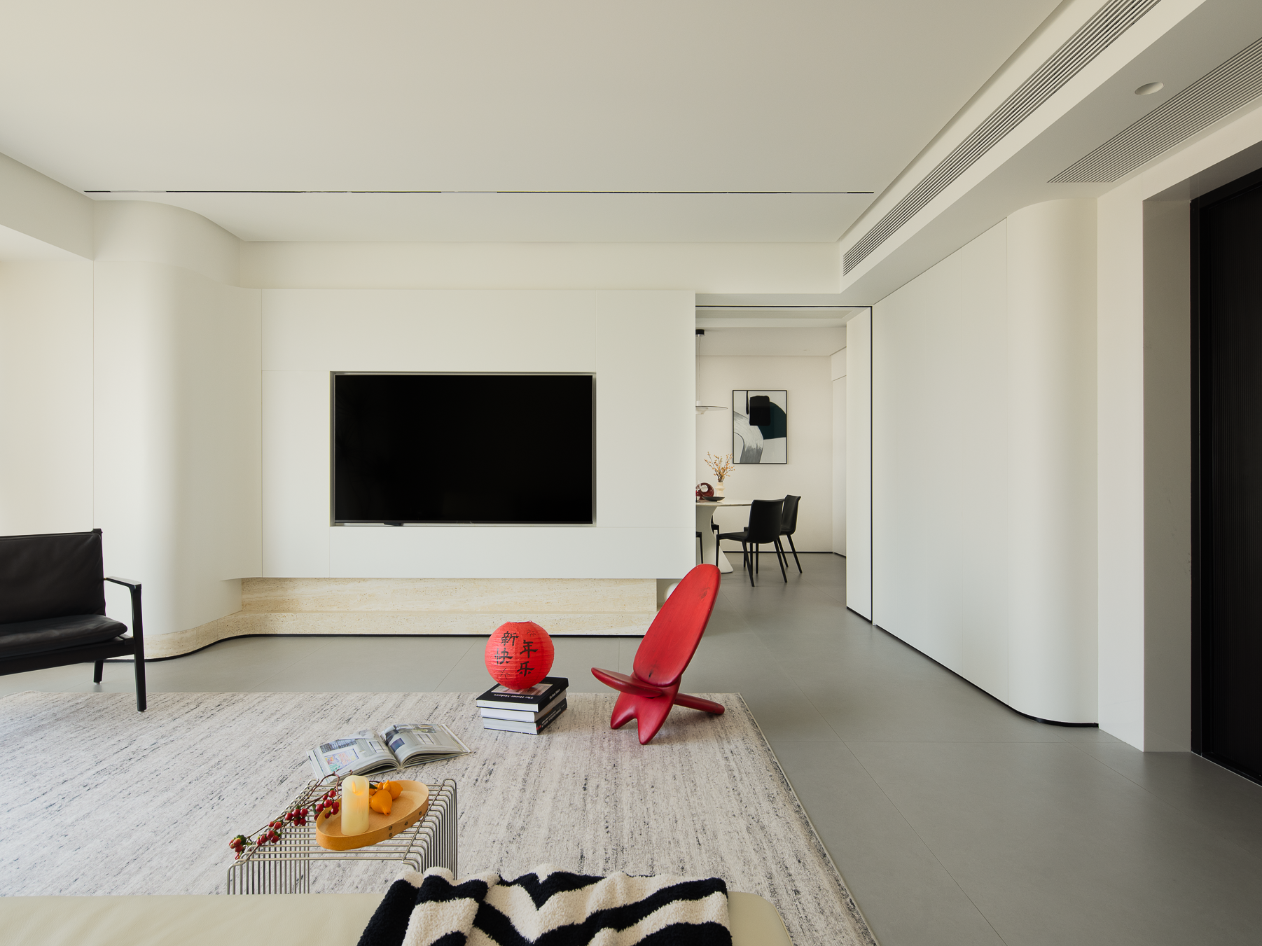 空间布局:玄关延伸处的黑色柜体,宛若一座沉默的 “生活博物馆”,蓝白花纹瓷器静立其上,传统东方美学基因,与现代极简语境碰撞,开启空间对话的序章。客厅的光影与陈设渐次铺展,红与黑的家具色块、柔软的织物纹理,在视线穿梭间,完成功能区的接驳。行至过道纵深,纯白墙体构筑起 “光的容器”。嵌入式壁龛如精心留白的画框,金色雕塑以流动线条打破墙面的静态,成为空间的视觉锚点。