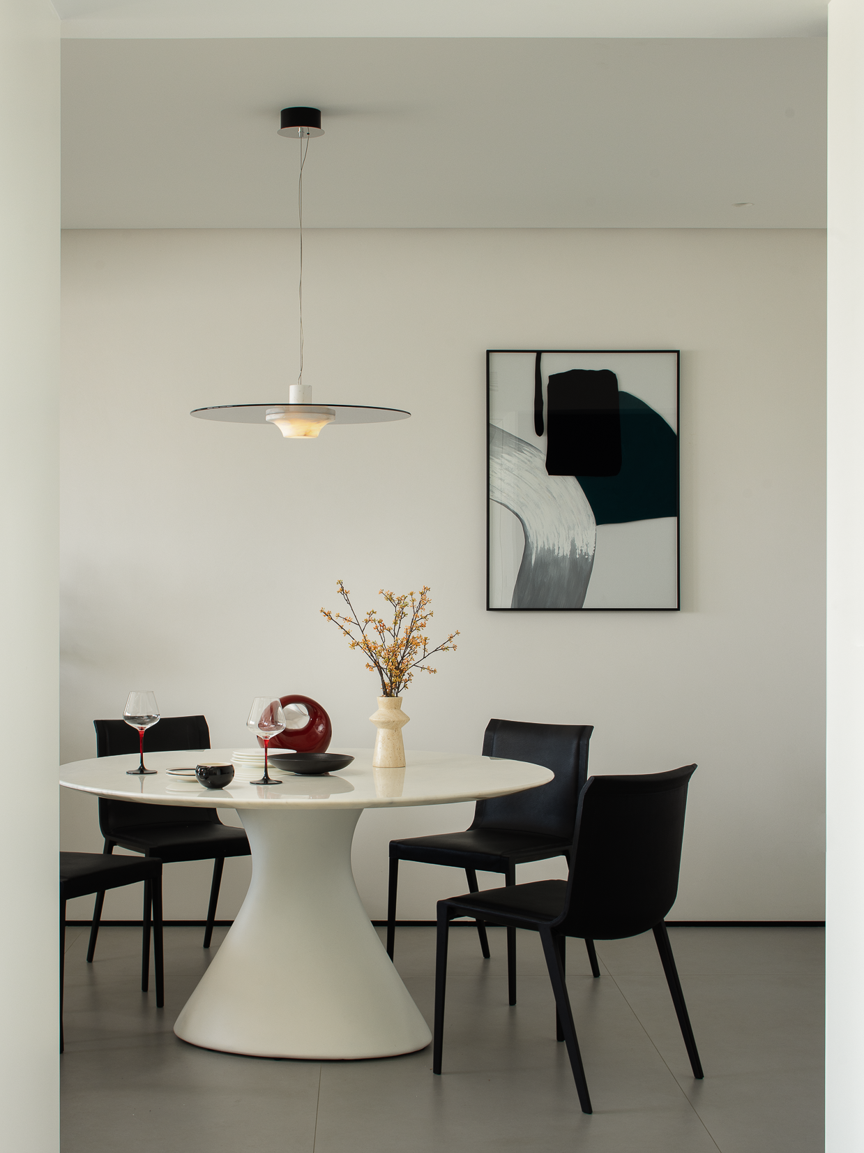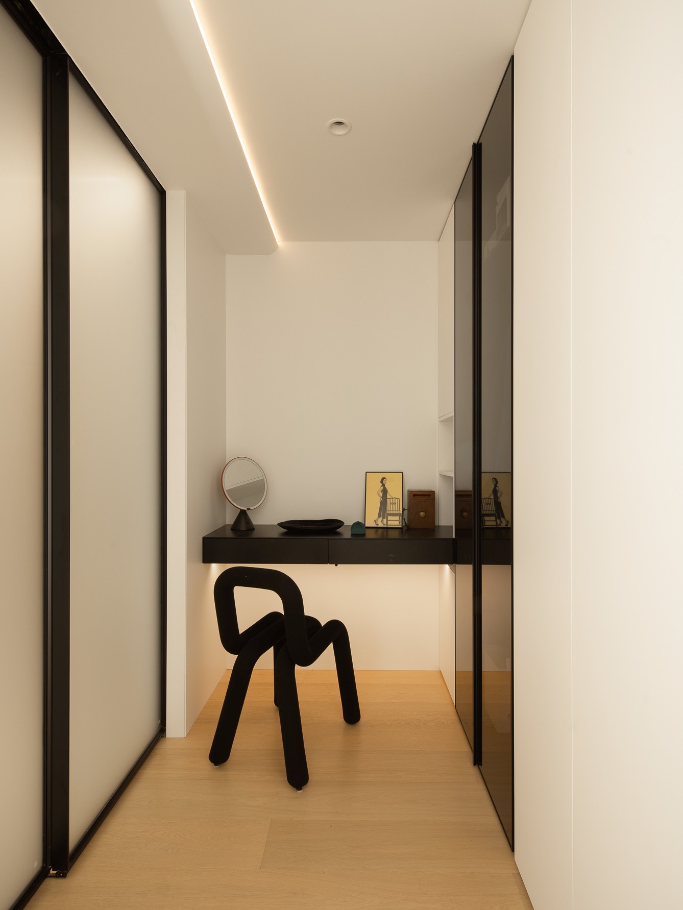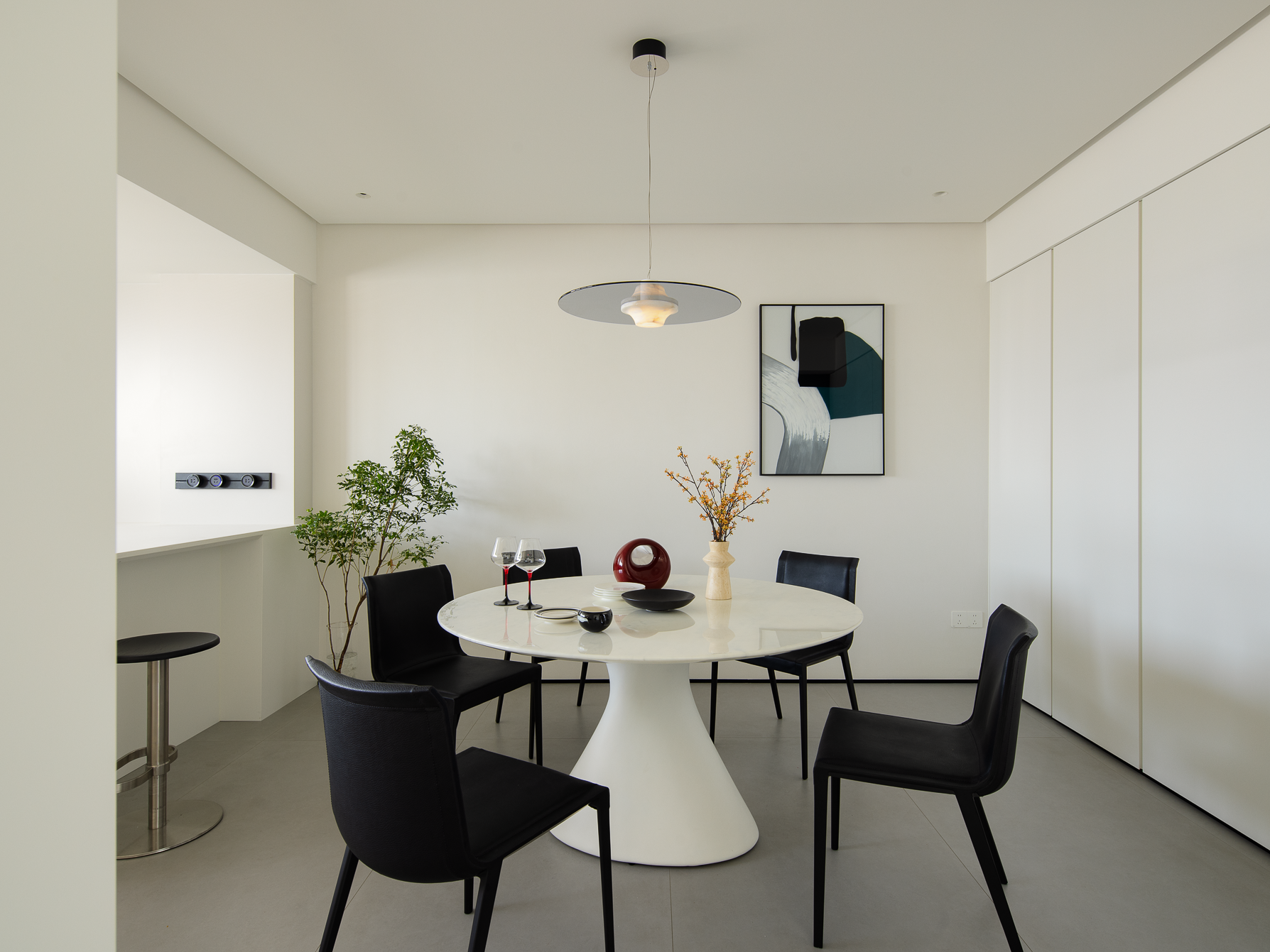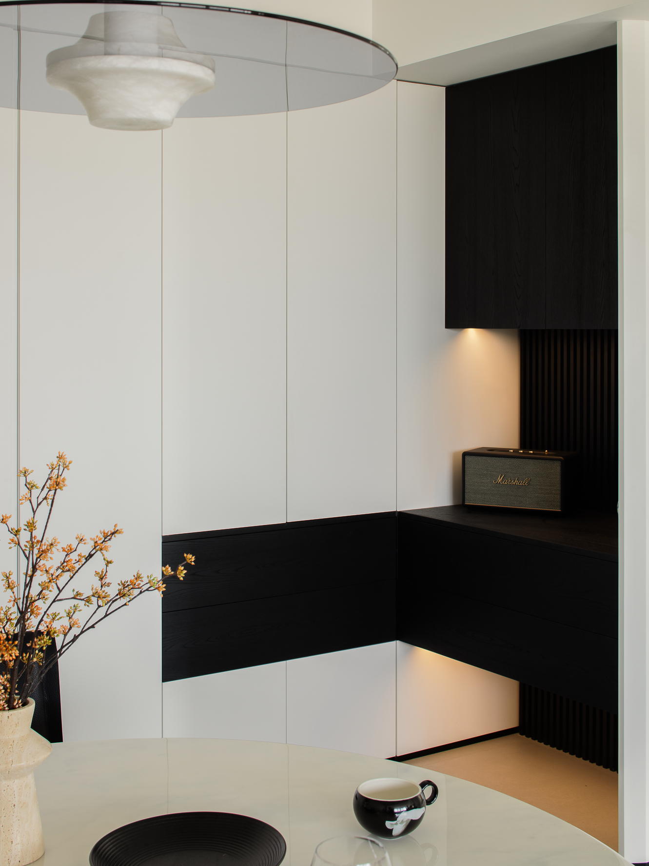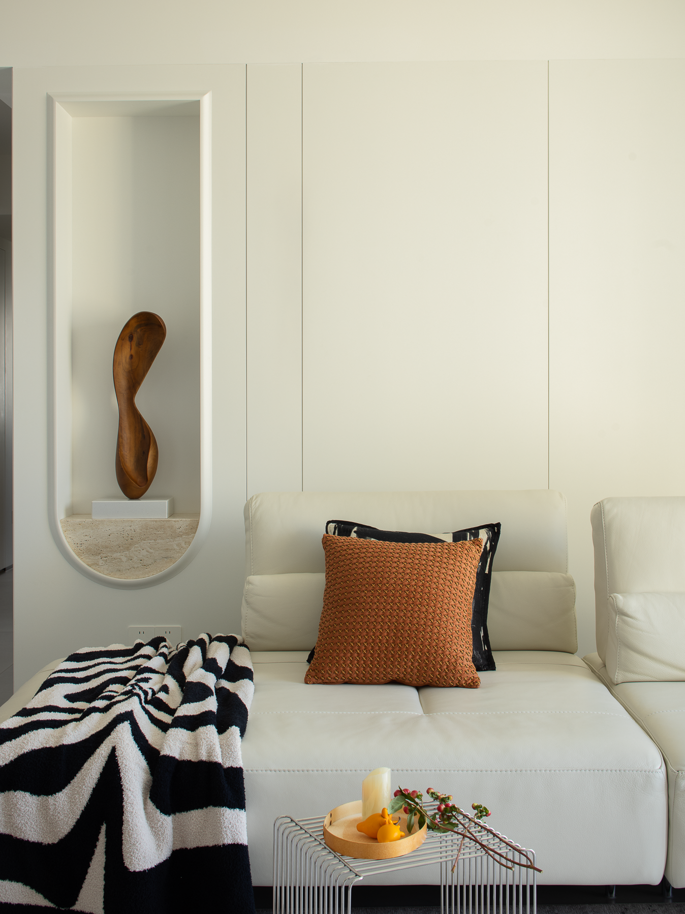 空间布局:玄关延伸处的黑色柜体,宛若一座沉默的 “生活博物馆”,蓝白花纹瓷器静立其上,传统东方美学基因,与现代极简语境碰撞,开启空间对话的序章。客厅的光影与陈设渐次铺展,红与黑的家具色块、柔软的织物纹理,在视线穿梭间,完成功能区的接驳。行至过道纵深,纯白墙体构筑起 “光的容器”。嵌入式壁龛如精心留白的画框,金色雕塑以流动线条打破墙面的静态,成为空间的视觉锚点。