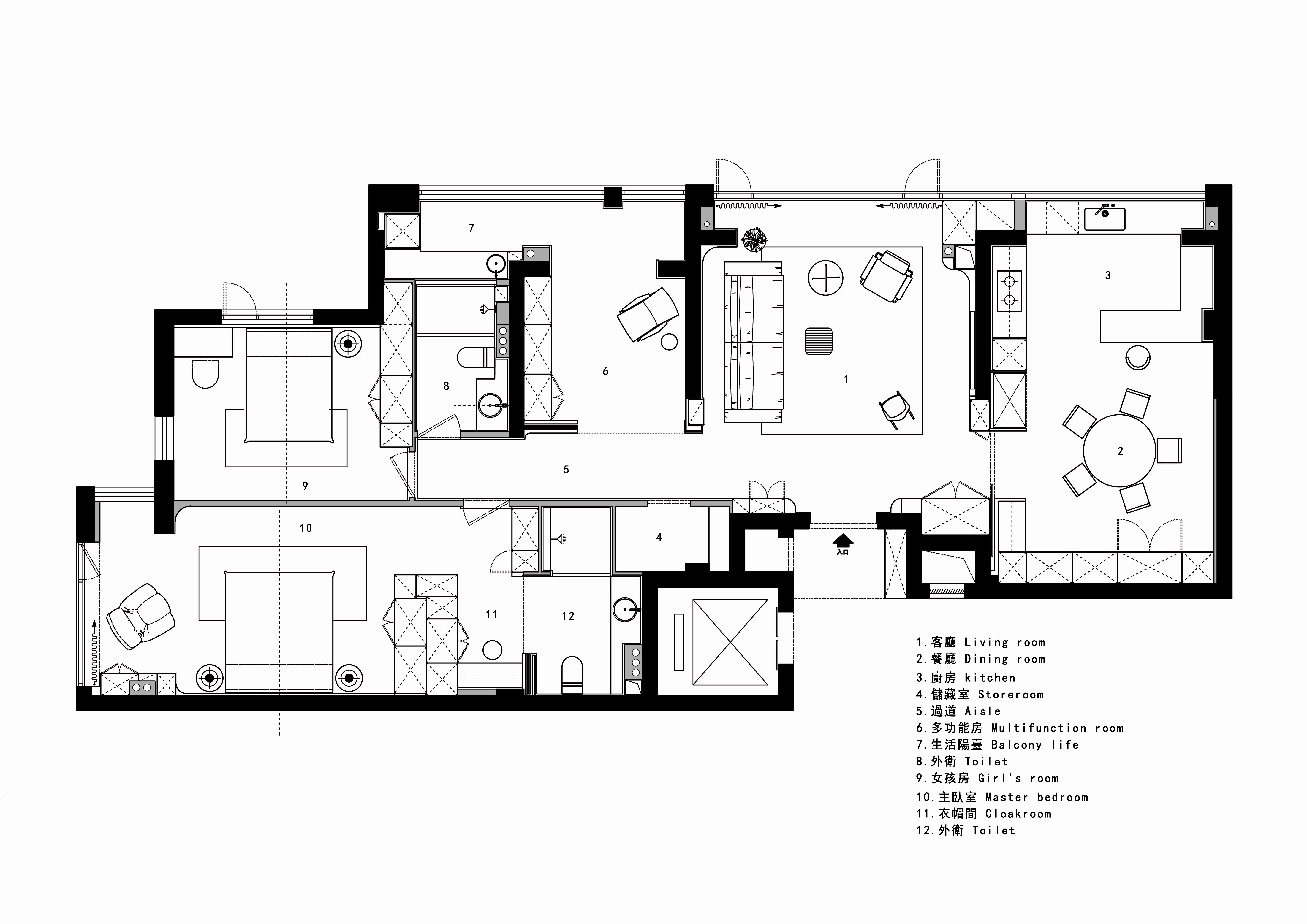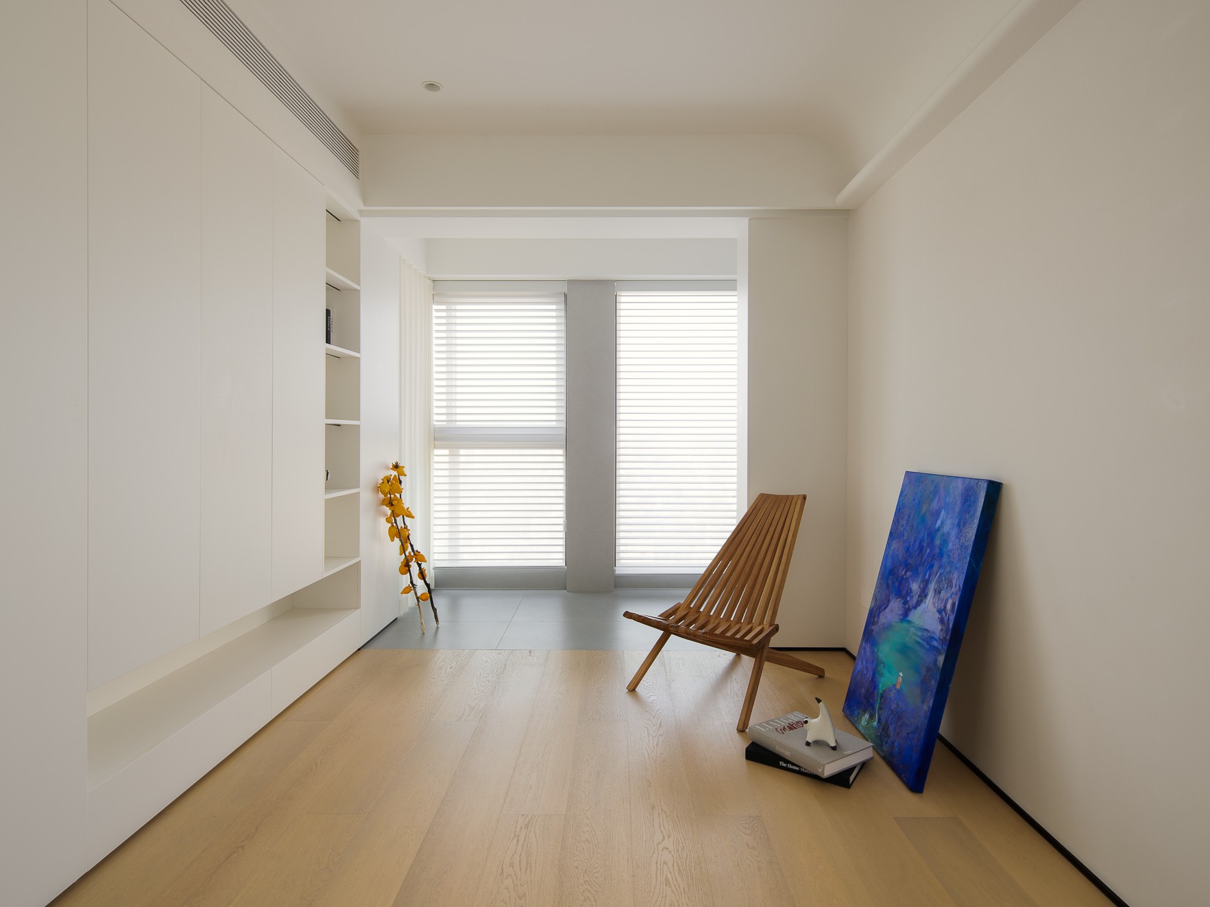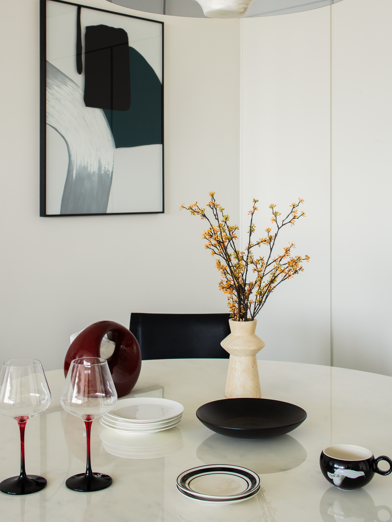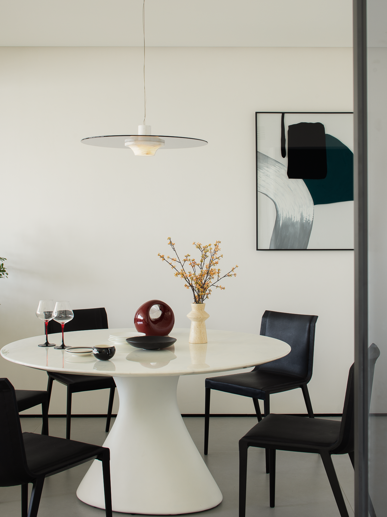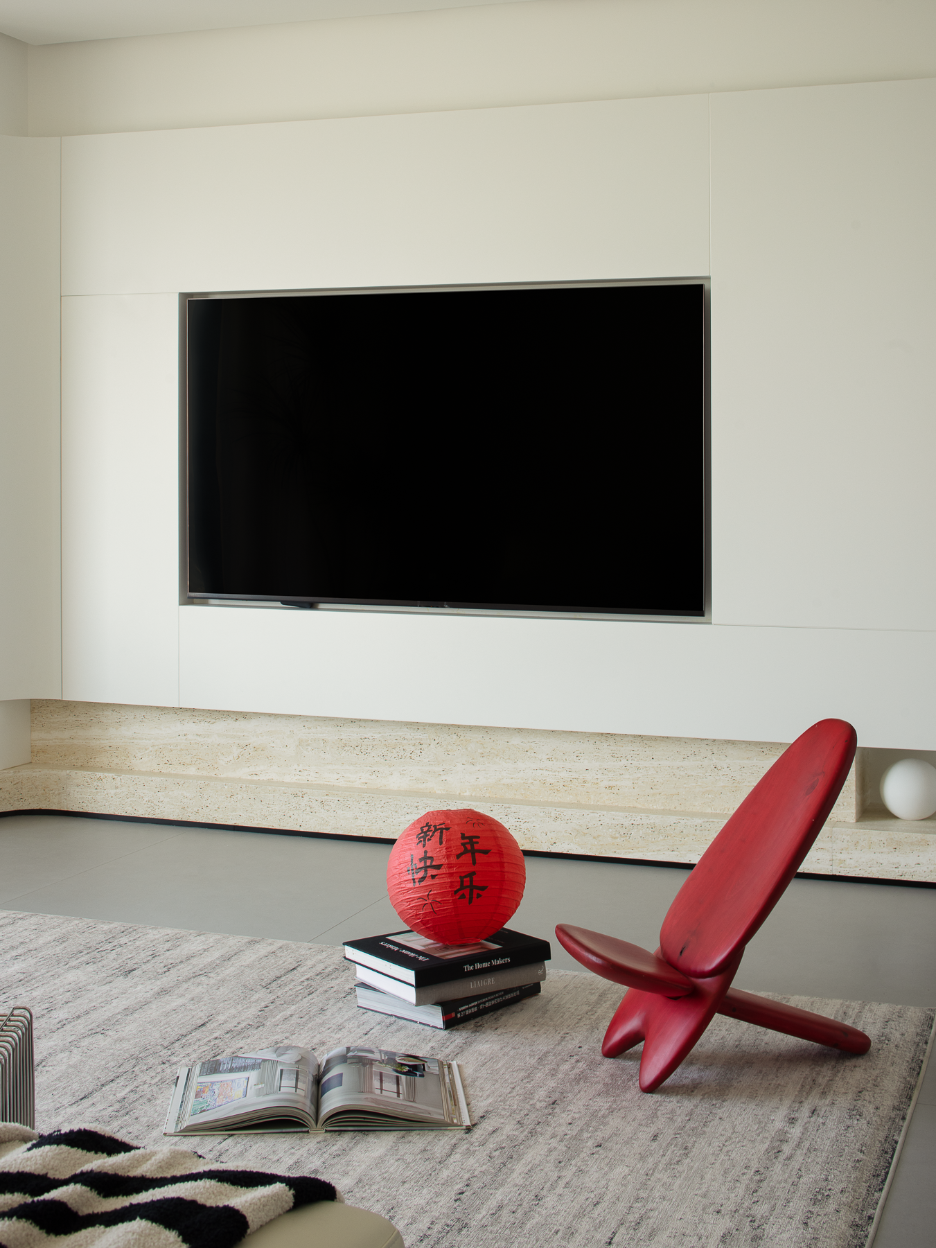 空间布局:玄关延伸处的黑色柜体,宛若一座沉默的 “生活博物馆”,蓝白花纹瓷器静立其上,传统东方美学基因,与现代极简语境碰撞,开启空间对话的序章。客厅的光影与陈设渐次铺展,红与黑的家具色块、柔软的织物纹理,在视线穿梭间,完成功能区的接驳。行至过道纵深,纯白墙体构筑起 “光的容器”。嵌入式壁龛如精心留白的画框,金色雕塑以流动线条打破墙面的静态,成为空间的视觉锚点。