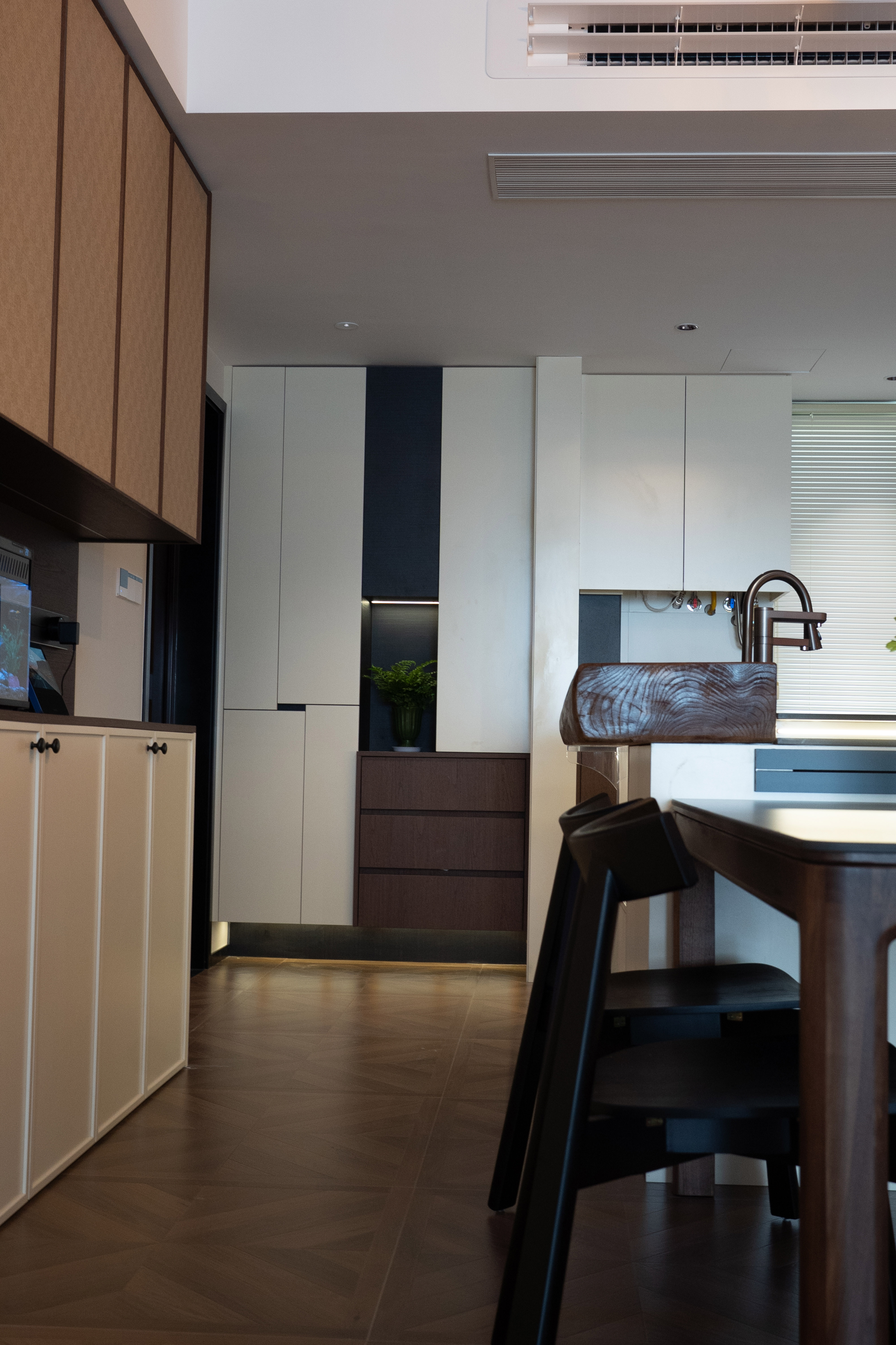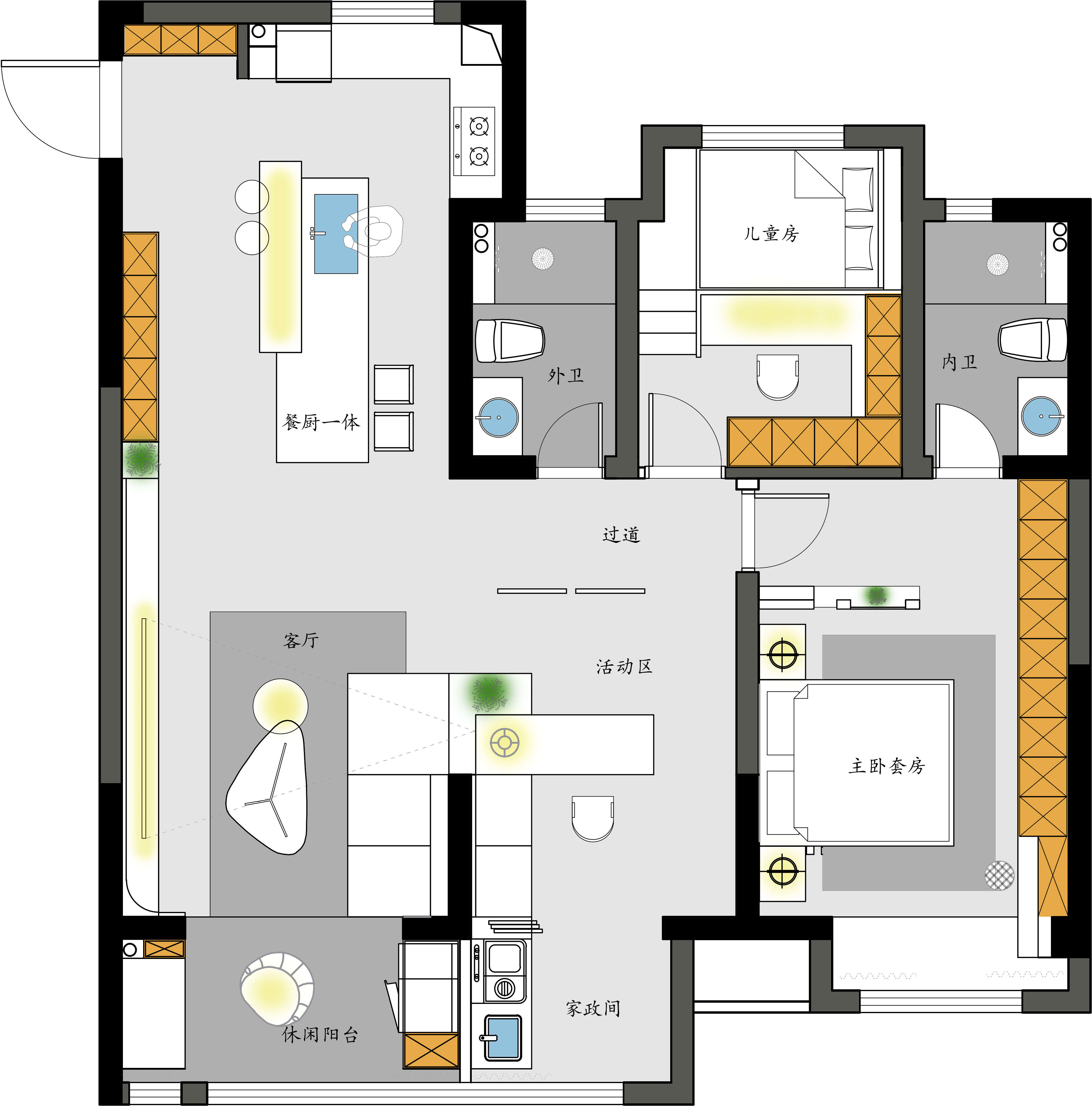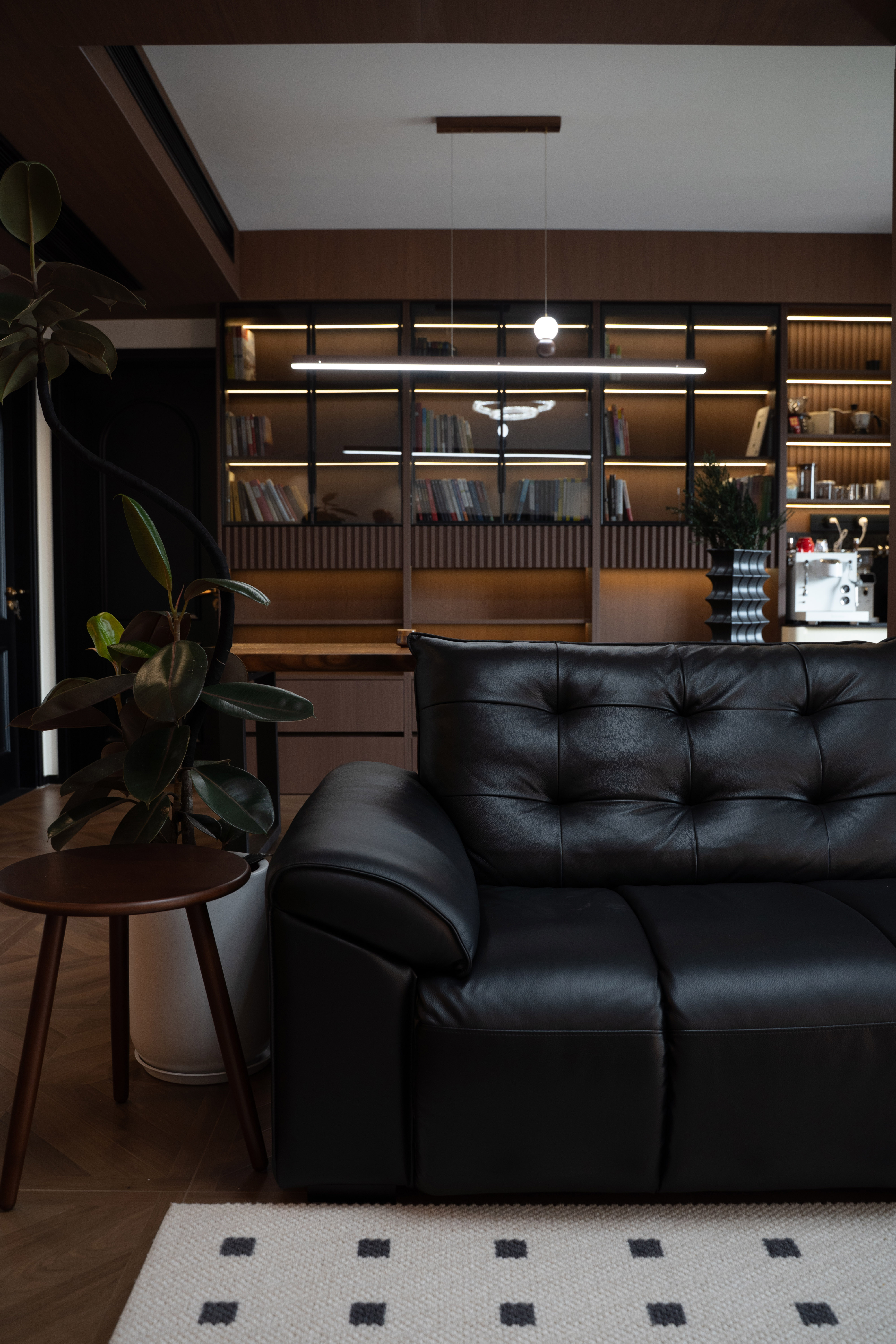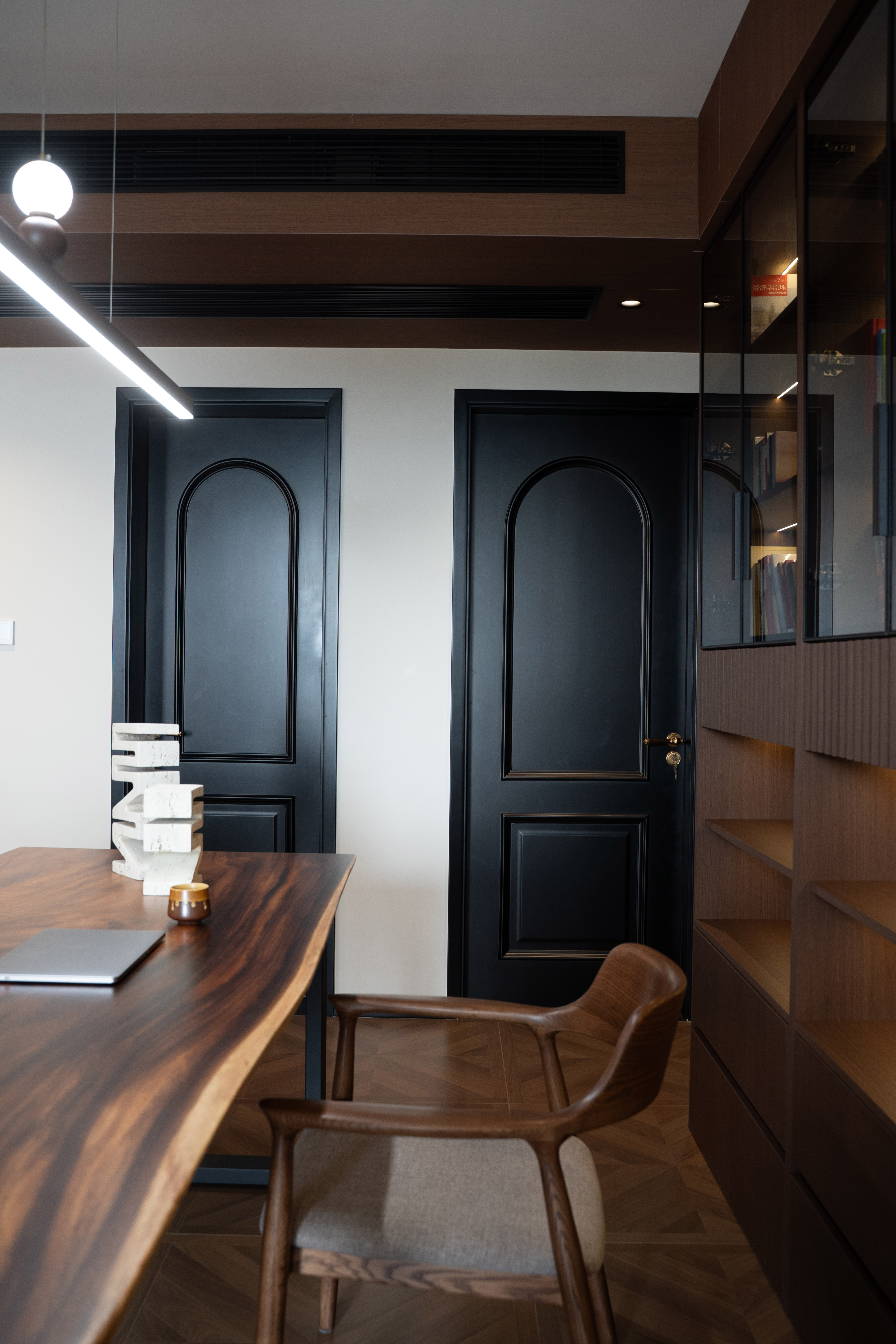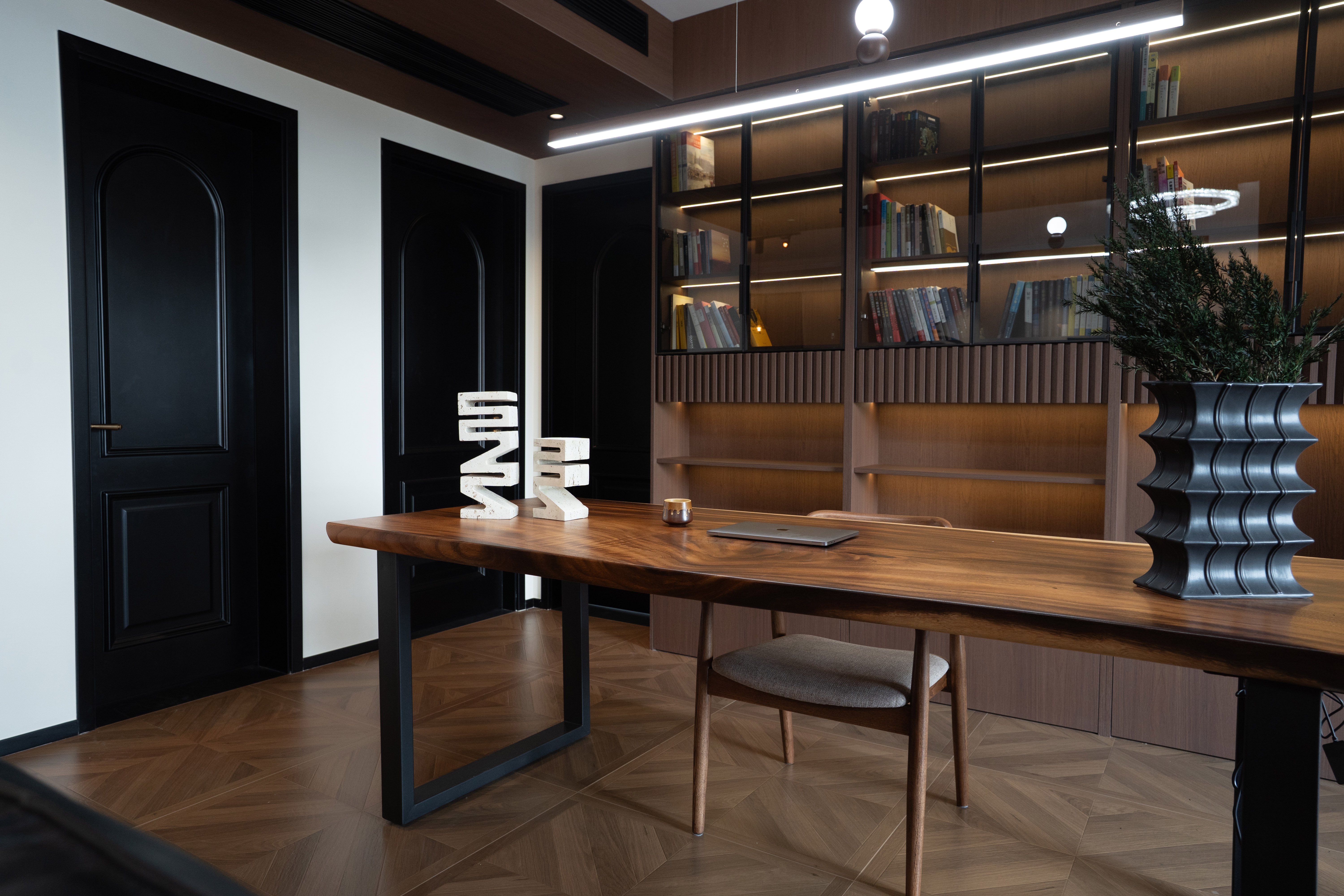 公区设计:打破传统客厅中心,以环岛式书房或艺术水吧为核心,串联起居、阅读、社交功能,形成开放流动的“家庭沙龙”。 -